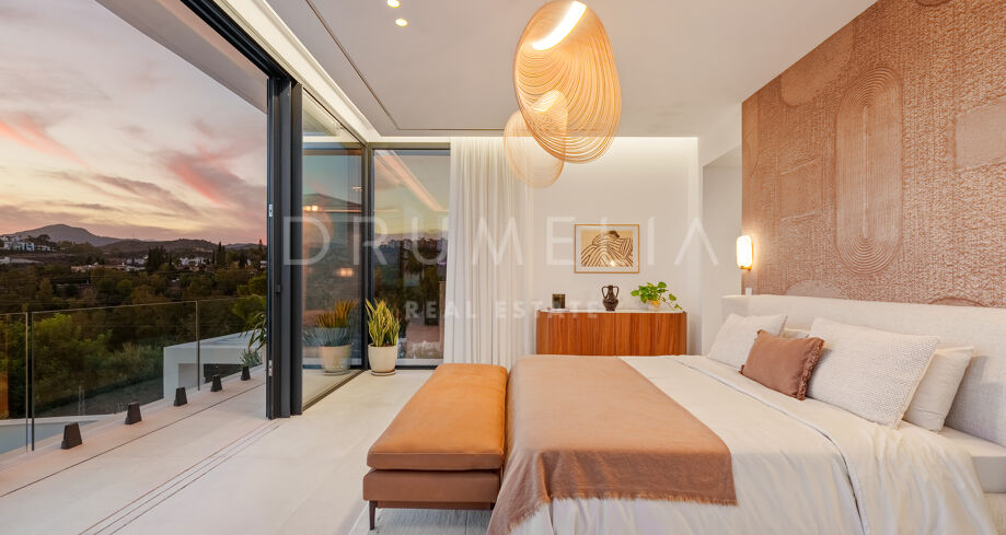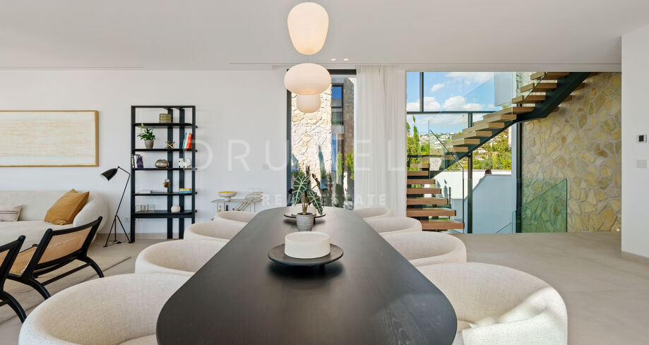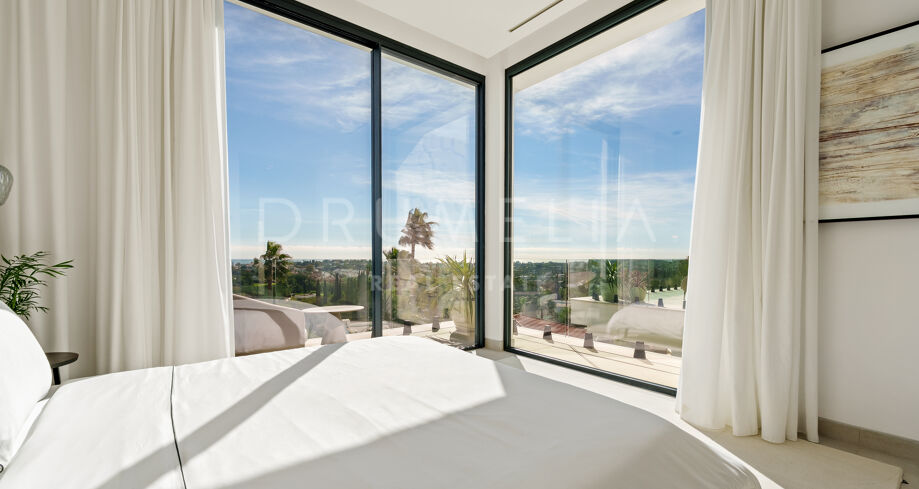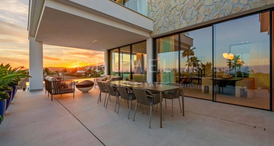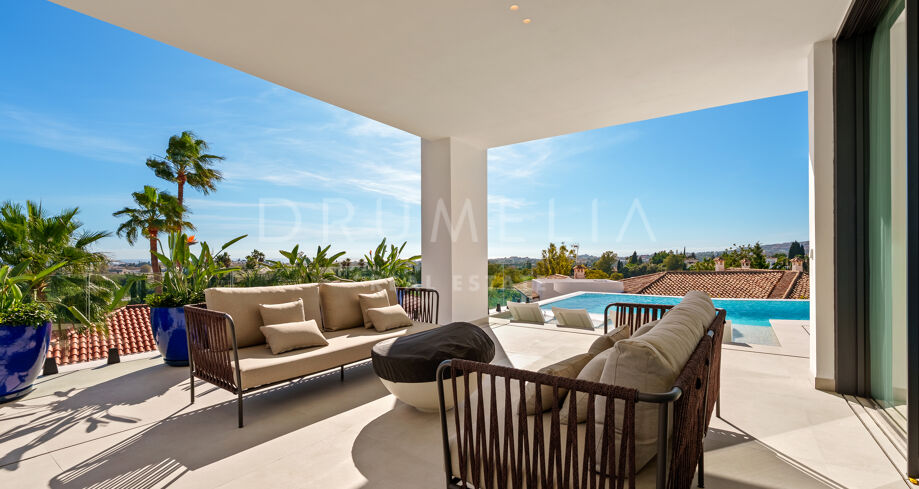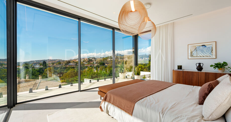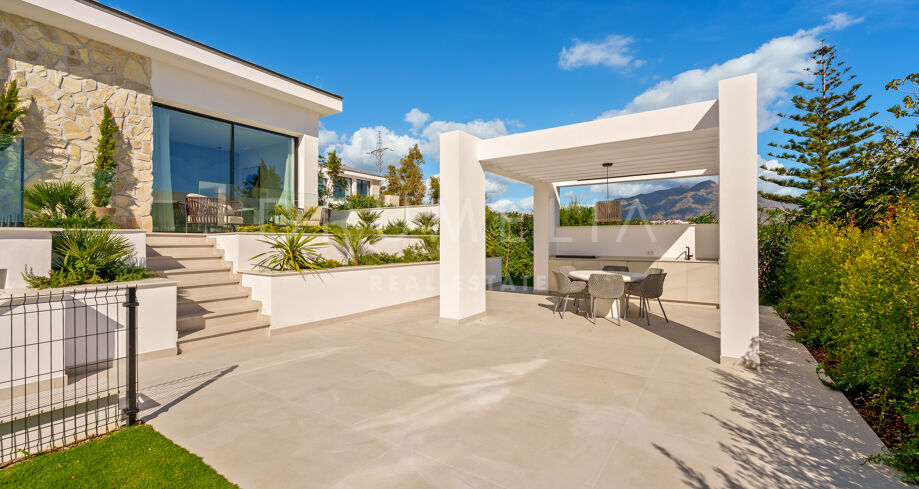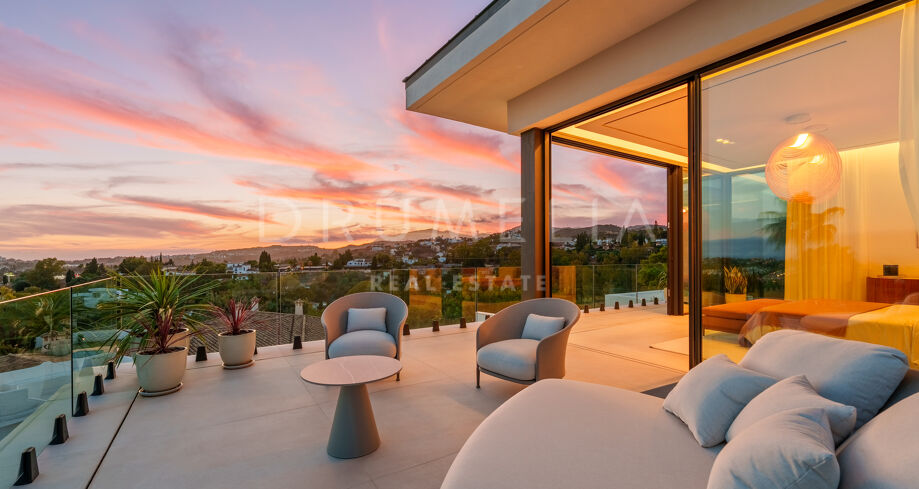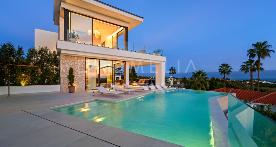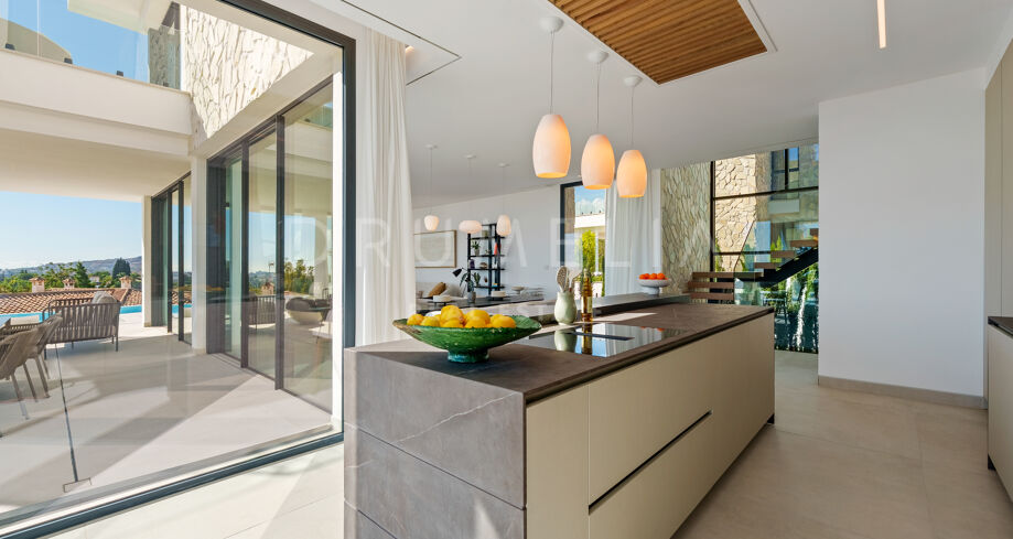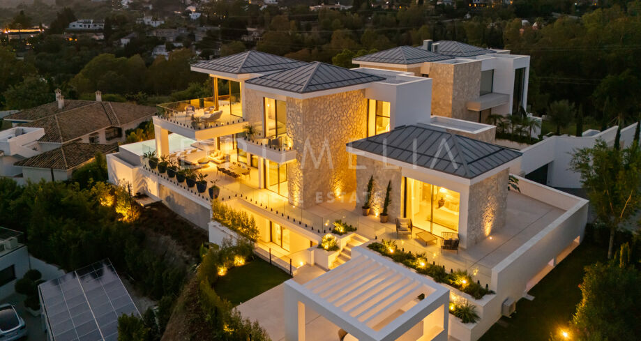 Diese zeitgenössische Villa in La Quinta, Benahavís, liegt zwischen dem Mittelmeer und dem La-Concha-Berg und bietet einen Panoramablick über das Golf Valley und die Küste. Die Lage bietet Privatsphäre, Ruhe und unmittelbaren Zugang zu Golfplätzen wie dem La Quinta Golf & Country Club, Los Naranjos und Los Arqueros, während Puerto Banús und Puente Romano nur eine kurze Fahrt entfernt sind.