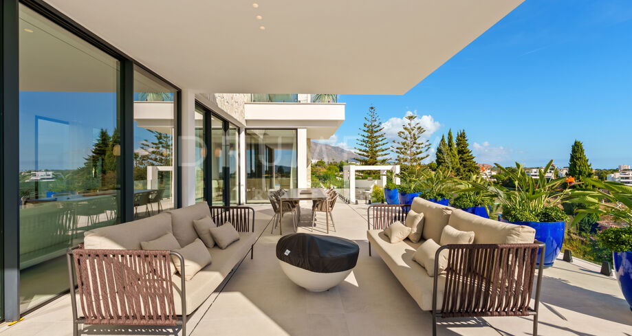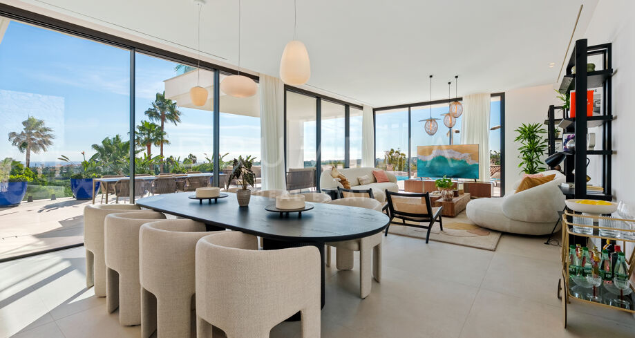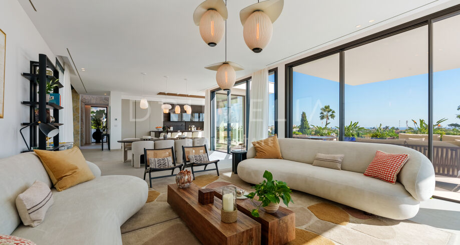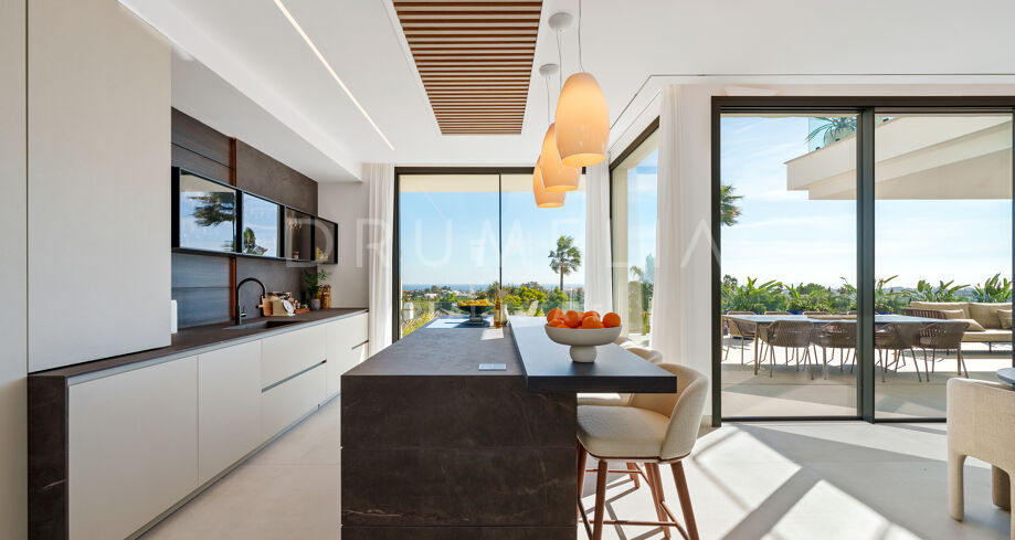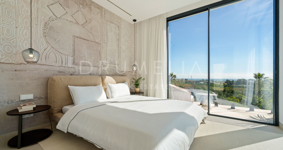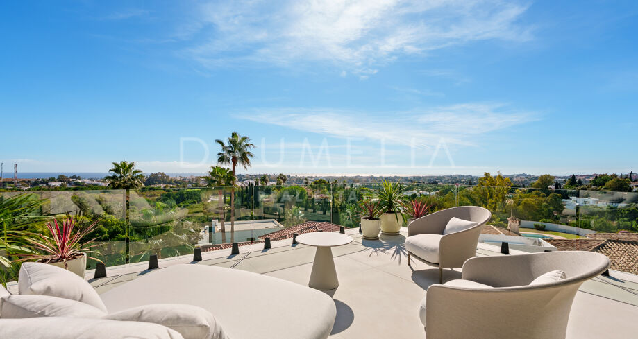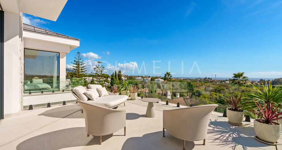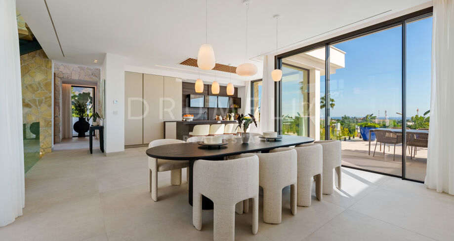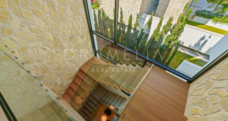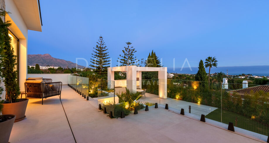 Diese zeitgenössische Villa in La Quinta, Benahavís, liegt zwischen dem Mittelmeer und dem La-Concha-Berg und bietet einen Panoramablick über das Golf Valley und die Küste. Die Lage bietet Privatsphäre, Ruhe und unmittelbaren Zugang zu Golfplätzen wie dem La Quinta Golf & Country Club, Los Naranjos und Los Arqueros, während Puerto Banús und Puente Romano nur eine kurze Fahrt entfernt sind.