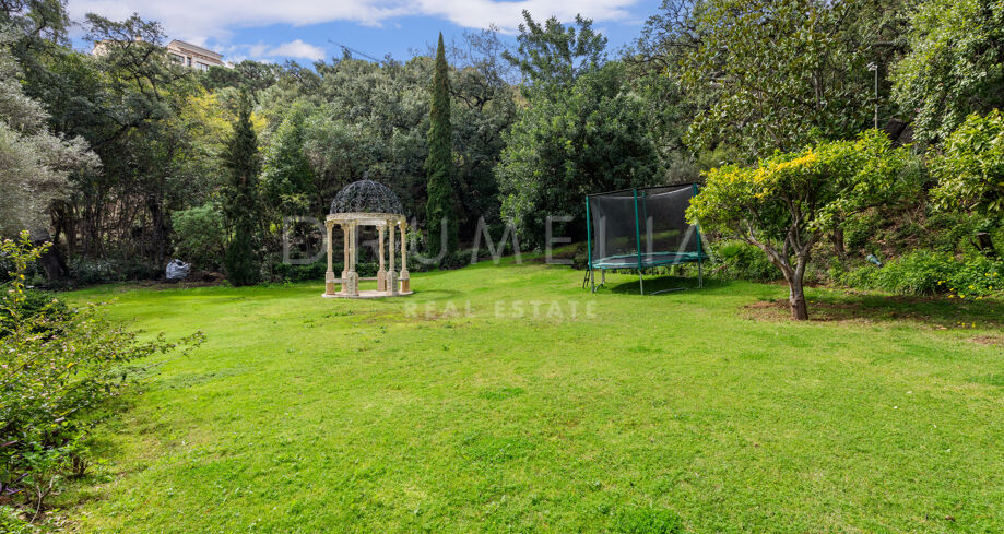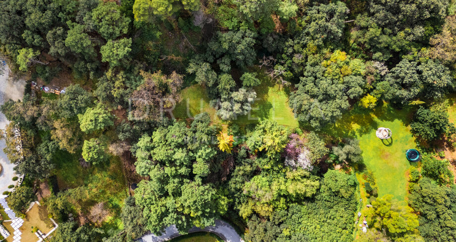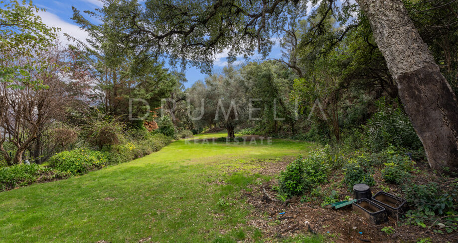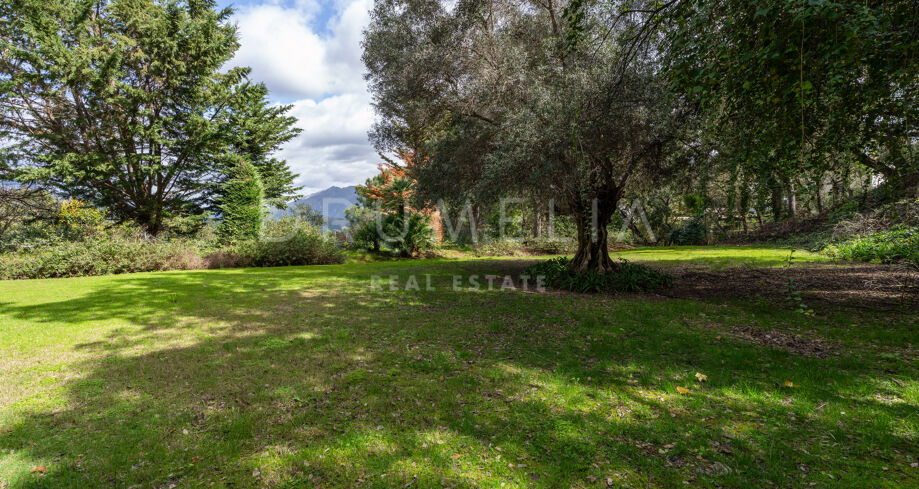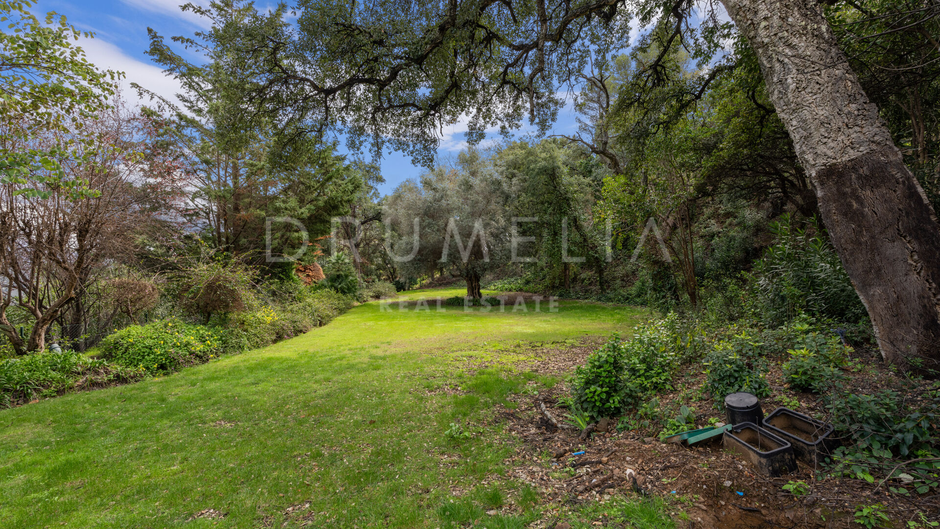 Umgeben von gewachsenem mediterranem Wald genießt das Grundstück eine ruhige natürliche Umgebung mit einem hohen Maß an Privatsphäre. Großzügige Grünflächen und alte Baumbestände schaffen eine parkähnliche Atmosphäre, während offene Bereiche Platz für gestaltete Gärten und Außenbereiche bieten. Ein dekorativer Gartenpavillon und weitläufige Rasenflächen unterstreichen die Größe des Grundstücks und sein Potenzial.