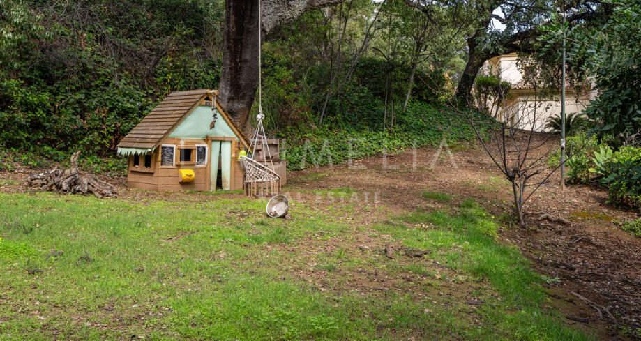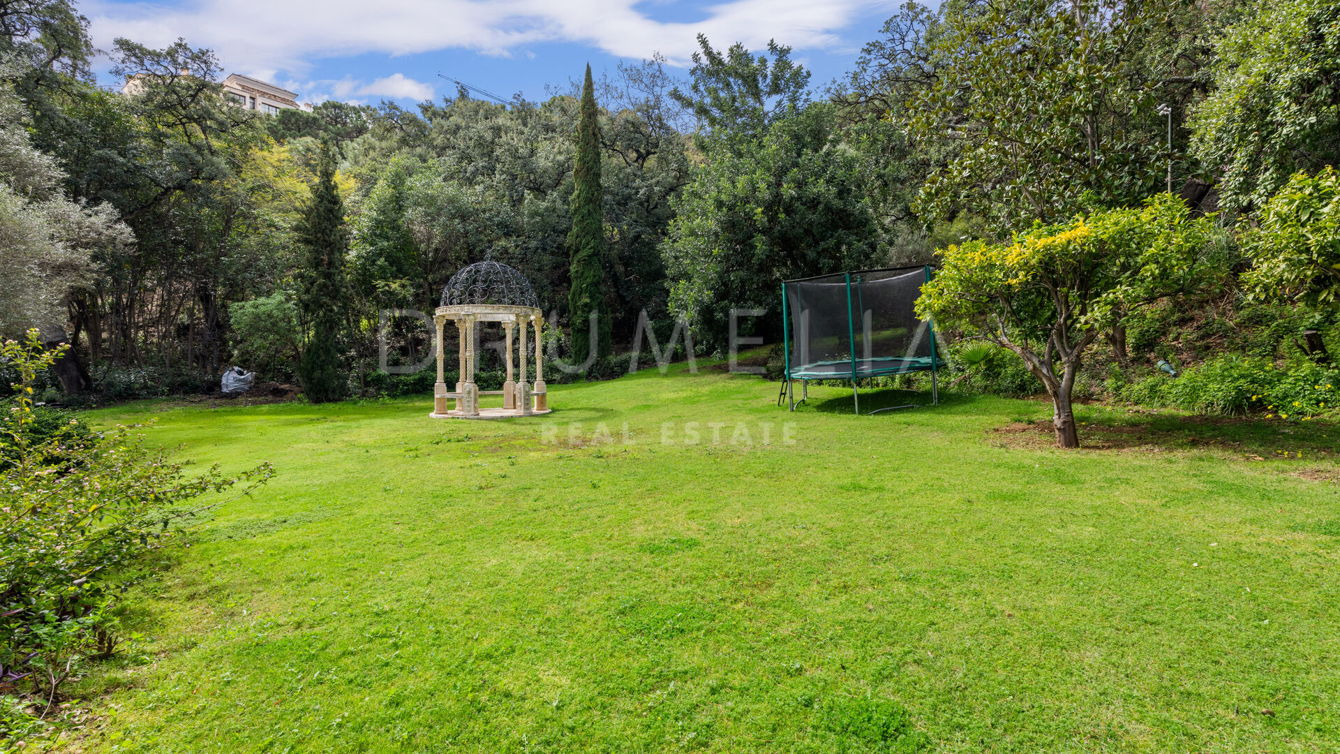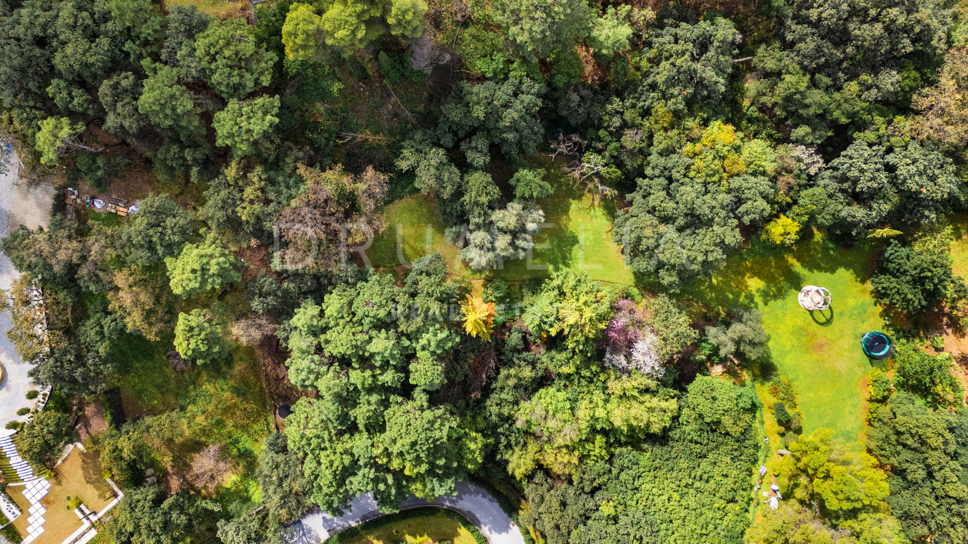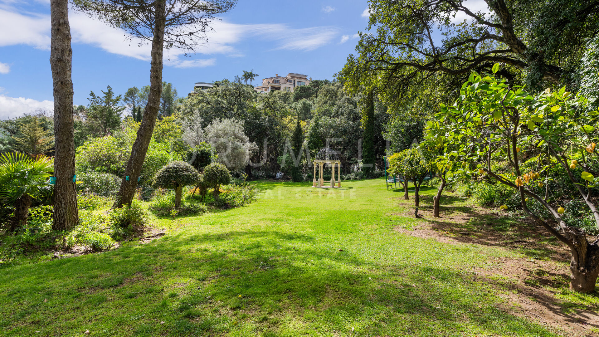 Umgeben von gewachsenem mediterranem Wald genießt das Grundstück eine ruhige natürliche Umgebung mit einem hohen Maß an Privatsphäre. Großzügige Grünflächen und alte Baumbestände schaffen eine parkähnliche Atmosphäre, während offene Bereiche Platz für gestaltete Gärten und Außenbereiche bieten. Ein dekorativer Gartenpavillon und weitläufige Rasenflächen unterstreichen die Größe des Grundstücks und sein Potenzial.