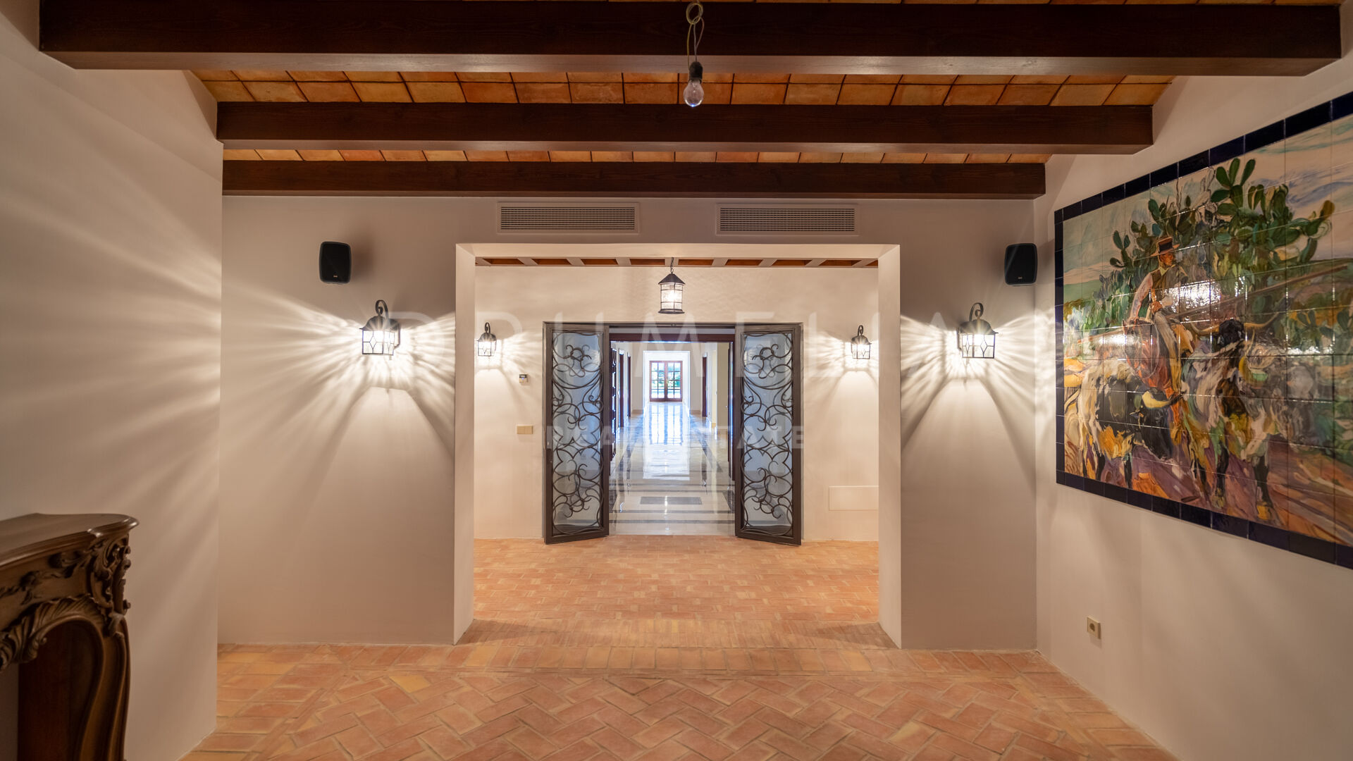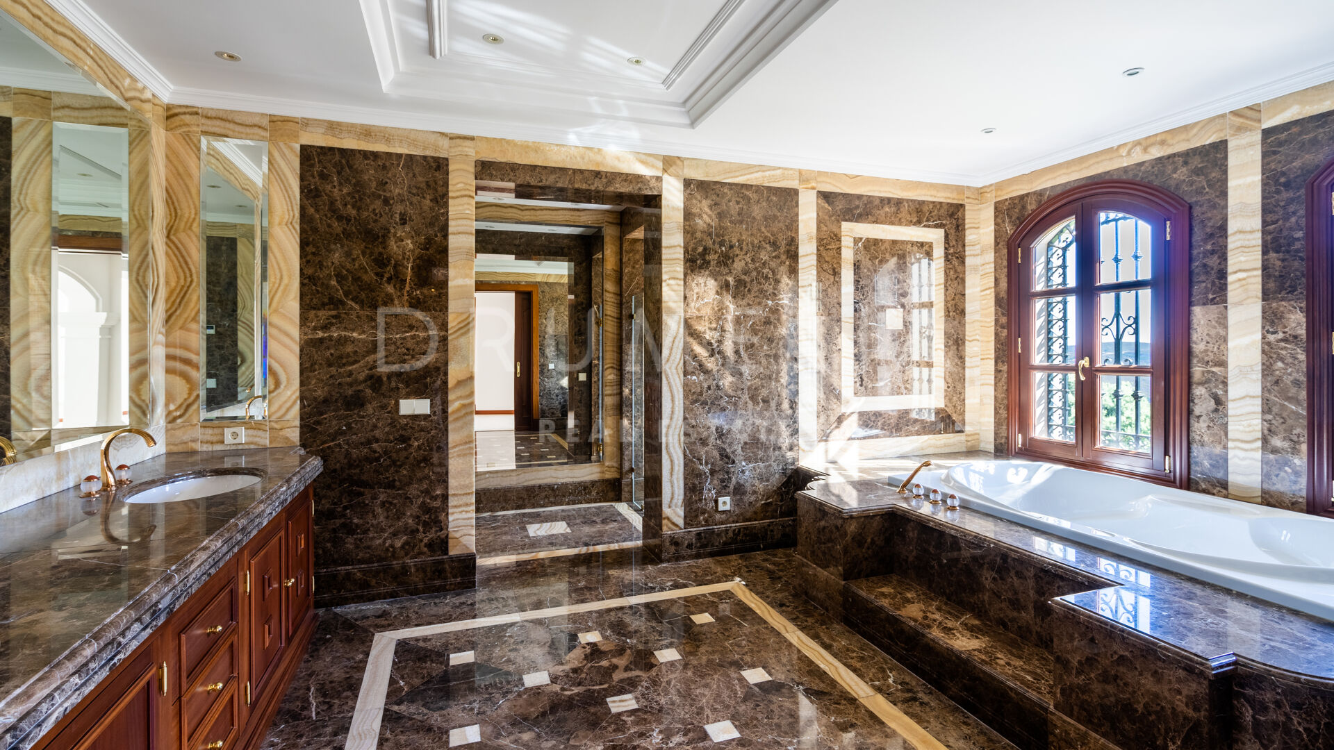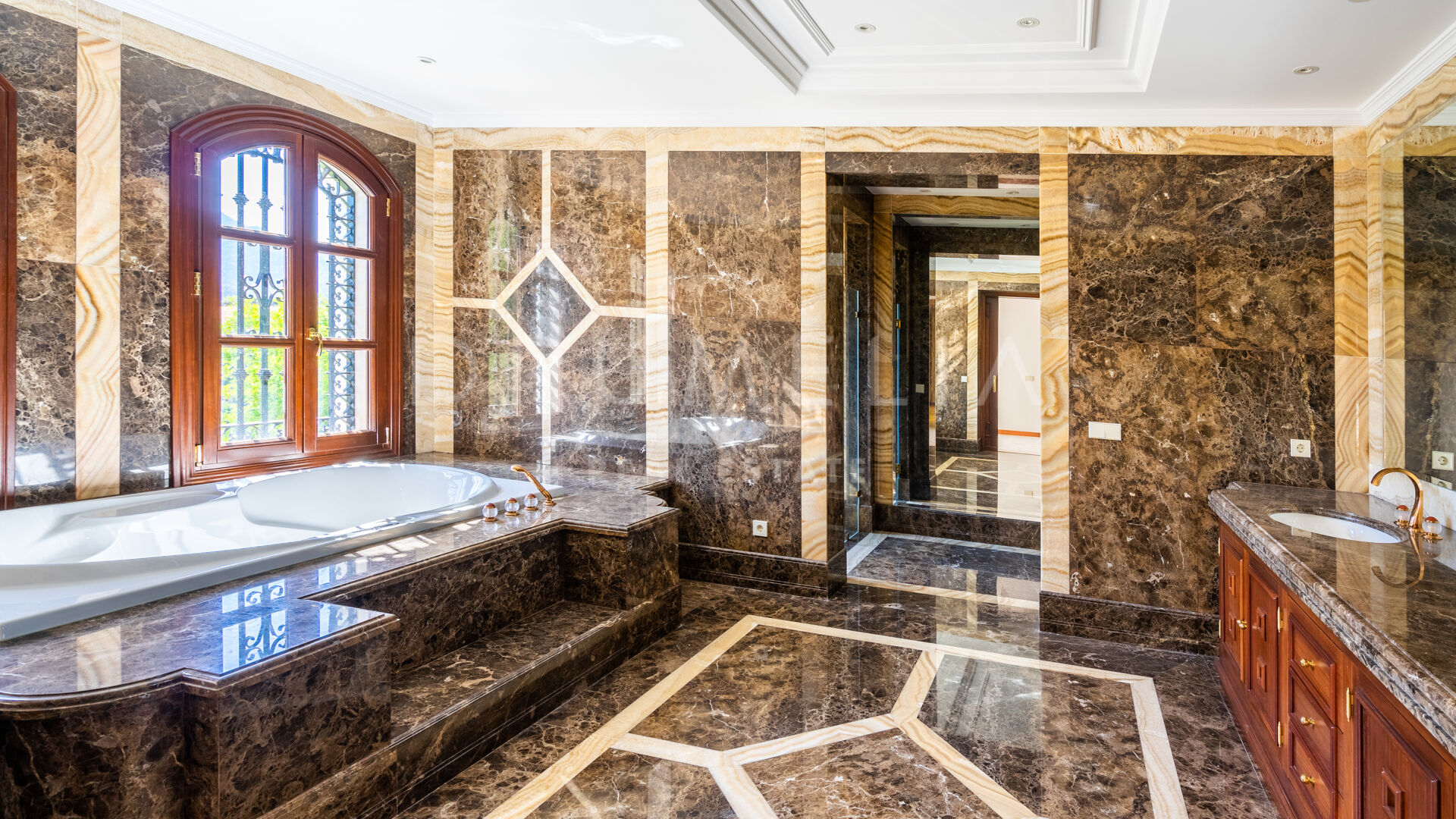 Im unteren Erdgeschoss findest du eine große Edelstahl-Großküche mit professionellen Geräten von Rofar und “stummen Kellnern” im Erd- und Obergeschoss. Die Küche hat sowohl einen separaten Zugang als auch einen Zugang von der Küche im Erdgeschoss – sehr praktisch! Auf dieser Ebene befinden sich eine klimatisierte Weinbodega, ein Spielzimmer, ein Heimkino, ein großer Fitnessraum, eine Sauna, ein türkisches Bad, ein Massageraum, ein großer Waschraum, ein Umkleideraum für das Personal, ein Maschinenraum, ein Lagerraum usw. Im Obergeschoss befinden sich 2 Master-Suiten mit großen Ankleidezimmern, einer Küche, einer privaten Terrasse und großen Badezimmern mit feinstem Marmor, jeweils mit Whirlpool und separater Dusche. Diese Suiten können miteinander verbunden werden, um eine große und private Suite zu schaffen. Es gibt 4 große Gästeschlafzimmer, jedes mit eigenem Bad, Küche und Zugang zur Terrasse.