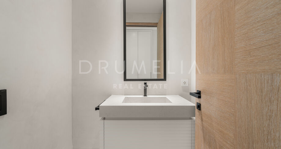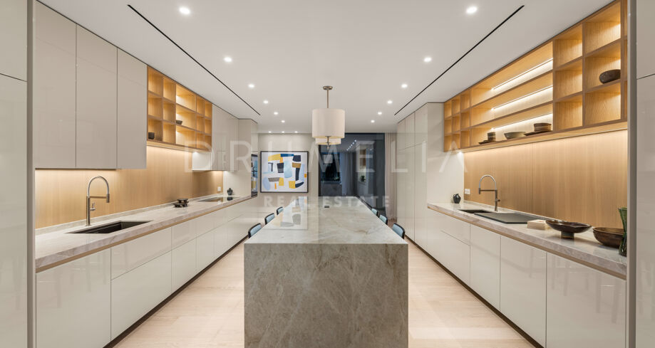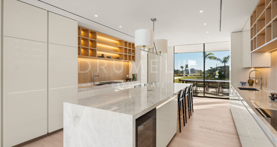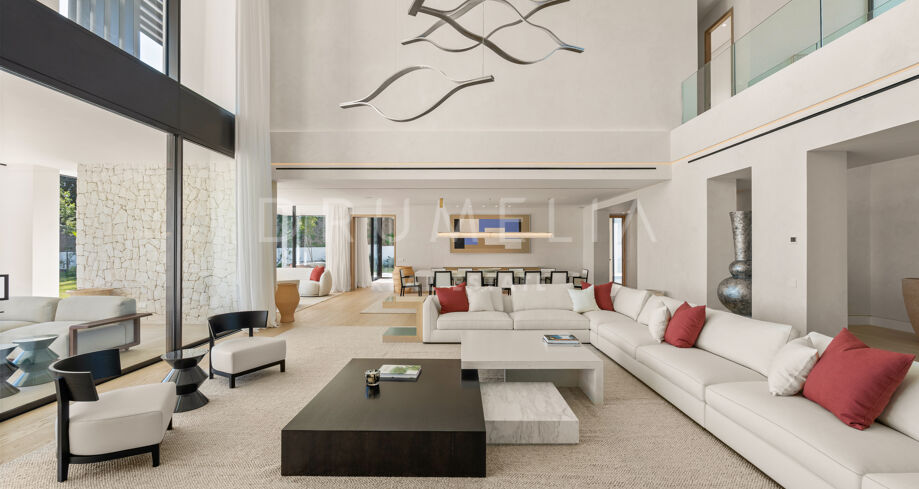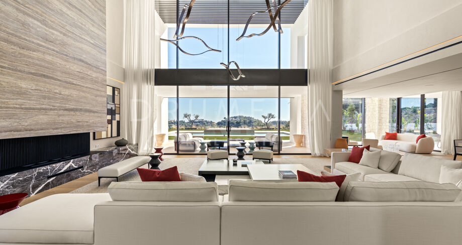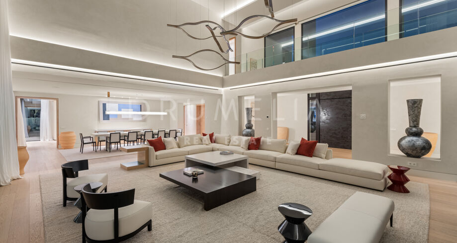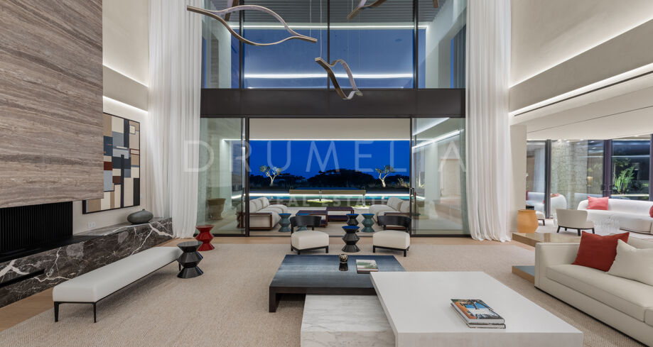 Das Haus verfügt über sechs Schlafzimmer, sieben Badezimmer und ein Gäste-WC, verteilt auf drei Ebenen mit einer großzügigen und ausgewogenen Raumaufteilung. Entworfen für Komfort und Eleganz, mit doppelter Raumhöhe in den Wohnbereichen, wobei der Hauptwohnbereich und die Schlafzimmer möbliert werden. Zu den luxuriösen Annehmlichkeiten zählen ein privater Spa mit Sauna und Hammam, Fitnessraum, Massageraum und ein Gästeapartment im Untergeschoss. Großzügige Terrassen, gestaltete Außenbereiche und bodentiefe Fenster schaffen ein fließendes Wohnerlebnis zwischen Innen- und Außenbereichen. Zu den zahlreichen Merkmalen gehört auch ein beheizter und überdachter Pool, der das ganze Jahr über genutzt werden kann.
