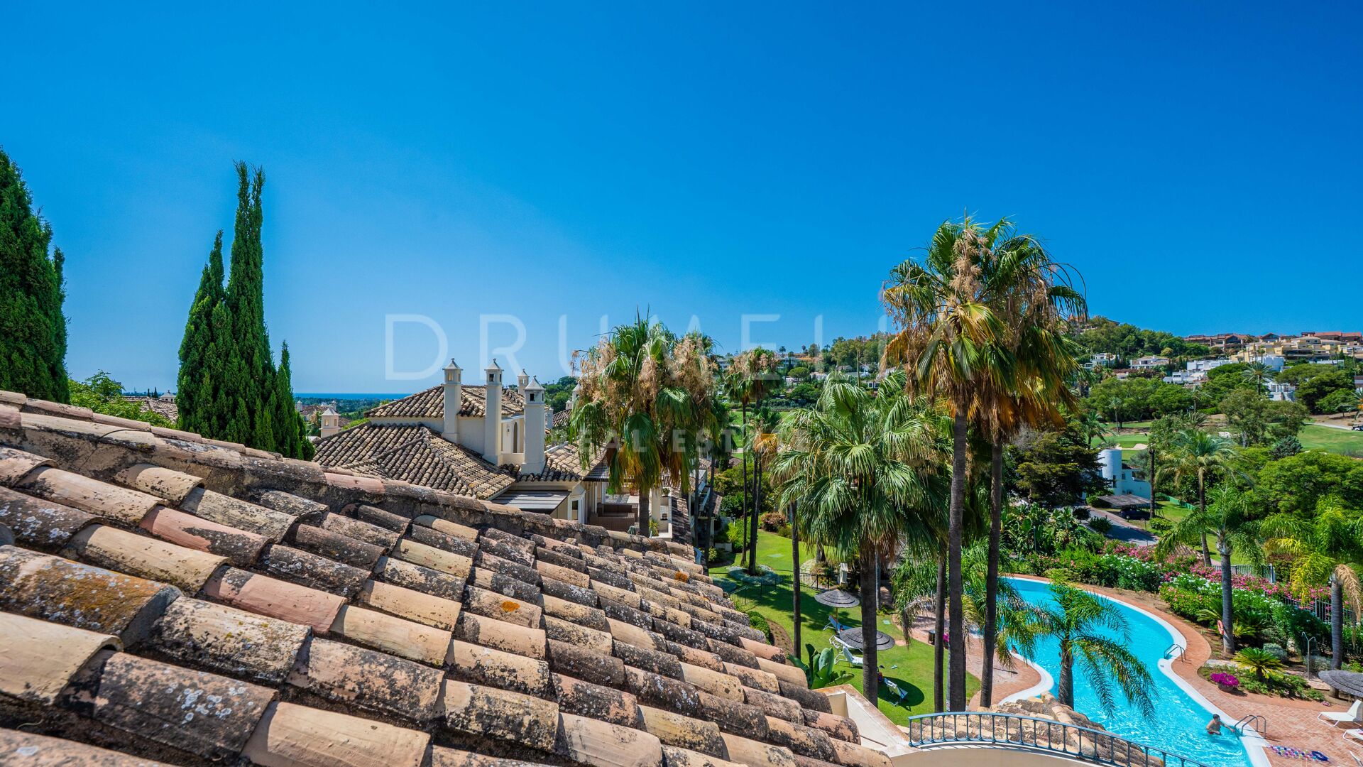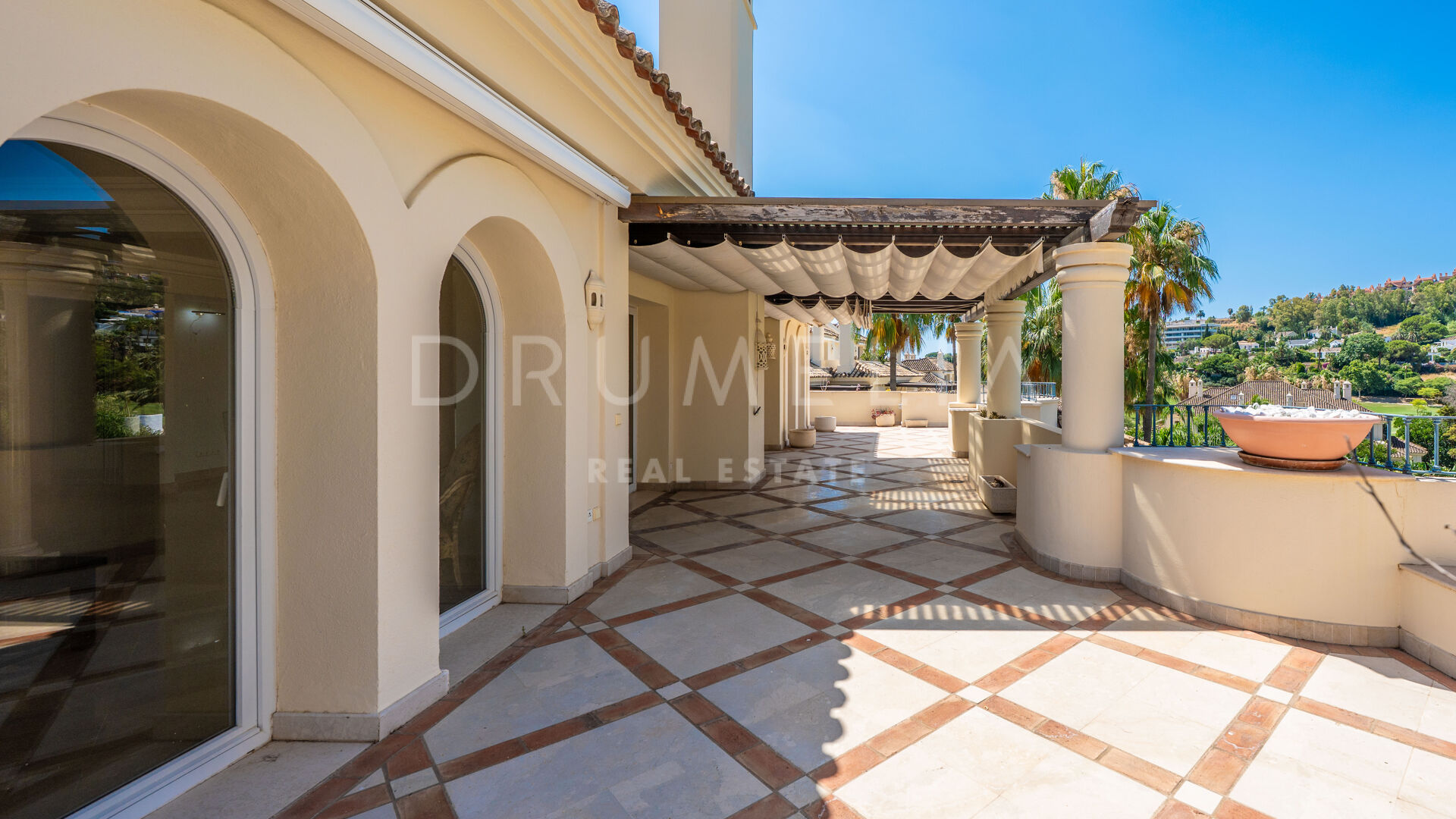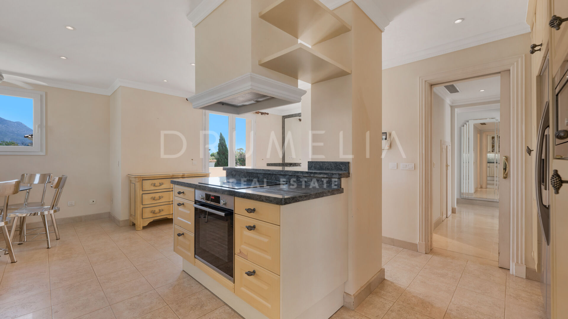 Entdecken Sie dieses außergewöhnliche 3-Schlafzimmer-Duplex-Penthouse zum Verkauf in der renommierten, abgeschlossenen Wohnanlage Las Alamandas in Nueva Andalucía. Perfekt gelegen zwischen den ikonischen Golfplätzen Los Naranjos und Las Brisas und nur wenige Minuten vom weltberühmten Puerto Banús entfernt, vereint diese Residenz Eleganz, Privatsphäre und Sicherheit an einer der begehrtesten Adressen Marbellas.