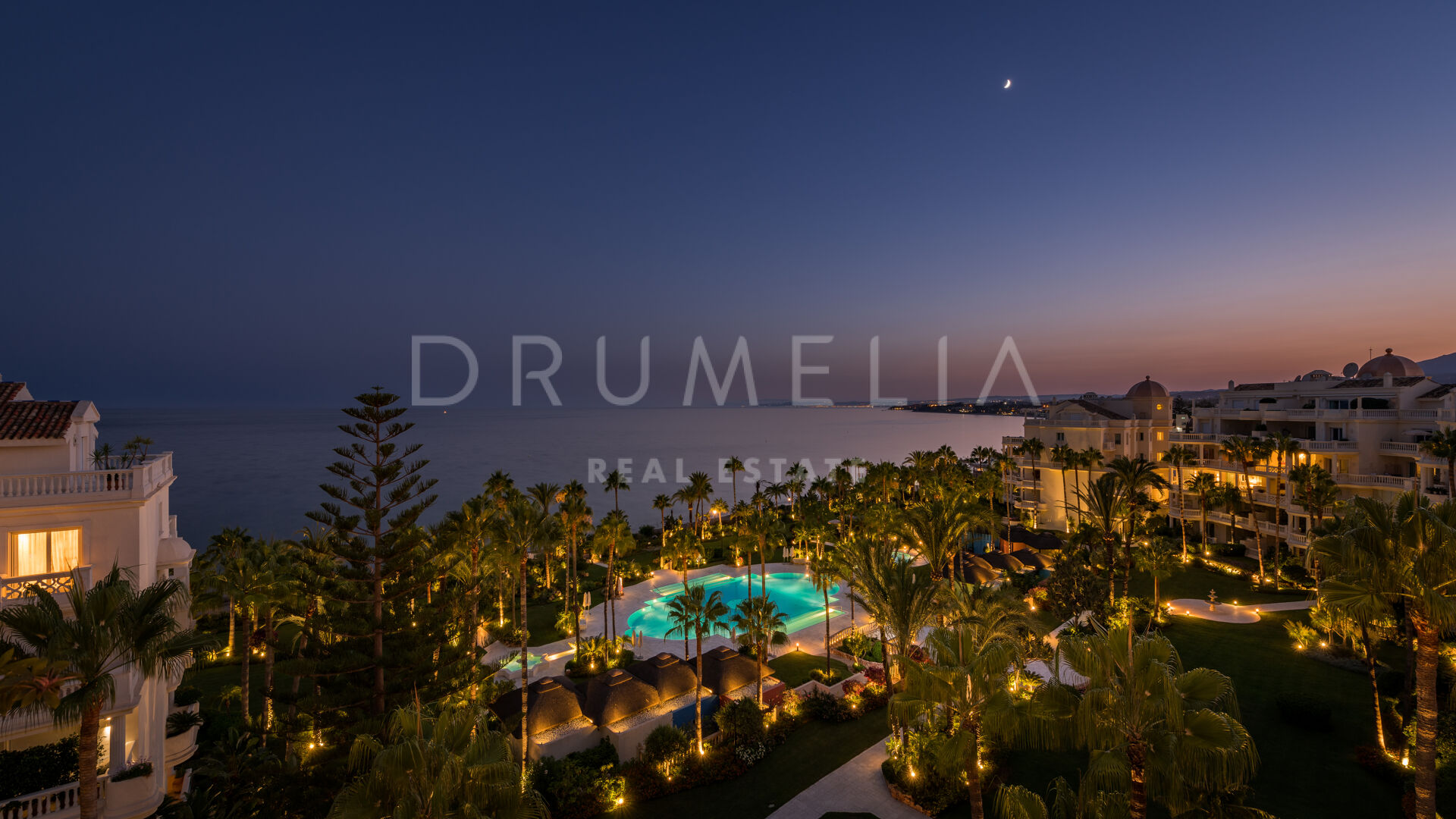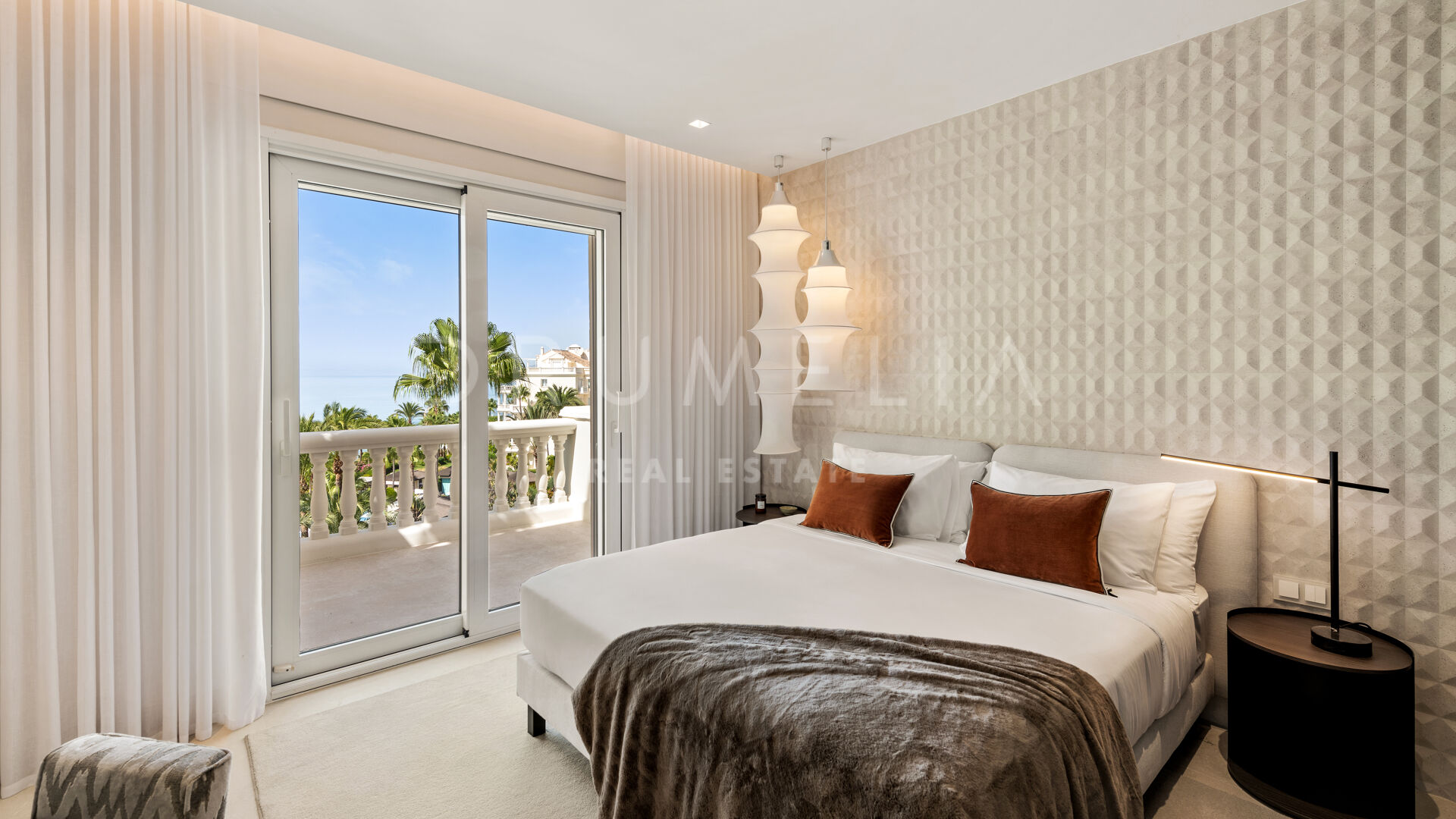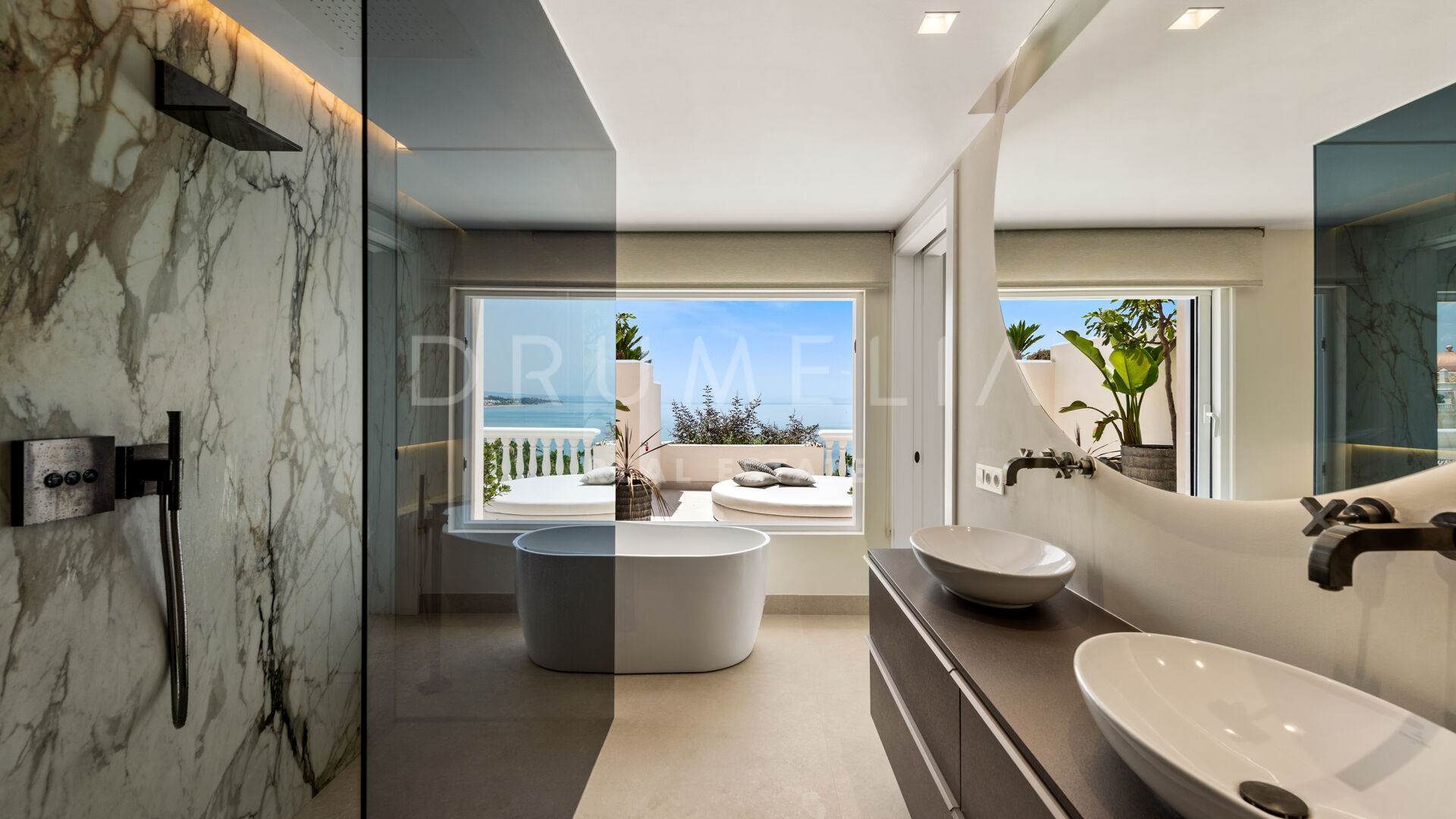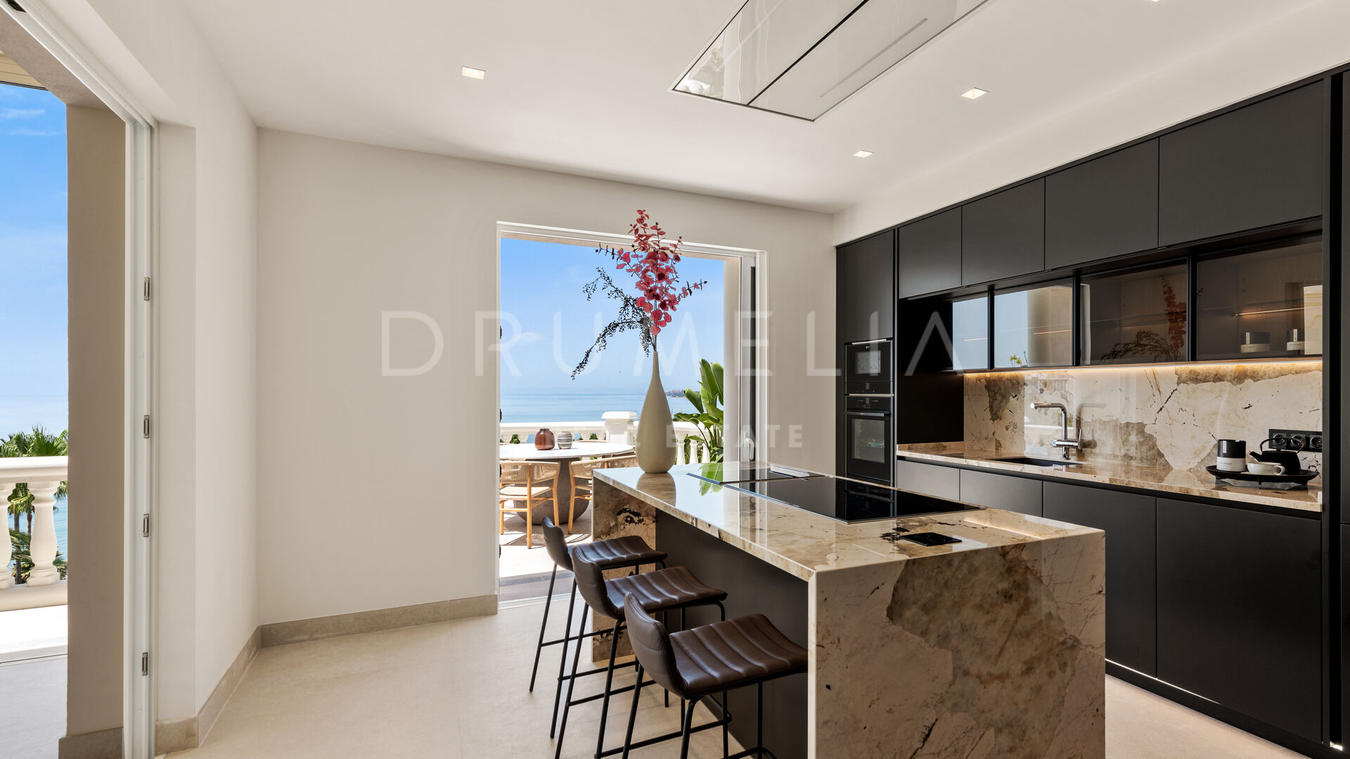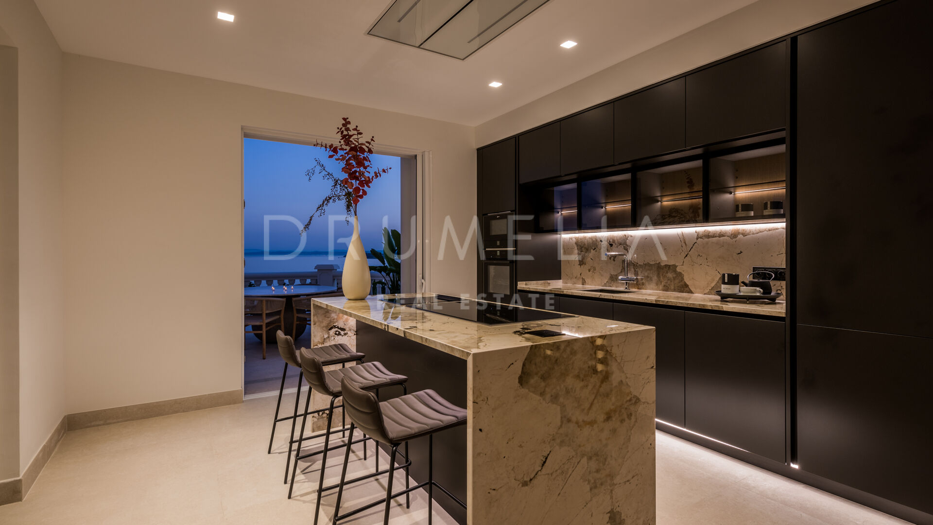 Das komplett neu gestaltete, zum Verkauf stehende Penthouse in erster Strandlinie in Las Dunas Park, einer der luxuriösesten Ferienanlagen an der Costa del Sol, besticht durch seine privilegierte Lage an der Neuen Goldenen Meile von Estepona, seinen unverbaubaren Meerblick, seinen raffinierten Stil und seinen ultimativen modernen Komfort.