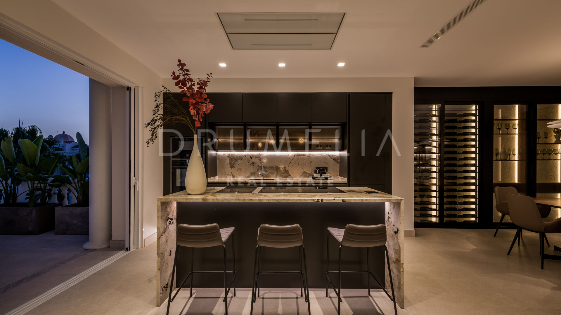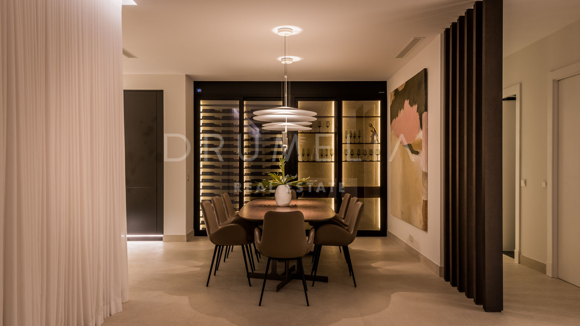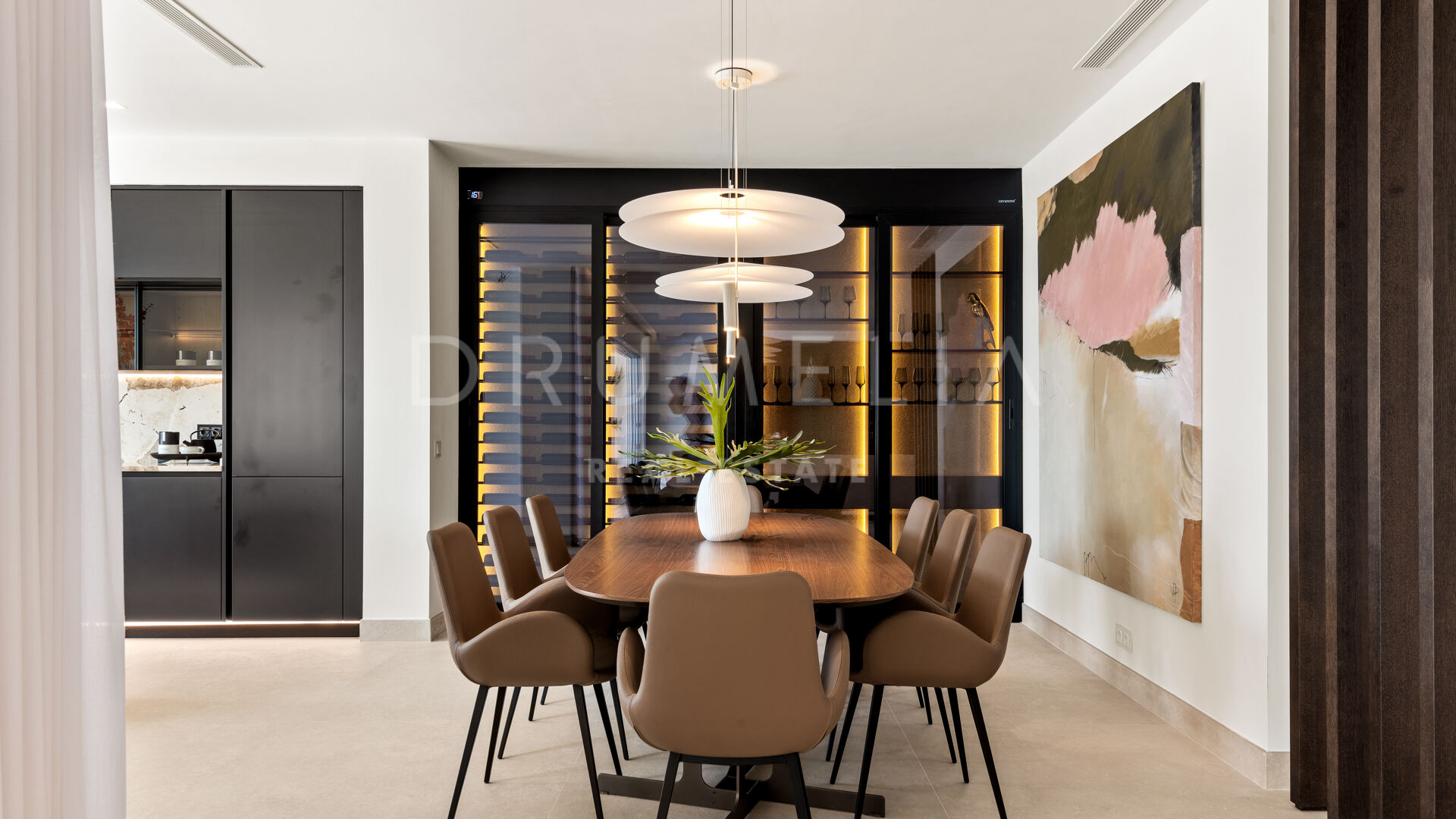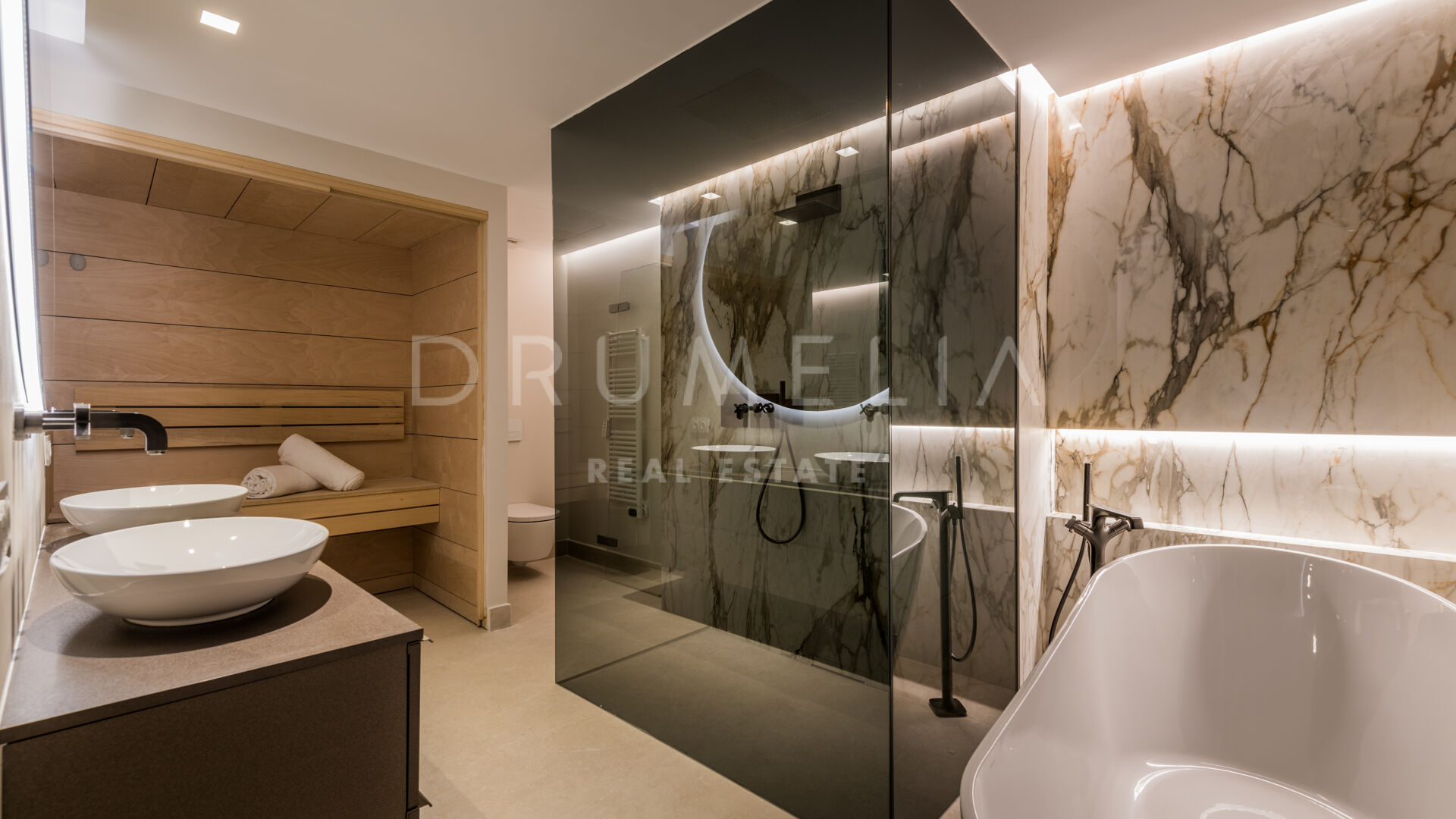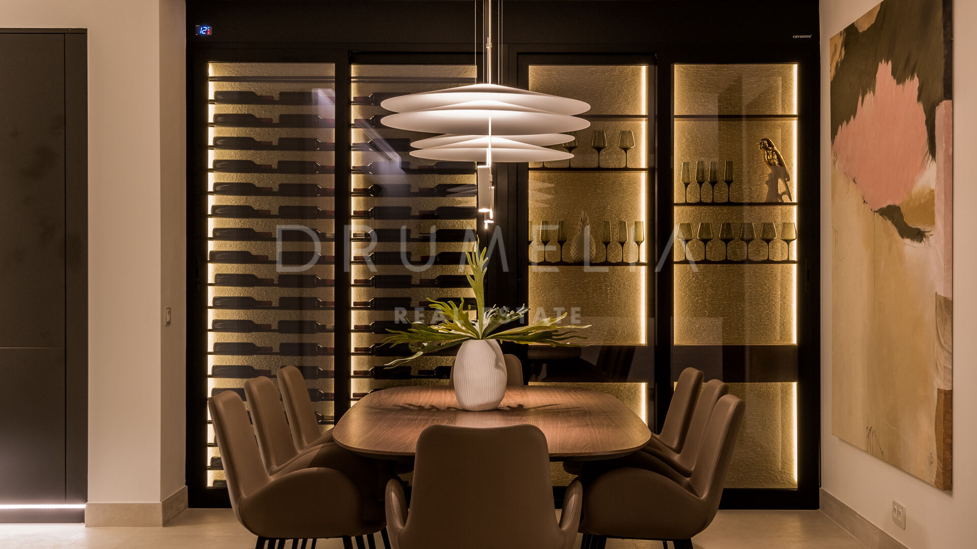Das spektakuläre, hochwertige Penthouse mit einer Fläche von 262 m2, das nach Süden/Westen ausgerichtet ist, verfügt über 5 stilvolle Schlafzimmer und 5 Bäder mit Fußbodenheizung, ein elegantes Wohnzimmer mit TV-Lounge, eine Designerküche mit hervorragenden deutschen NEFF-Geräten, einen Essbereich, einen Weinkeller, eine private Sauna und eine Waschküche. Die Zimmer sind mit den bemerkenswerten 165 m2 großen Terrassen verbunden, auf denen man chillen, sonnenbaden und im Freien speisen kann. Von hier aus hat man einen atemberaubenden Blick auf das Meer, die Berge und die Straße von Gibraltar mit den beeindruckenden “Säulen des Herkules”, an denen die Menschen in der Antike das Ende der Welt vermuteten.