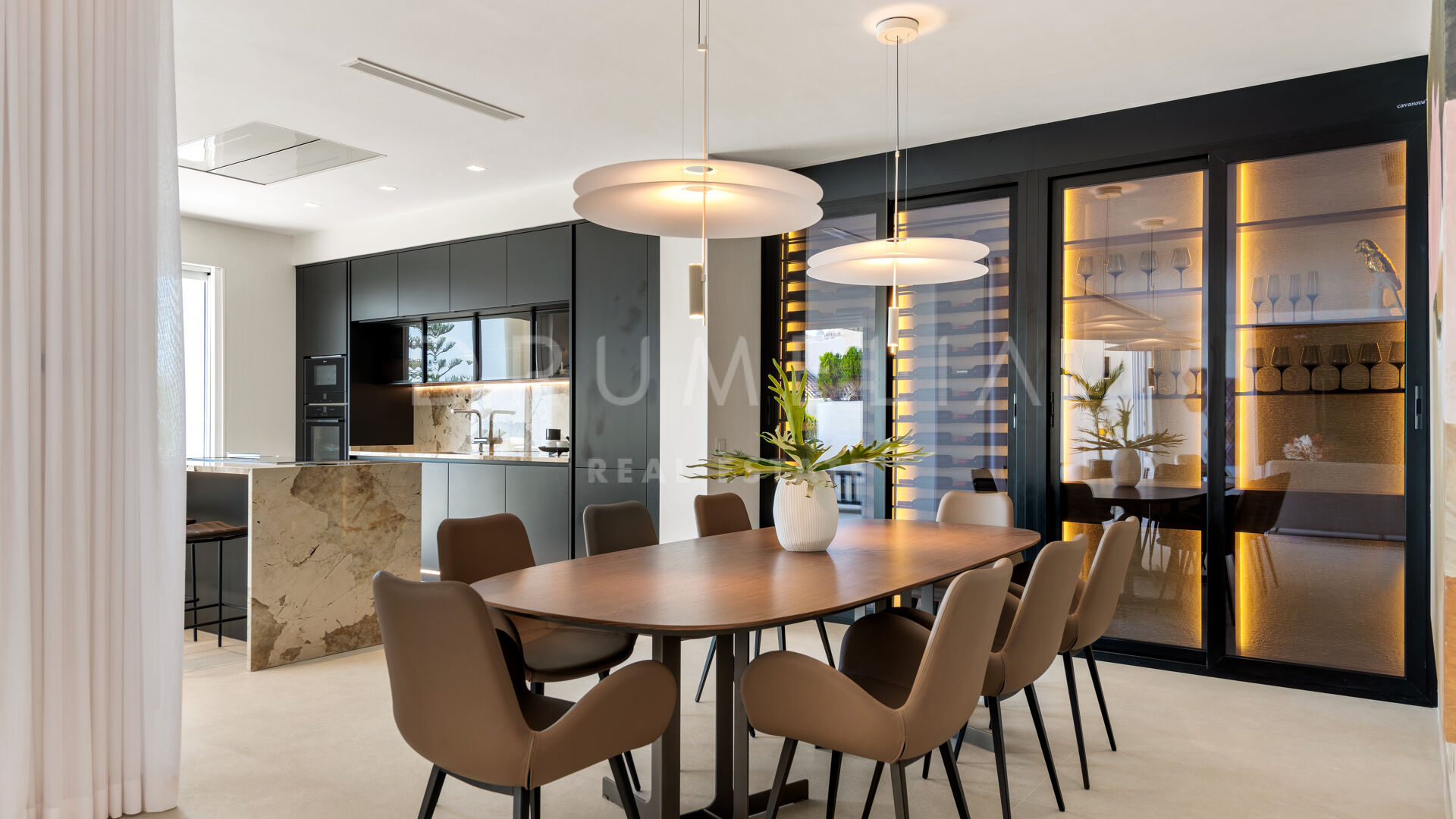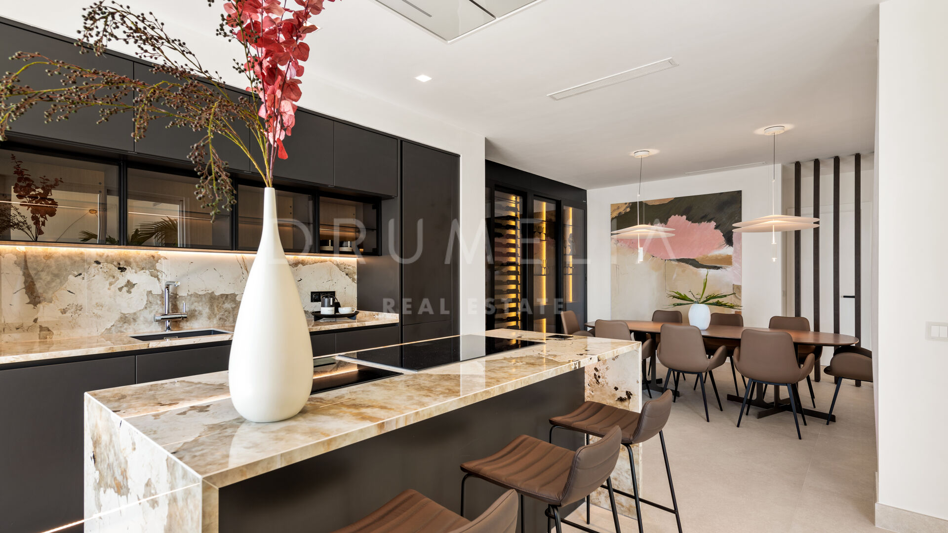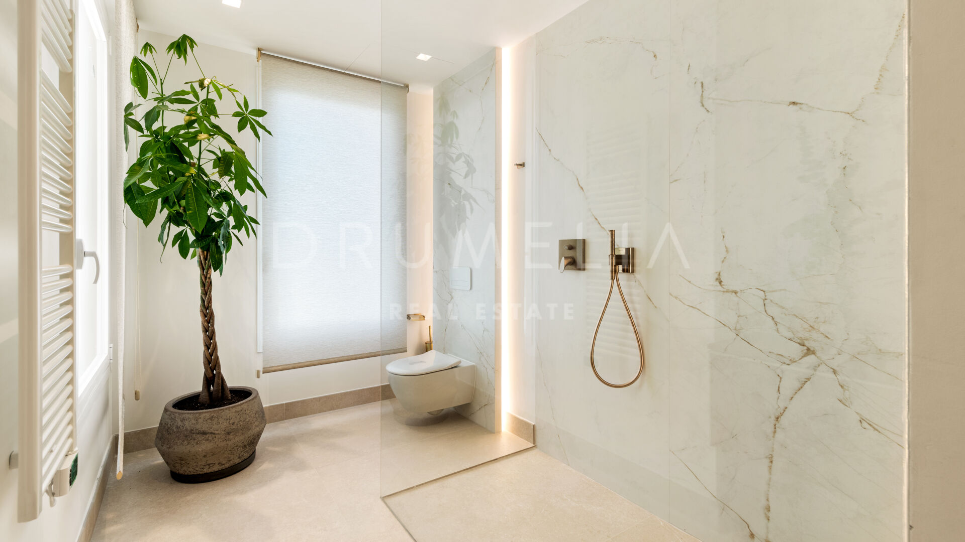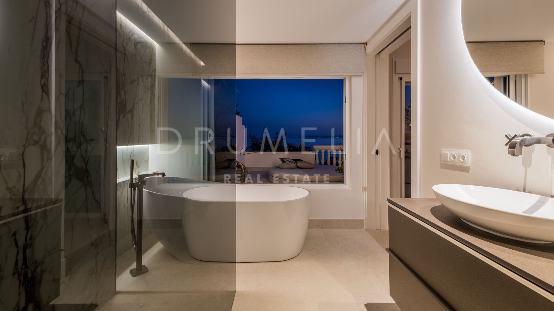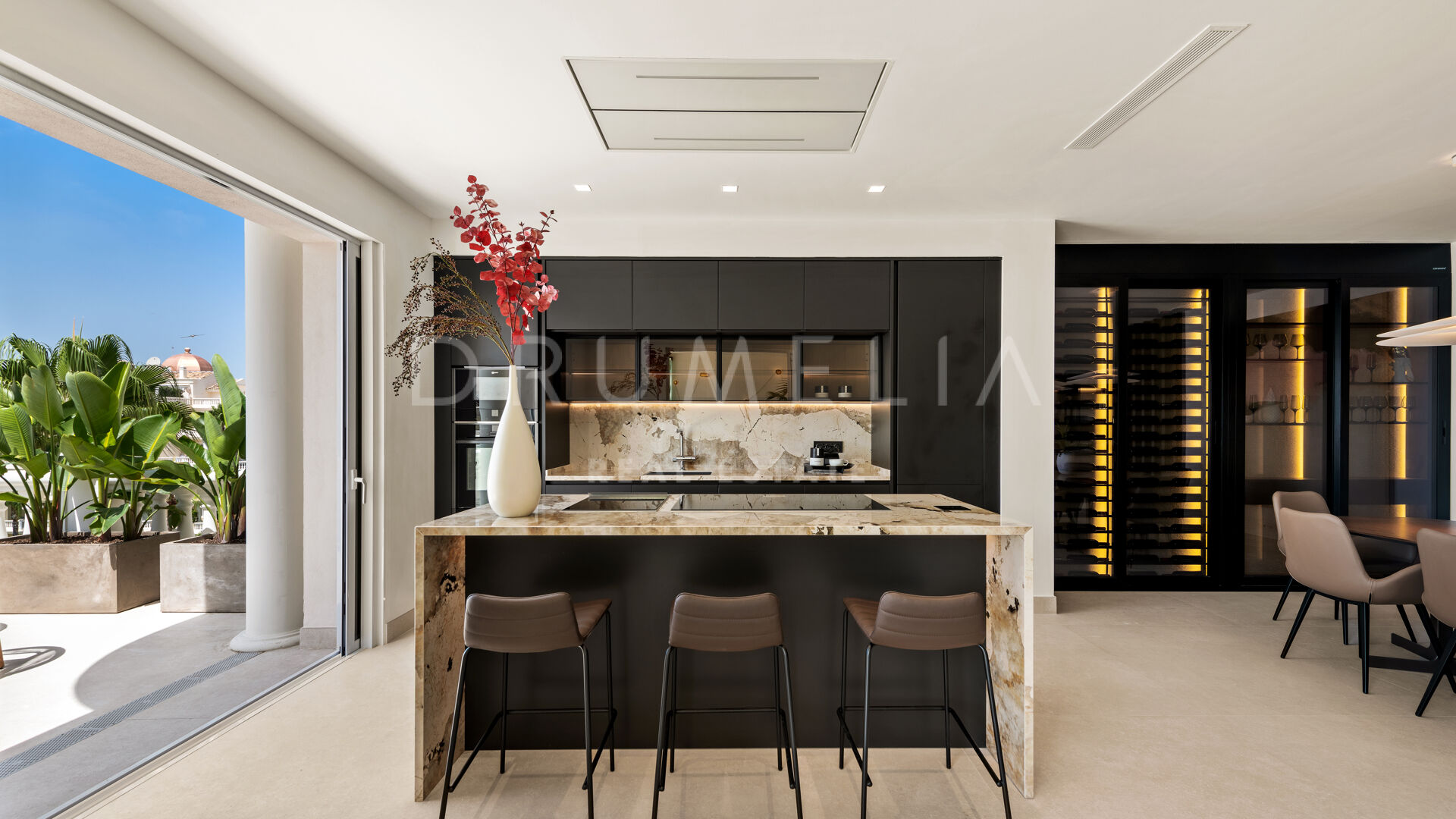 Das spektakuläre, hochwertige Penthouse mit einer Fläche von 262 m2, das nach Süden/Westen ausgerichtet ist, verfügt über 5 stilvolle Schlafzimmer und 5 Bäder mit Fußbodenheizung, ein elegantes Wohnzimmer mit TV-Lounge, eine Designerküche mit hervorragenden deutschen NEFF-Geräten, einen Essbereich, einen Weinkeller, eine private Sauna und eine Waschküche. Die Zimmer sind mit den bemerkenswerten 165 m2 großen Terrassen verbunden, auf denen man chillen, sonnenbaden und im Freien speisen kann. Von hier aus hat man einen atemberaubenden Blick auf das Meer, die Berge und die Straße von Gibraltar mit den beeindruckenden “Säulen des Herkules”, an denen die Menschen in der Antike das Ende der Welt vermuteten.