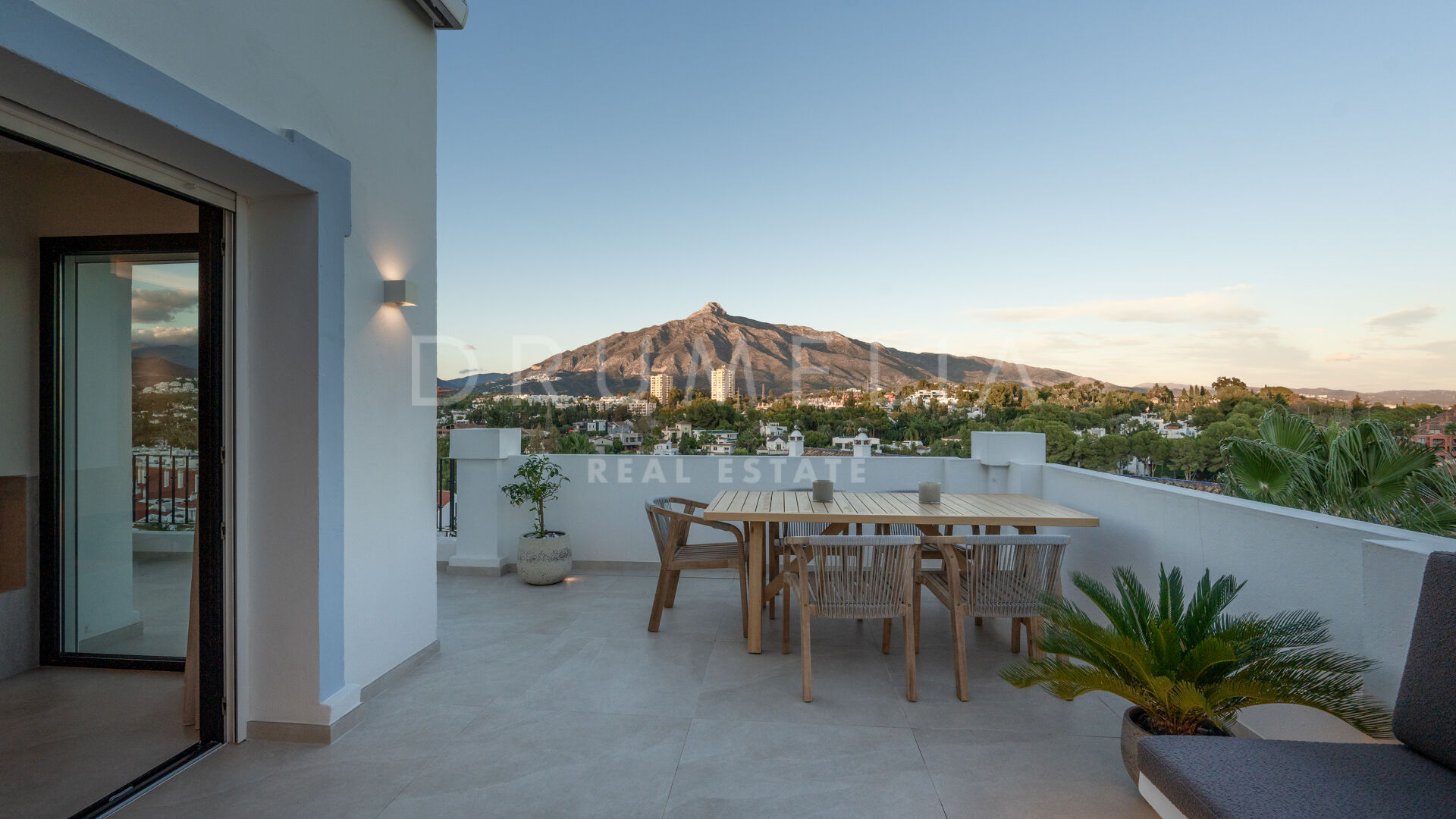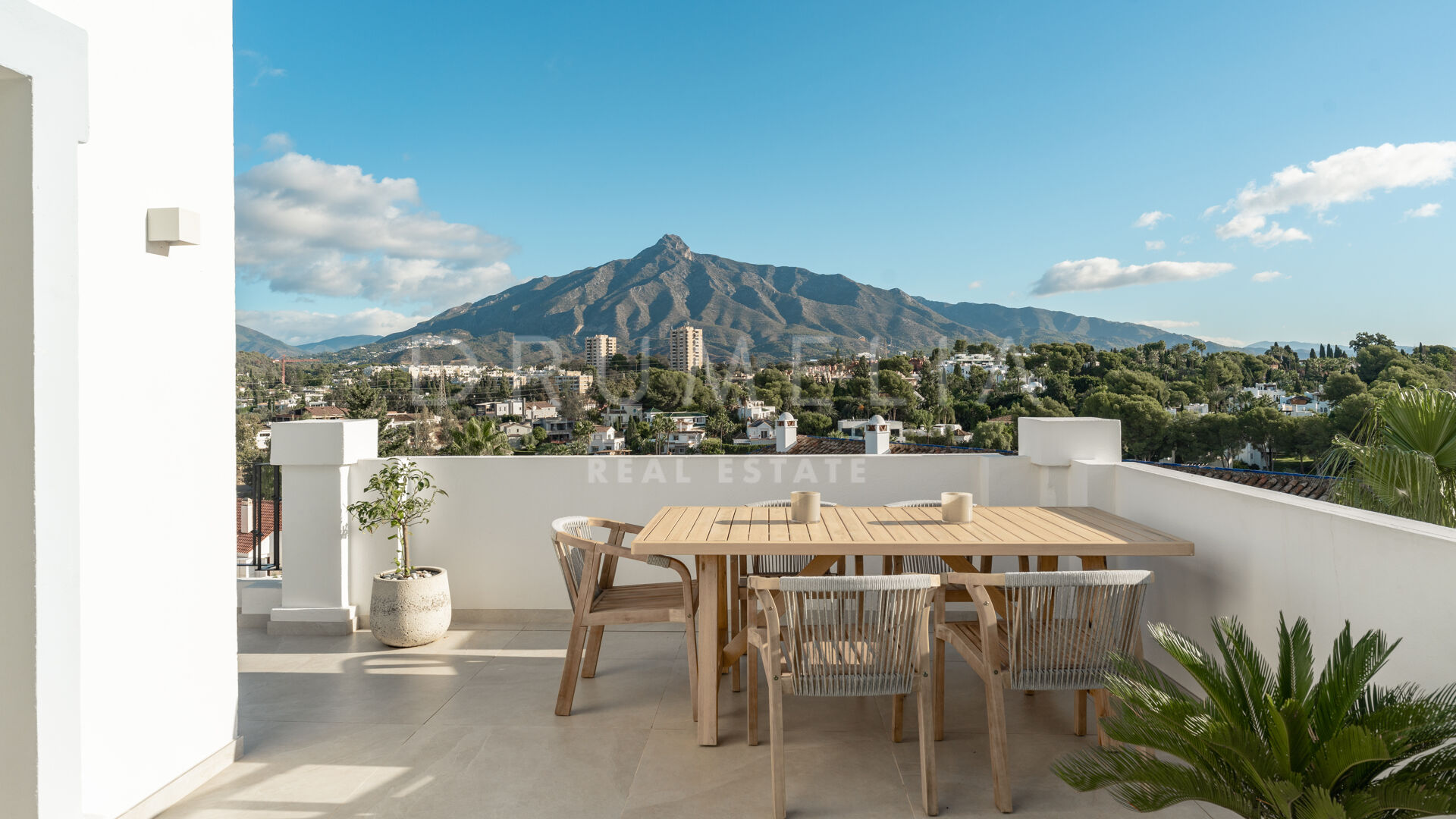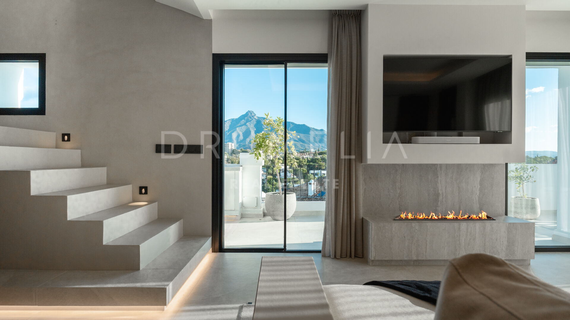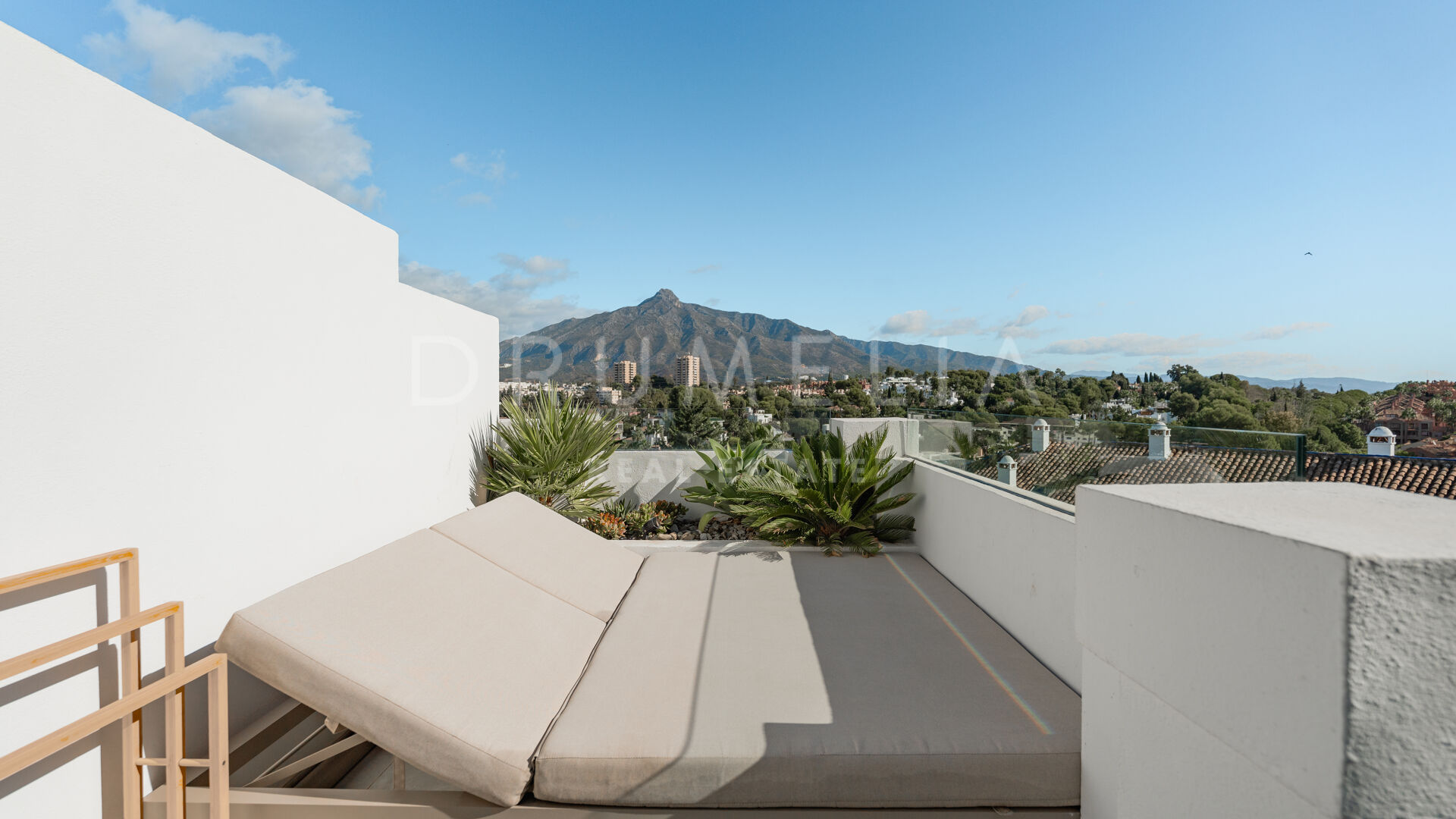 Dieses atemberaubende Duplex-Penthouse befindet sich in bester Lage im Herzen von Nueva Andalucía. Sorgfältig entworfen von Archidom Architects, bietet das Anwesen 160 m² stilvoll gestalteten Innenraum, verbunden mit einer privaten Terrasse von 66 m², die einen ungehinderten Panoramablick auf den La Concha-Berg und das Mittelmeer eröffnet.