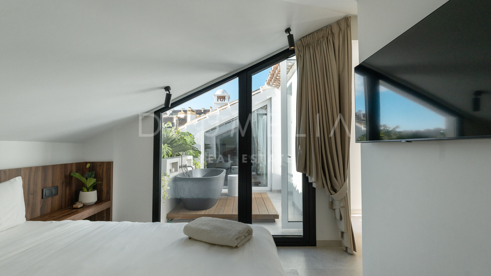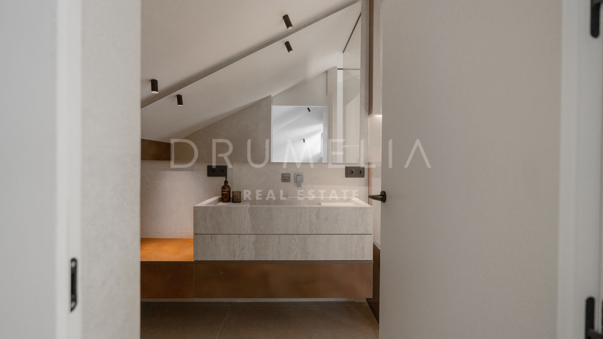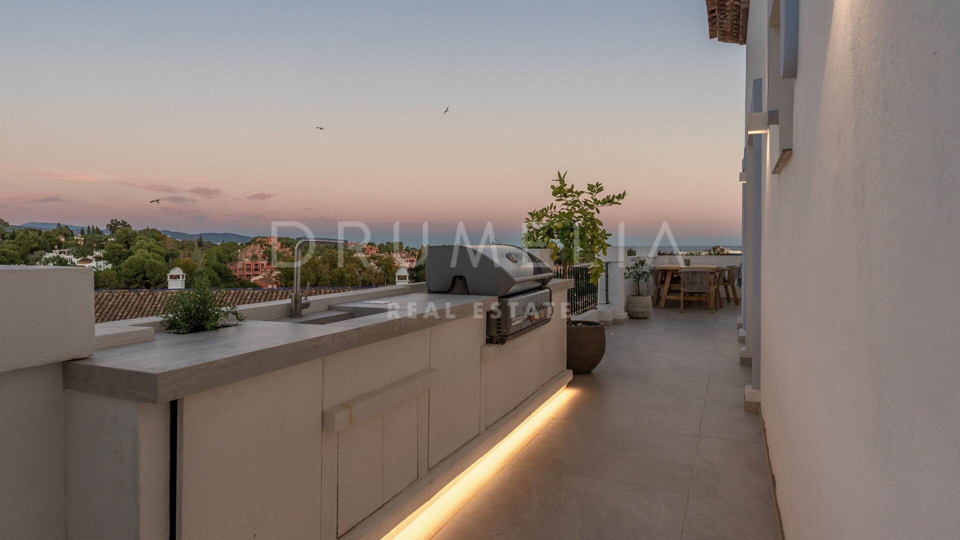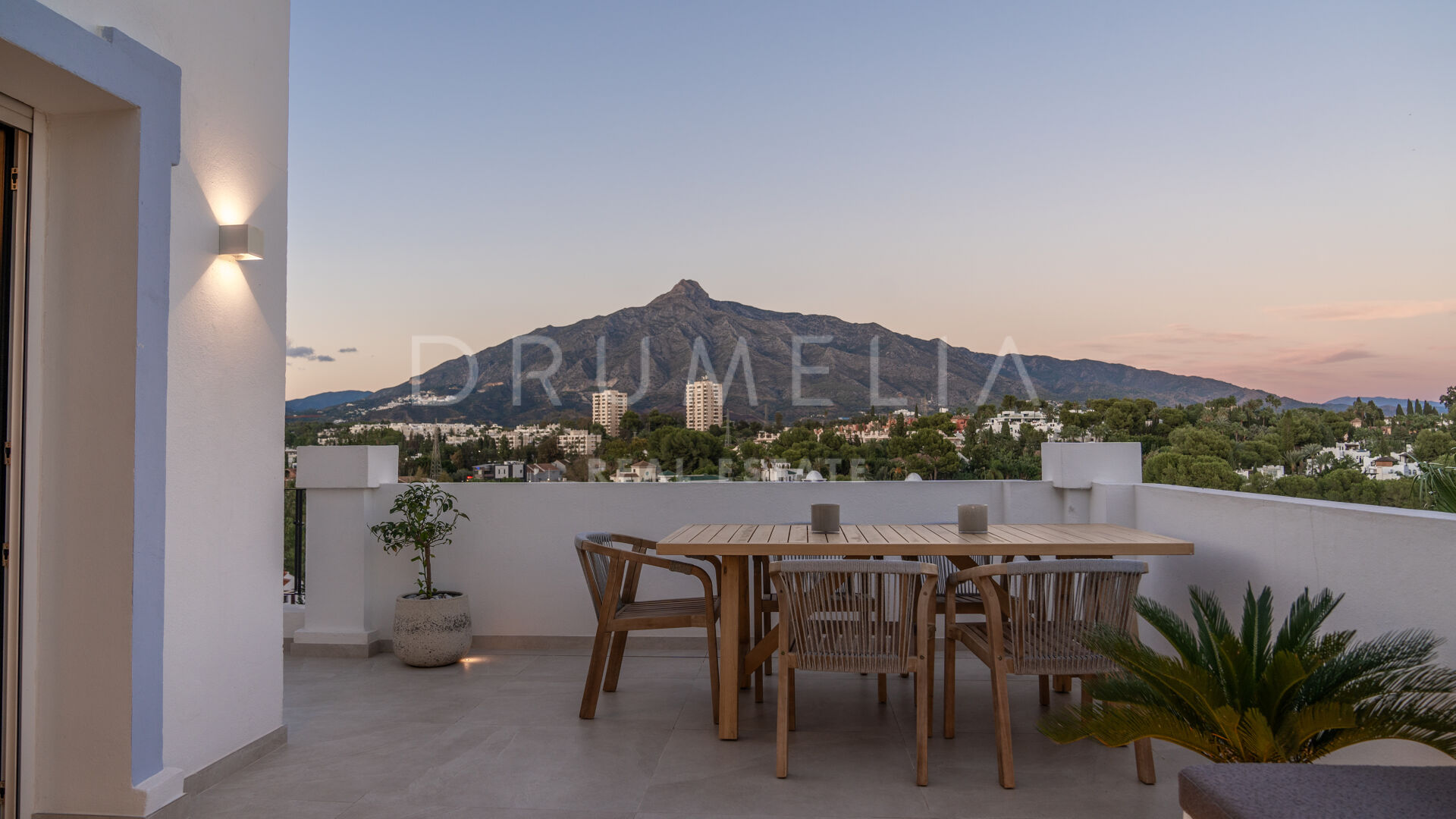 Dieses atemberaubende Duplex-Penthouse befindet sich in bester Lage im Herzen von Nueva Andalucía. Sorgfältig entworfen von Archidom Architects, bietet das Anwesen 160 m² stilvoll gestalteten Innenraum, verbunden mit einer privaten Terrasse von 66 m², die einen ungehinderten Panoramablick auf den La Concha-Berg und das Mittelmeer eröffnet.