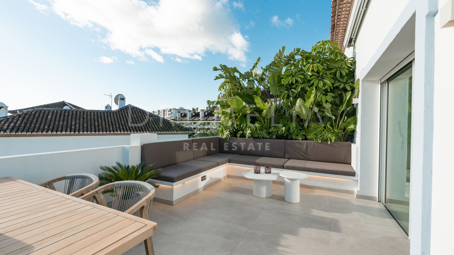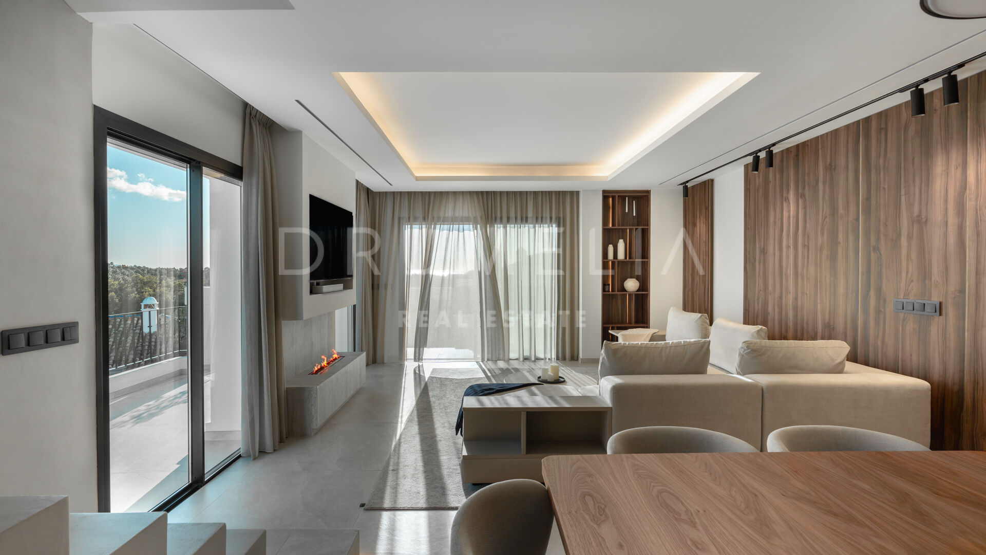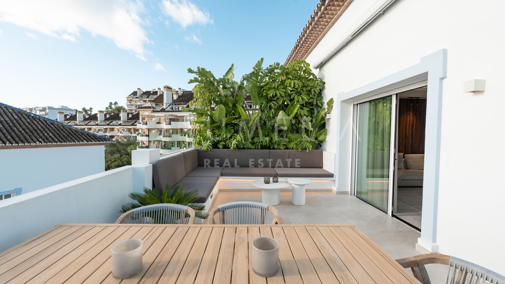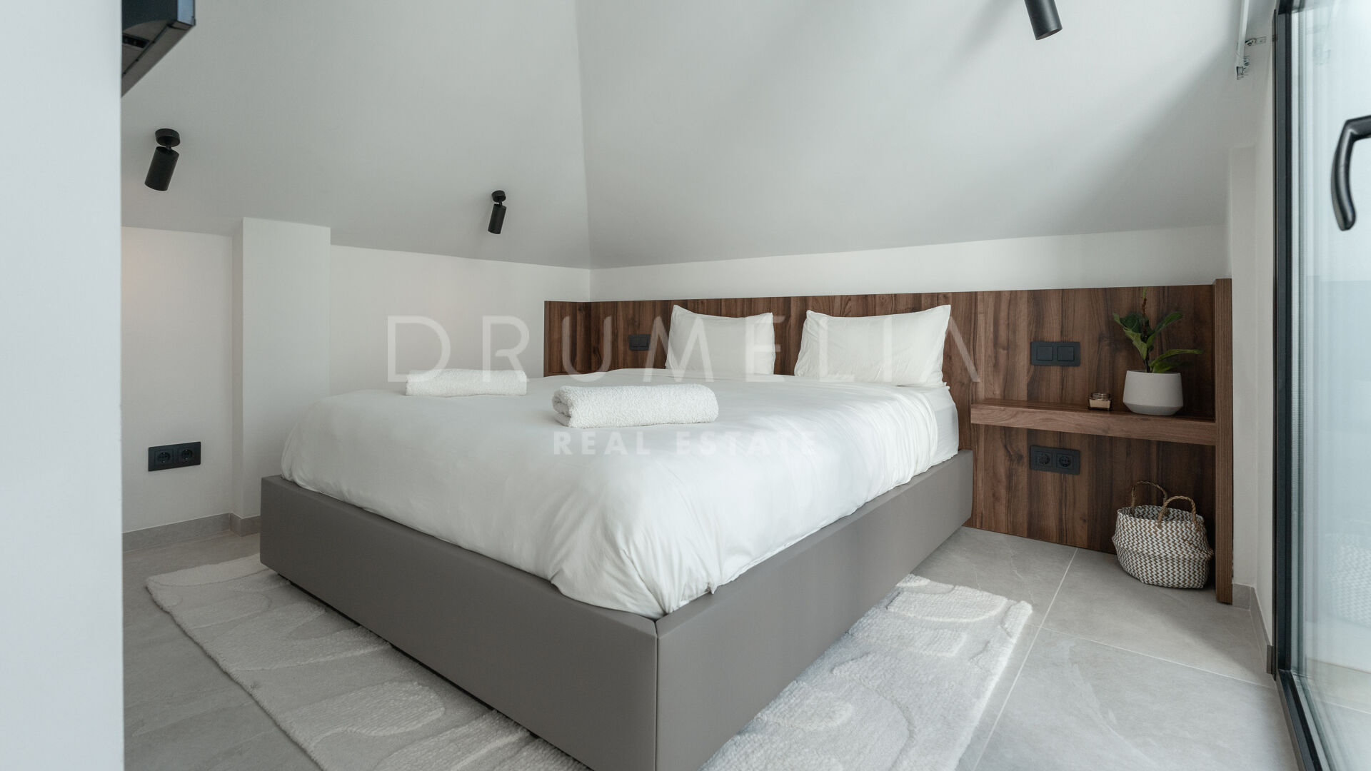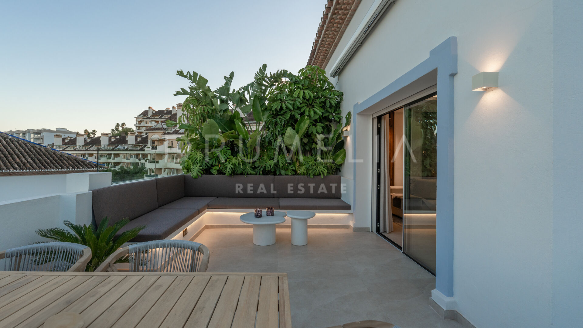 Dieses atemberaubende Duplex-Penthouse befindet sich in bester Lage im Herzen von Nueva Andalucía. Sorgfältig entworfen von Archidom Architects, bietet das Anwesen 160 m² stilvoll gestalteten Innenraum, verbunden mit einer privaten Terrasse von 66 m², die einen ungehinderten Panoramablick auf den La Concha-Berg und das Mittelmeer eröffnet.