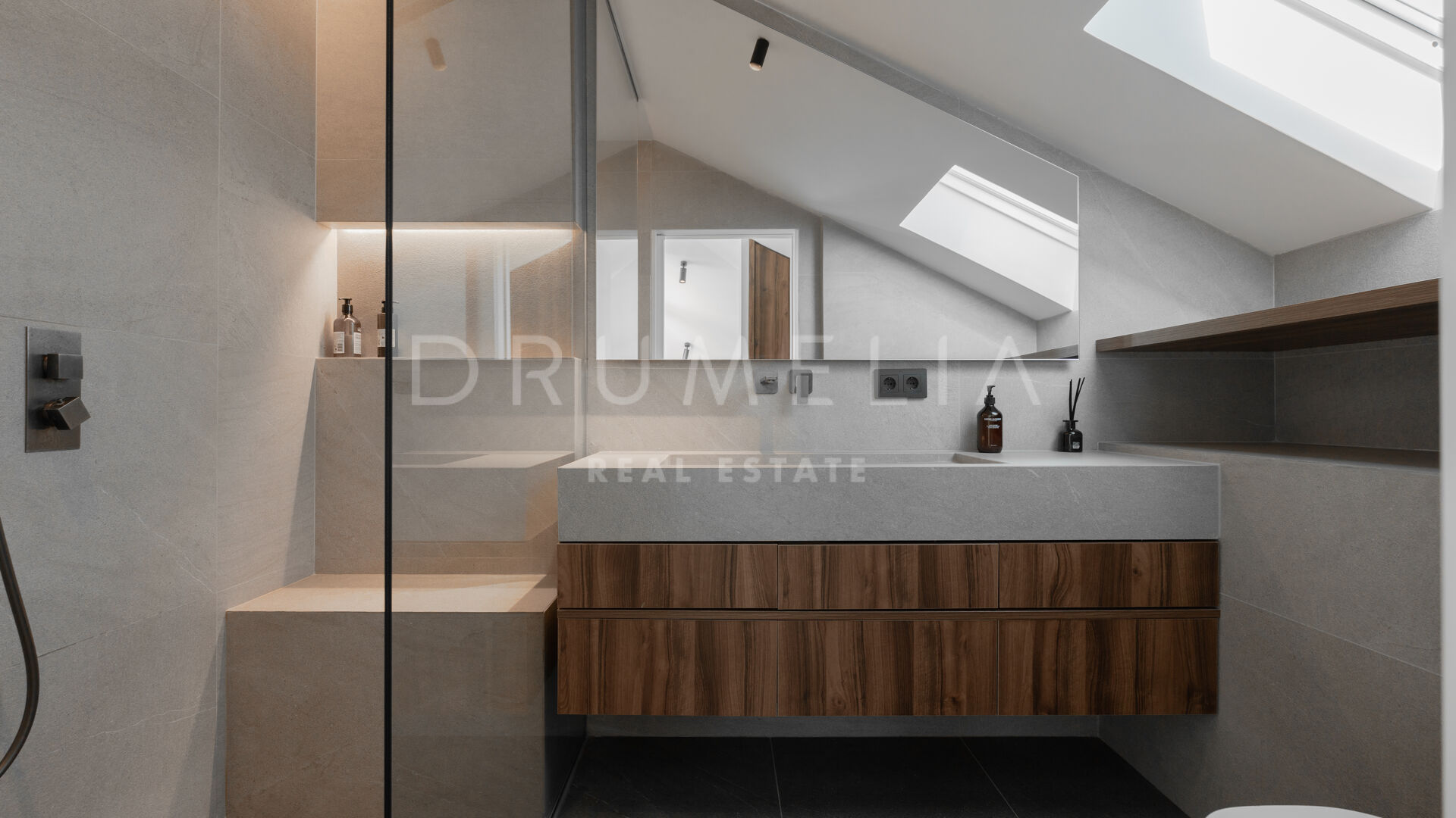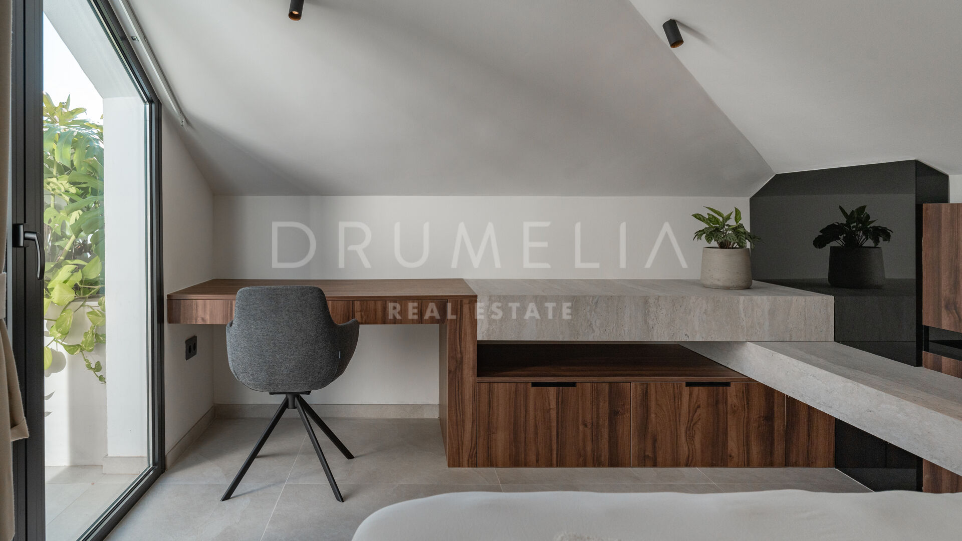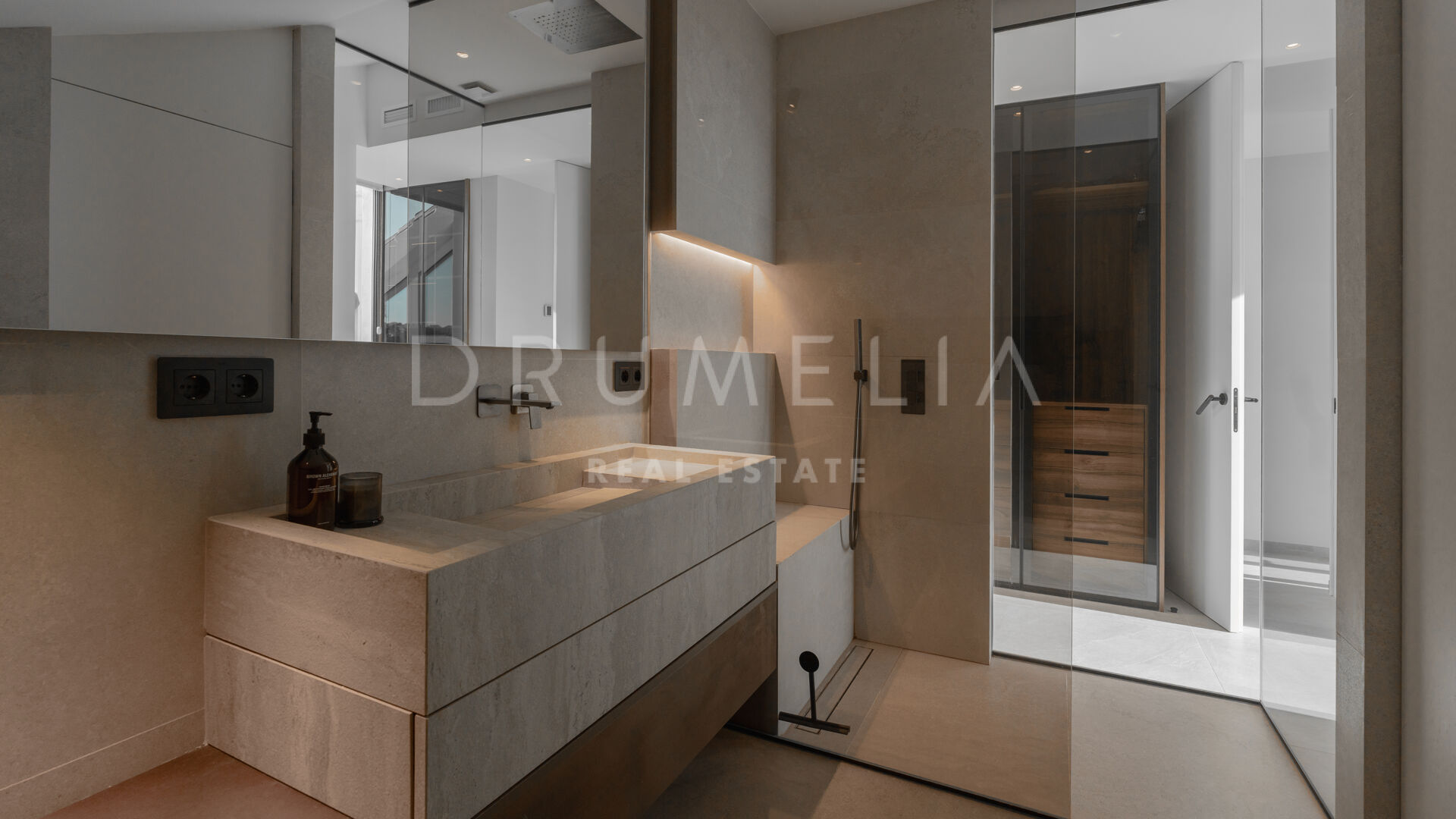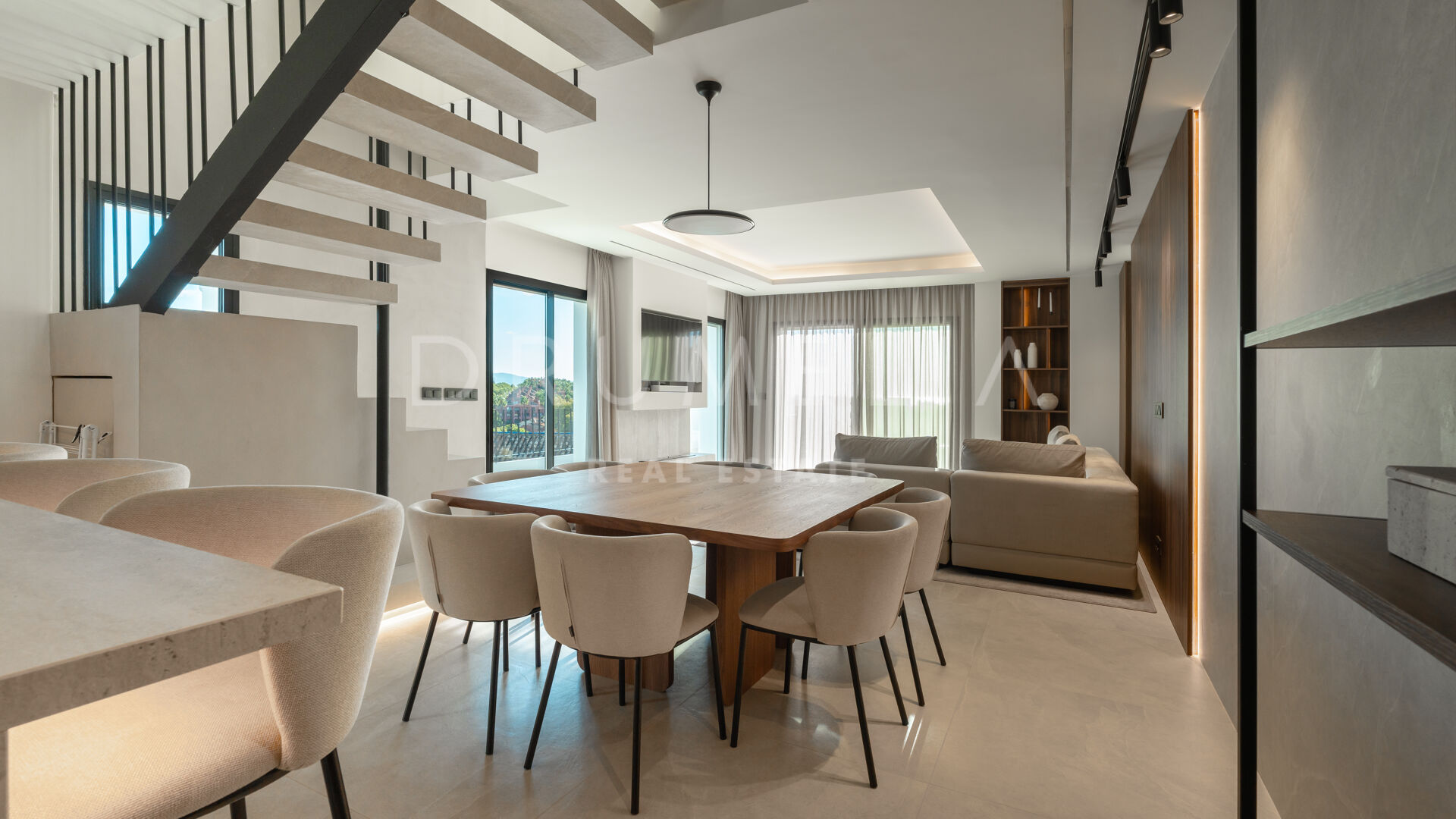 Dieses atemberaubende Duplex-Penthouse befindet sich in bester Lage im Herzen von Nueva Andalucía. Sorgfältig entworfen von Archidom Architects, bietet das Anwesen 160 m² stilvoll gestalteten Innenraum, verbunden mit einer privaten Terrasse von 66 m², die einen ungehinderten Panoramablick auf den La Concha-Berg und das Mittelmeer eröffnet.