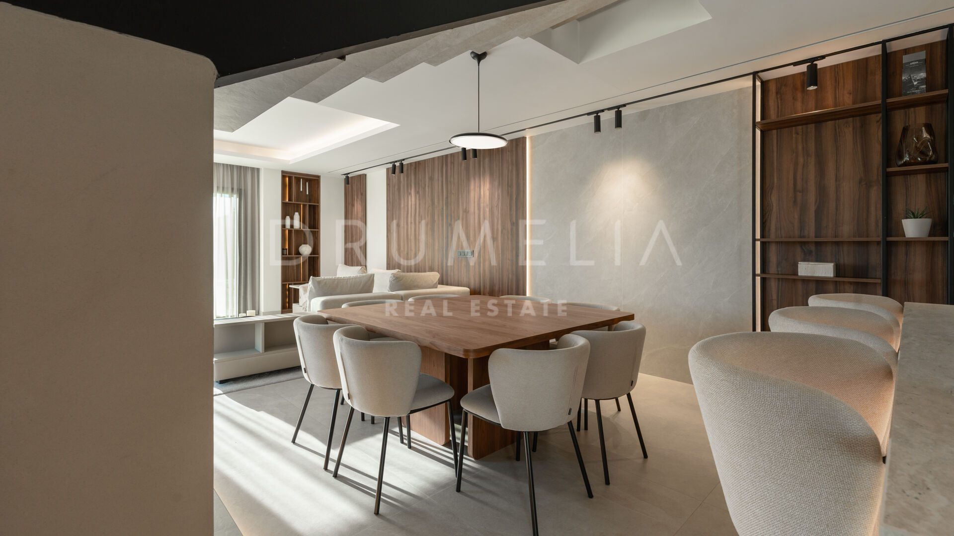 Das Interieur vereint moderne Eleganz mit wohnlicher Wärme. Es verfügt über drei geräumige Schlafzimmer, jeweils mit eigenem Bad. Der offene Wohnbereich ist mit maßgefertigten Möbeln von Aldecora ausgestattet und vermittelt eine einladende, zeitgemäße Atmosphäre. Ein großzügiger Essbereich rundet das Raumangebot ab – perfekt für gesellige Abende oder entspannte Familienmomente.