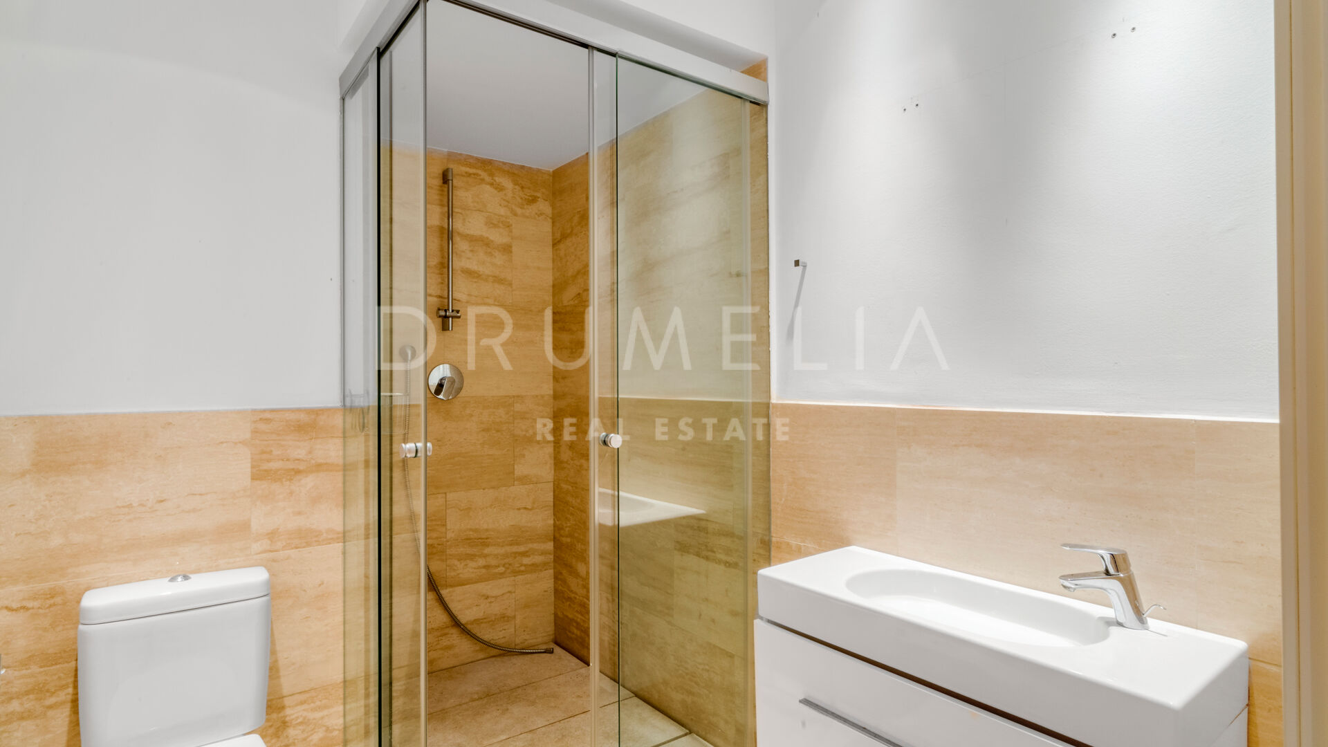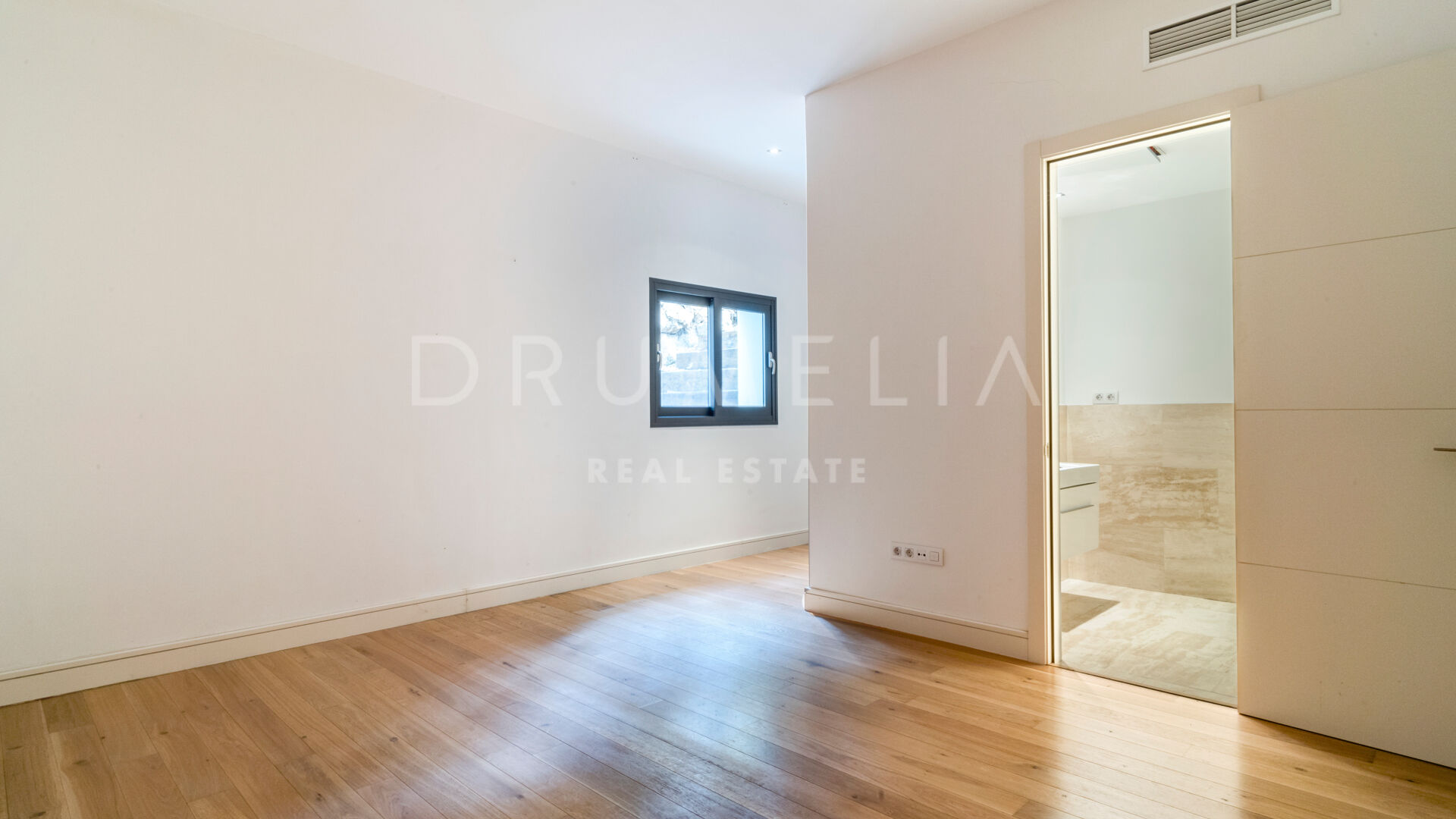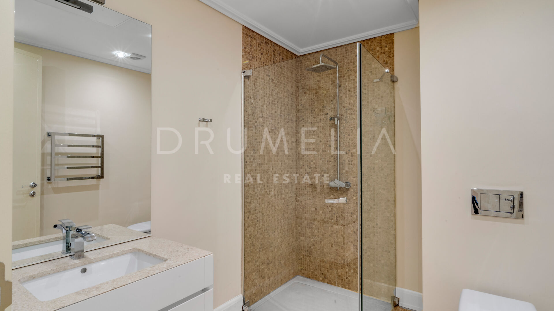 Im Obergeschoss befinden sich drei Schlafzimmer, jeweils mit eigenem Bad, die höchsten Komfort und Privatsphäre bieten. Eine sonnige Terrasse mit teilweisem Meerblick macht diese Etage besonders attraktiv.