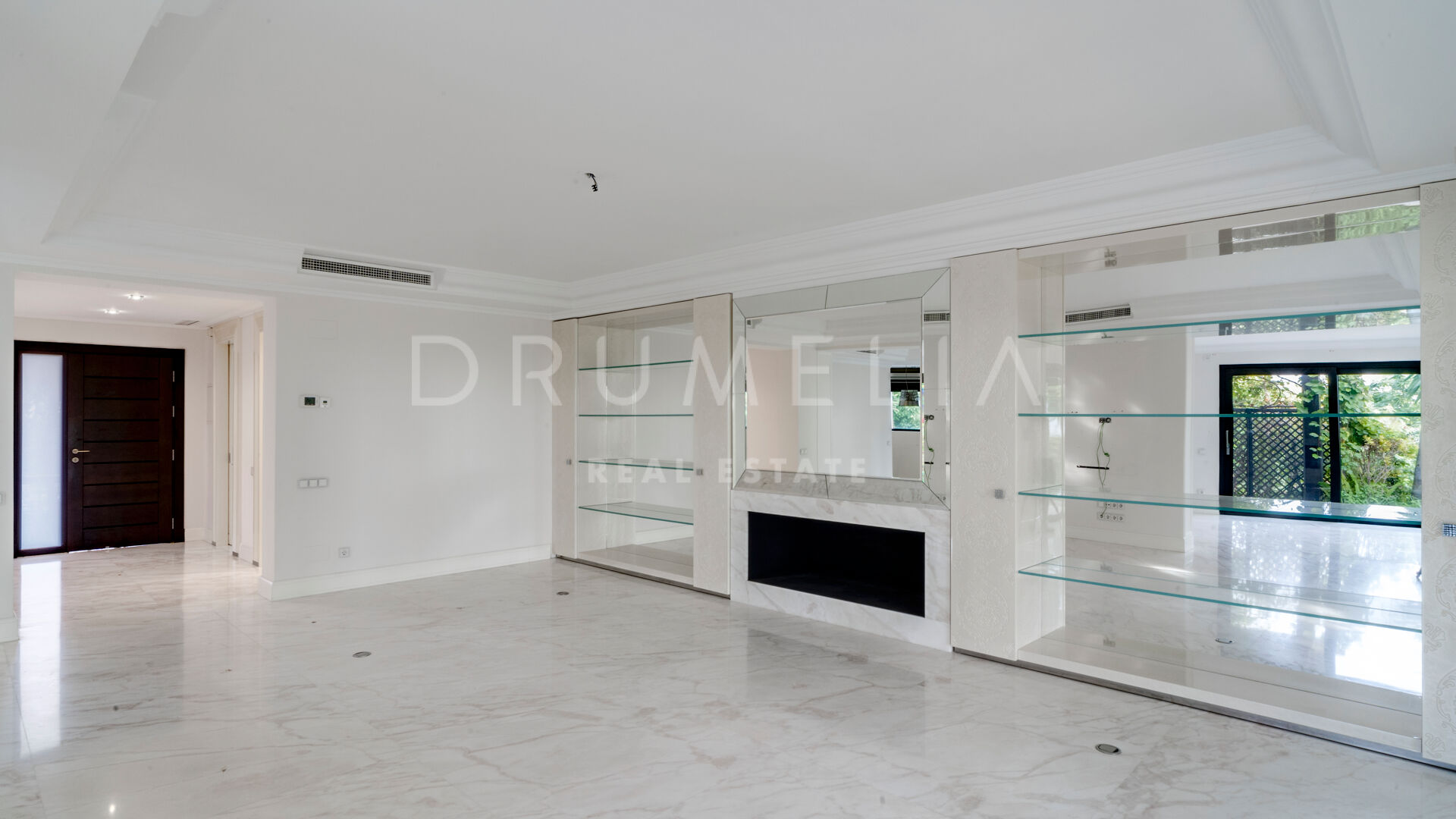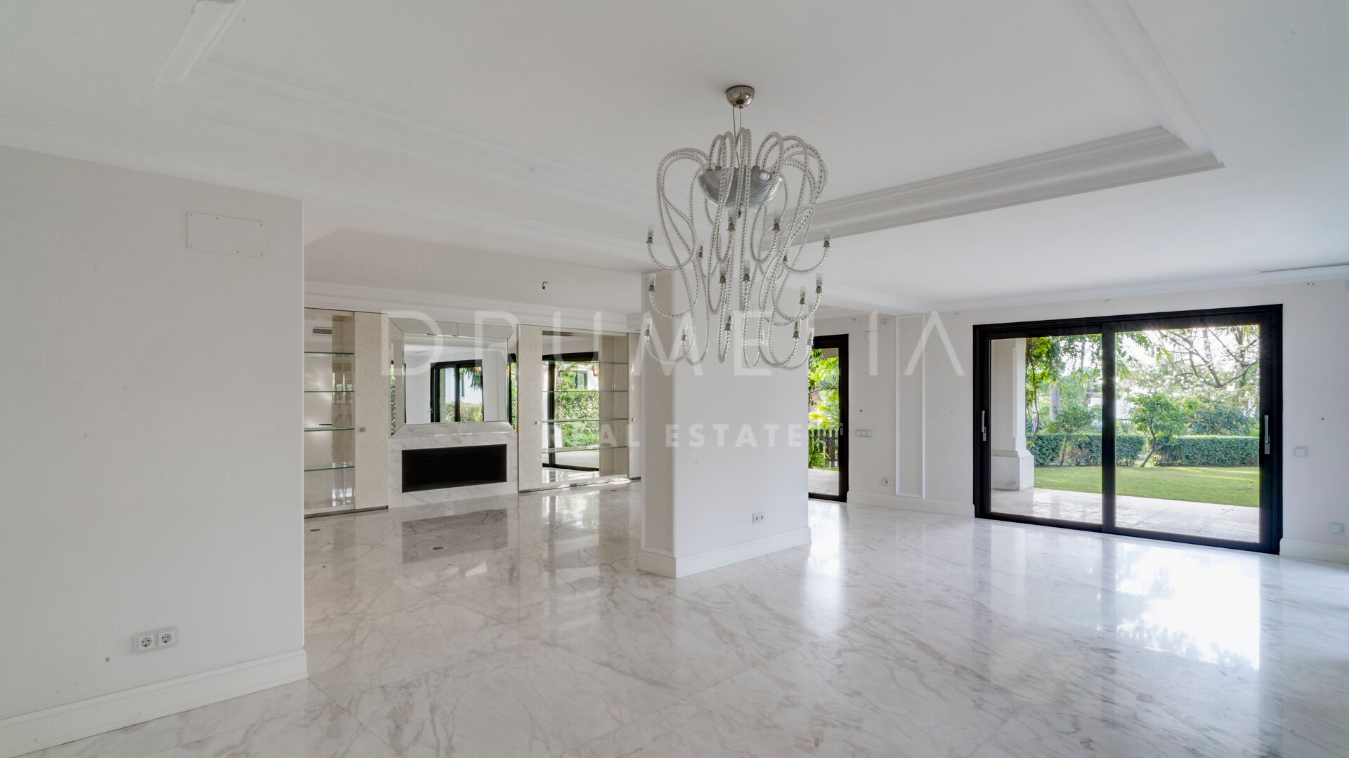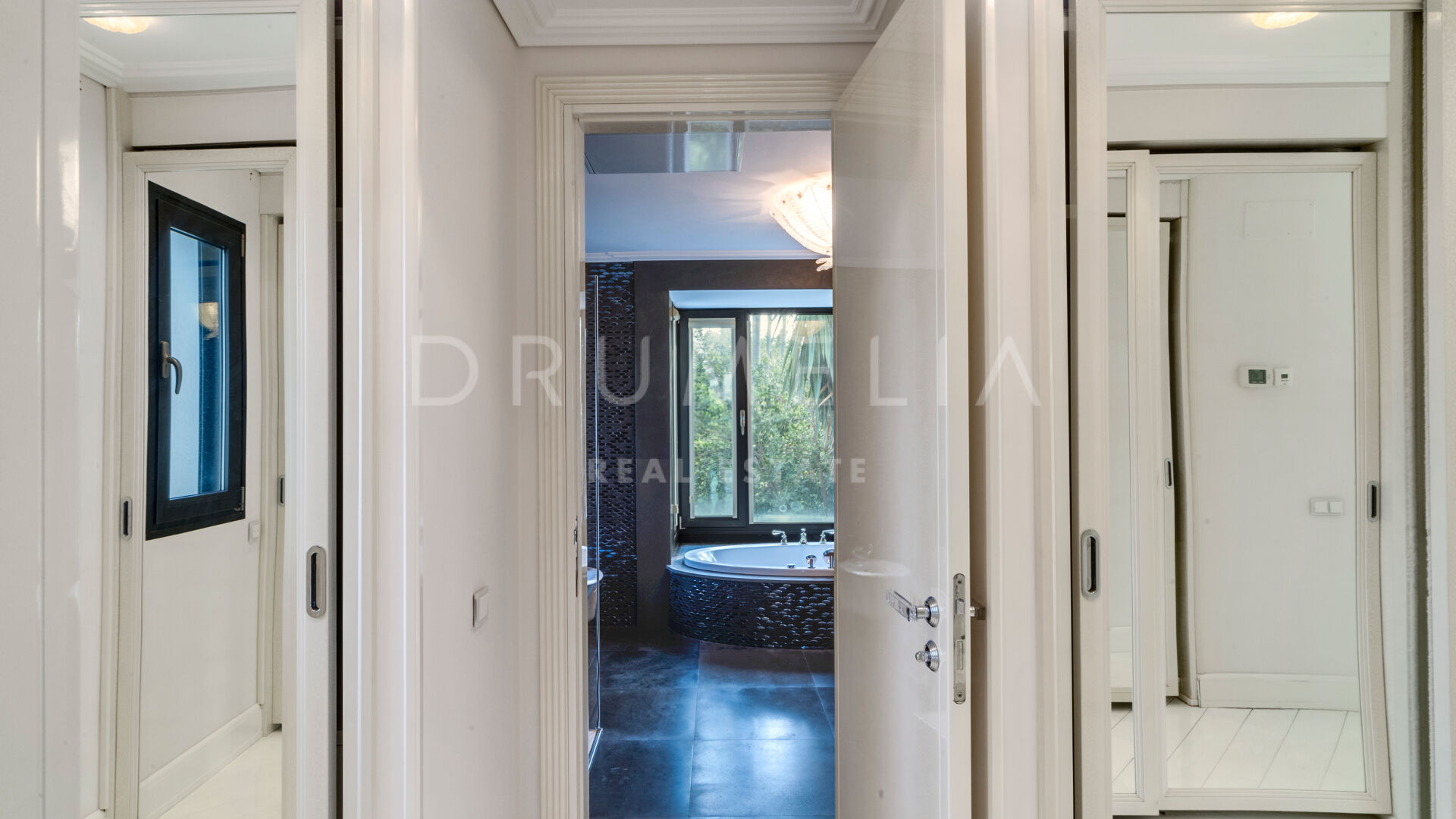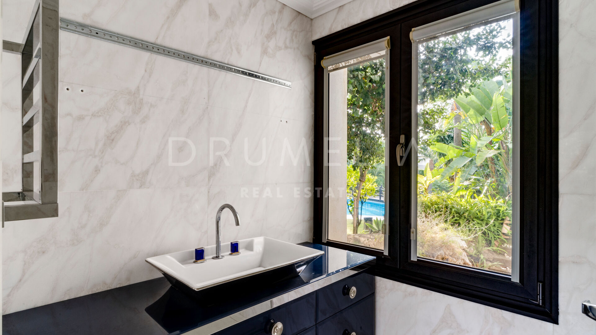 Atemberaubende Luxusvilla mit Südwestausrichtung in Lomas de Magna Marbella, einer der exklusivsten Wohnanlagen an der berühmten Goldenen Meile von Marbella. Diese außergewöhnliche Immobilie befindet sich in einer gesicherten Wohnanlage mit 24-Stunden-Sicherheitsdienst, zwei großen Gemeinschaftspools und wunderschön angelegten tropischen Gärten. Die erstklassige Lage bietet eine bequeme Anbindung an Supermärkte, Geschäfte, Restaurants, Schulen und Golfplätze und liegt nur fünf Autominuten vom Strand entfernt.