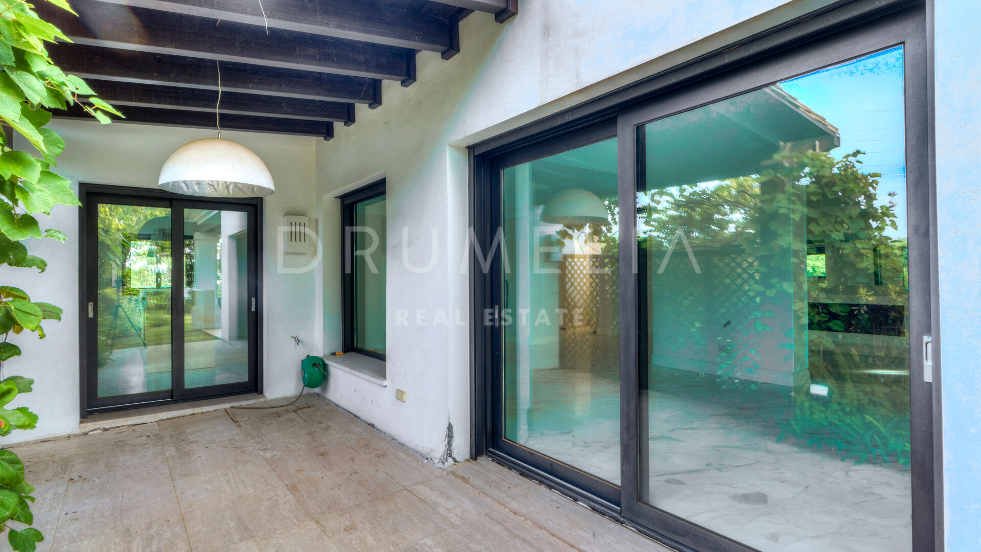 Die Villa erstreckt sich über drei Etagen und überzeugt mit einer durchdachten Raumaufteilung. Im Erdgeschoss führt eine elegante Eingangshalle in ein großzügiges Wohnzimmer mit direktem Zugang zu einer teilüberdachten Terrasse. Dieser Außenbereich, umgeben von tropischen Gärten, verfügt über Ess- und Loungebereiche sowie einen privaten Zugang zum Gemeinschaftspool. Zudem befinden sich auf dieser Etage ein helles Schlafzimmer mit eigenem Bad, eine große, voll ausgestattete Küche und ein Gäste-WC.