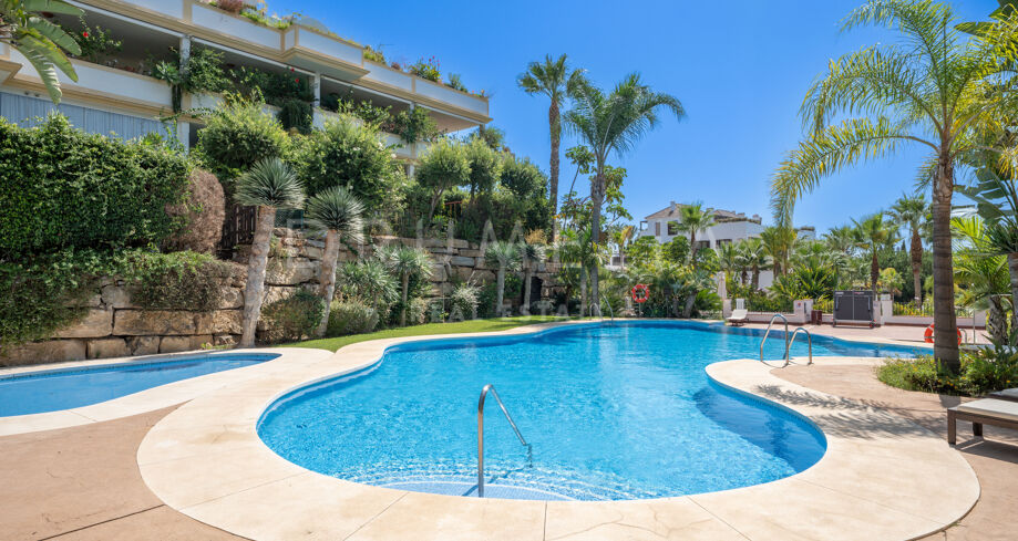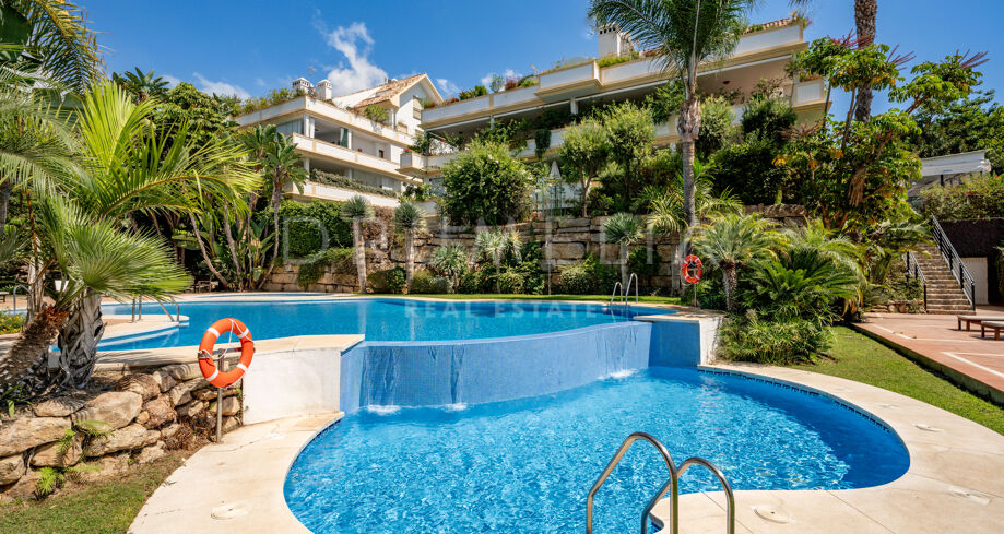 Dieses atemberaubende 4-Schlafzimmer-Penthouse steht zum Verkauf an der berühmten Goldenen Meile von Marbella. Umgeben von subtropischer Vegetation und hochwertigen Immobilien in der renommierten Gegend ist die bewachte Wohnanlage Lomas del Rey eine exklusive Wohnanlage, die von einem angesehenen örtlichen Architekten entworfen und aus den hochwertigsten Materialien und Spezifikationen gebaut wurde. Eingebettet zwischen Meer und Bergen und mit unvergesslichem Blick genießen Sie nur wenige Minuten Fahrt zum nächsten Strand (oder zu Fuß erreichbar), Designer-Boutiquen und den berühmten Puente Romano und Marbella Club Resorts mit ihren luxuriösen Annehmlichkeiten, Michelin-Sterne-Restaurants und Bio-Restaurants, Strandbars und Beachclubs, Wellness- und Spa-Zentren sowie einem bekannten Tennisclub. Alle Annehmlichkeiten von Marbella-Center, Puerto Banus und dem Golf Valley von Nueva Andalucia sind auch nur 5 Autominuten entfernt. Sie werden Privatsphäre mit Nähe zum schönen Nagüeles Park und schnellem Zugang zur Autobahn AP-7 genießen.