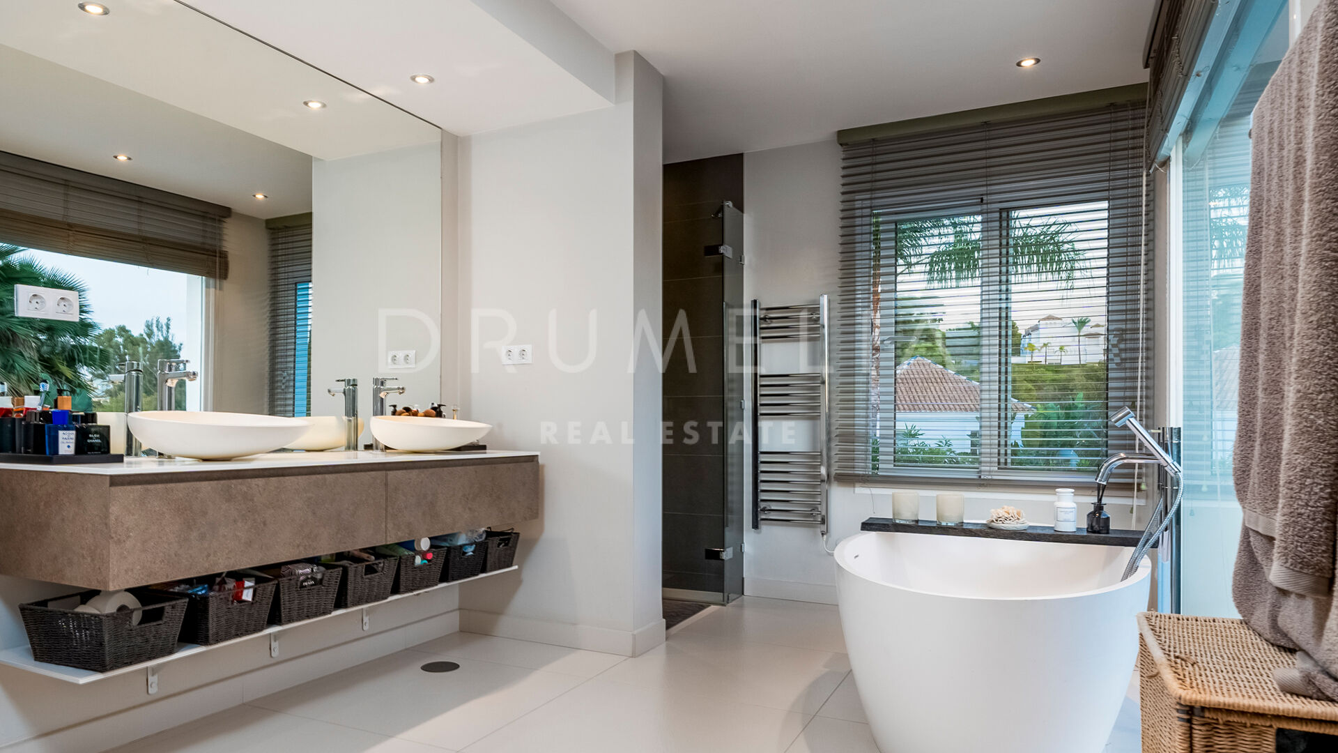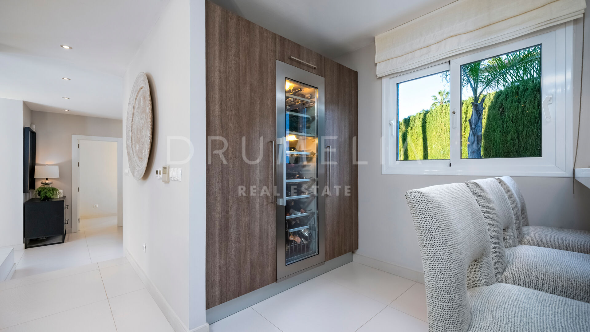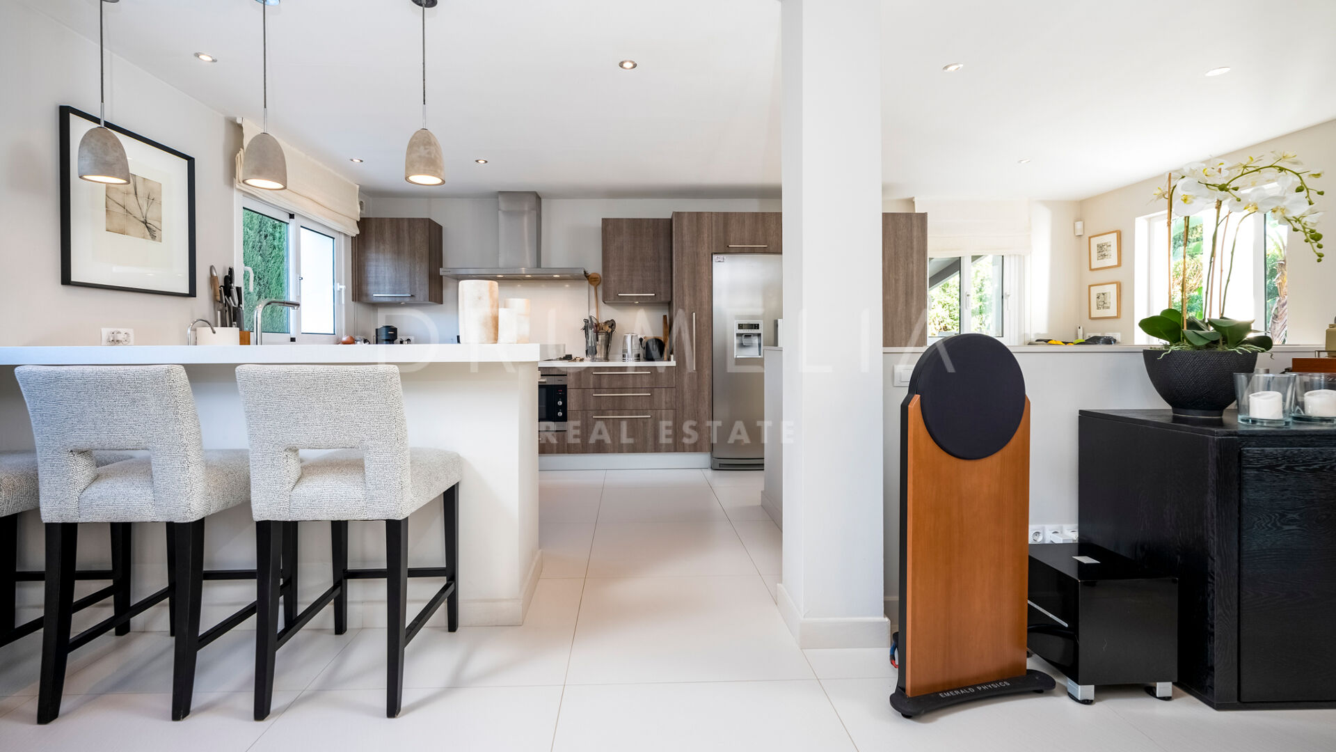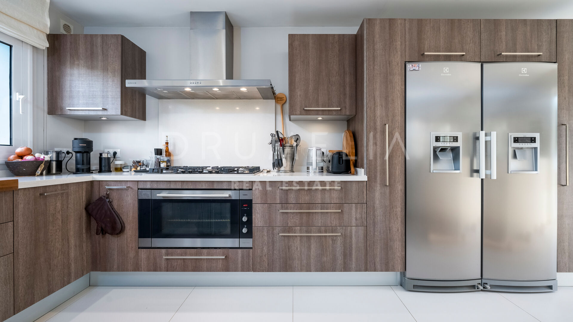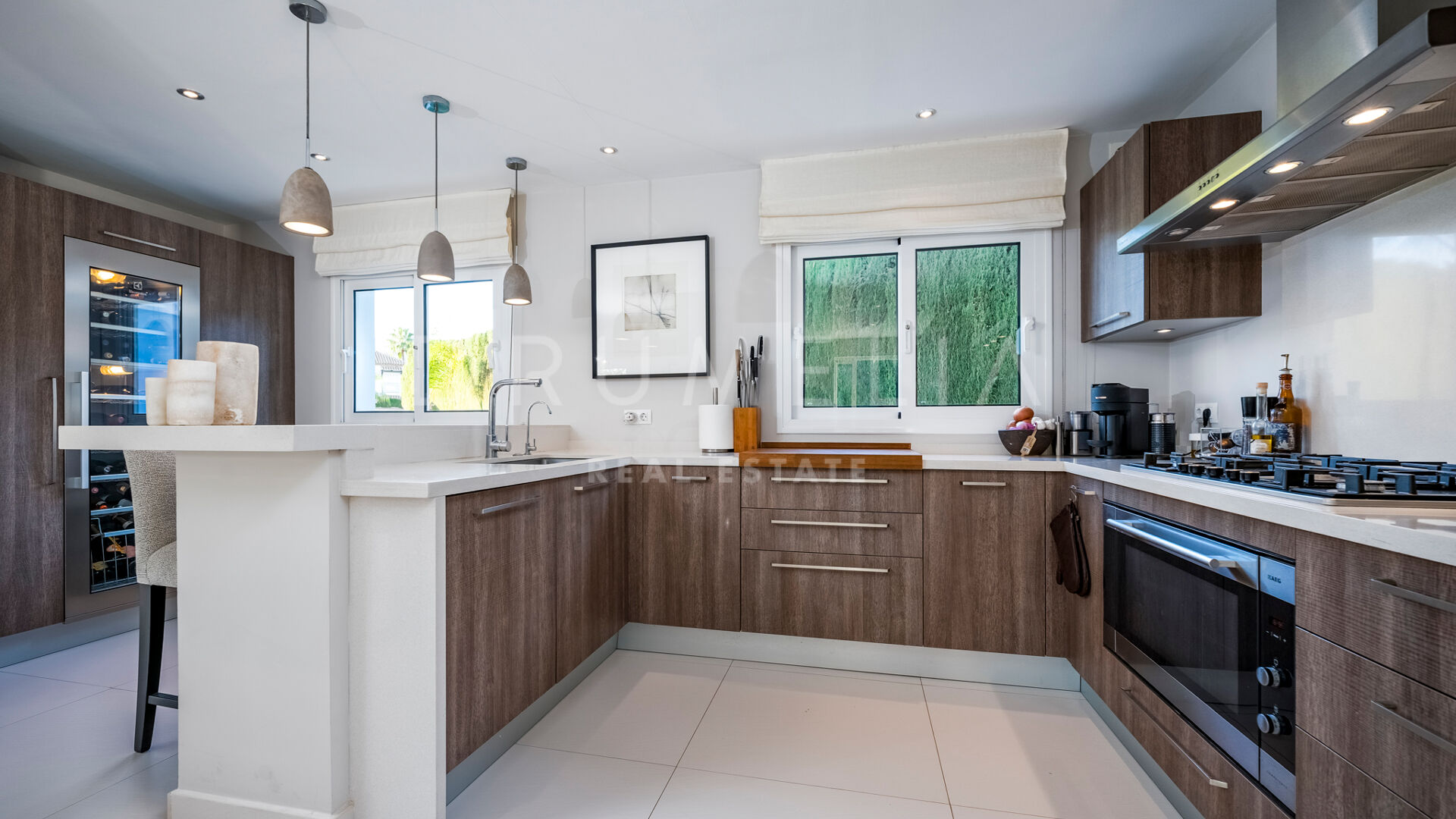 Umgeben von ähnlichen Luxusimmobilien und Golfplätzen des Golftals von Nueva Andalucia, liegt das 4-Schlafzimmer-Haus mit 418 m² (einschließlich 190 m² Terrassen) auf einem privaten und ruhigen Eckgrundstück von 1.000 m². Es ist nach Süden und Westen ausgerichtet und bietet einen herrlichen Blick auf die subtropische Vegetation. Im Erdgeschoss gibt es ein wunderschönes Wohnzimmer mit einem modernen Designer-Holzofen mit Thermostatventilator und einem eigenen, geschlossenen Holzlager im Freien. Eine offene Lösung auf verschiedenen Ebenen trennt den Ess- und Küchenbereich strategisch vom Wohnbereich. Es gibt 4 Schlafzimmer, 5 Bäder und eine Gästetoilette auf zwei Ebenen sowie eine separate Waschküche im Keller. Die Master-Suite hat einen begehbaren Kleiderschrank, eine private Terrasse und ein luxuriöses Badezimmer mit einer maßgefertigten freistehenden Badewanne aus Stein und einer übergroßen Dusche. Es gibt ein Mezzanin-Arbeitszimmer mit Blick auf das Wohnzimmer, einen Weinkeller und einen privaten Stellplatz für zwei Autos auf dem Grundstück. Im Außenbereich gibt es einen Garten mit einem schönen Pool, Chill-out-Bereiche und eine voll ausgestattete Außenküche mit integriertem Gaspizzaofen, Gasgrill und Holz-/Holzkohlegrill, Kühlschrank und Bar mit Weinkühler, perfekt für Familientreffen oder Partys mit deinen Freunden.