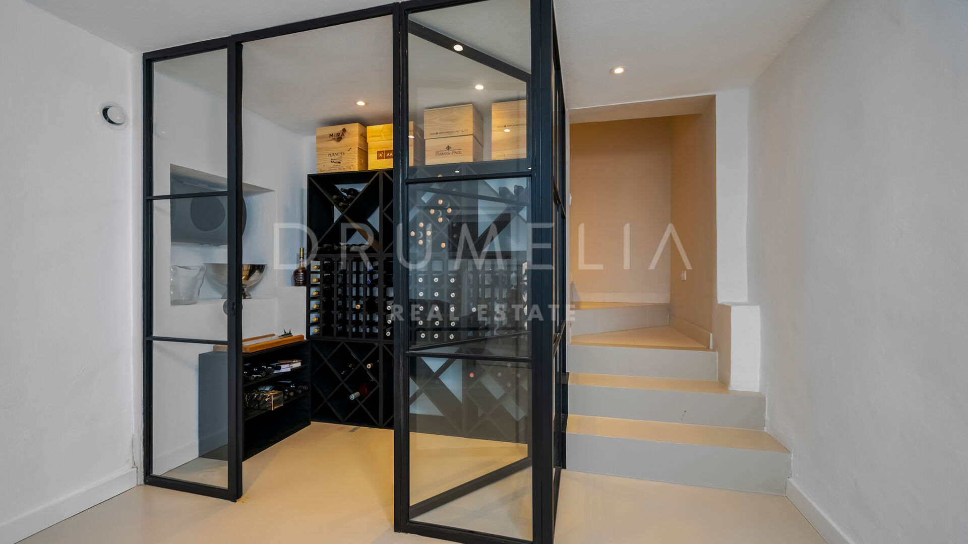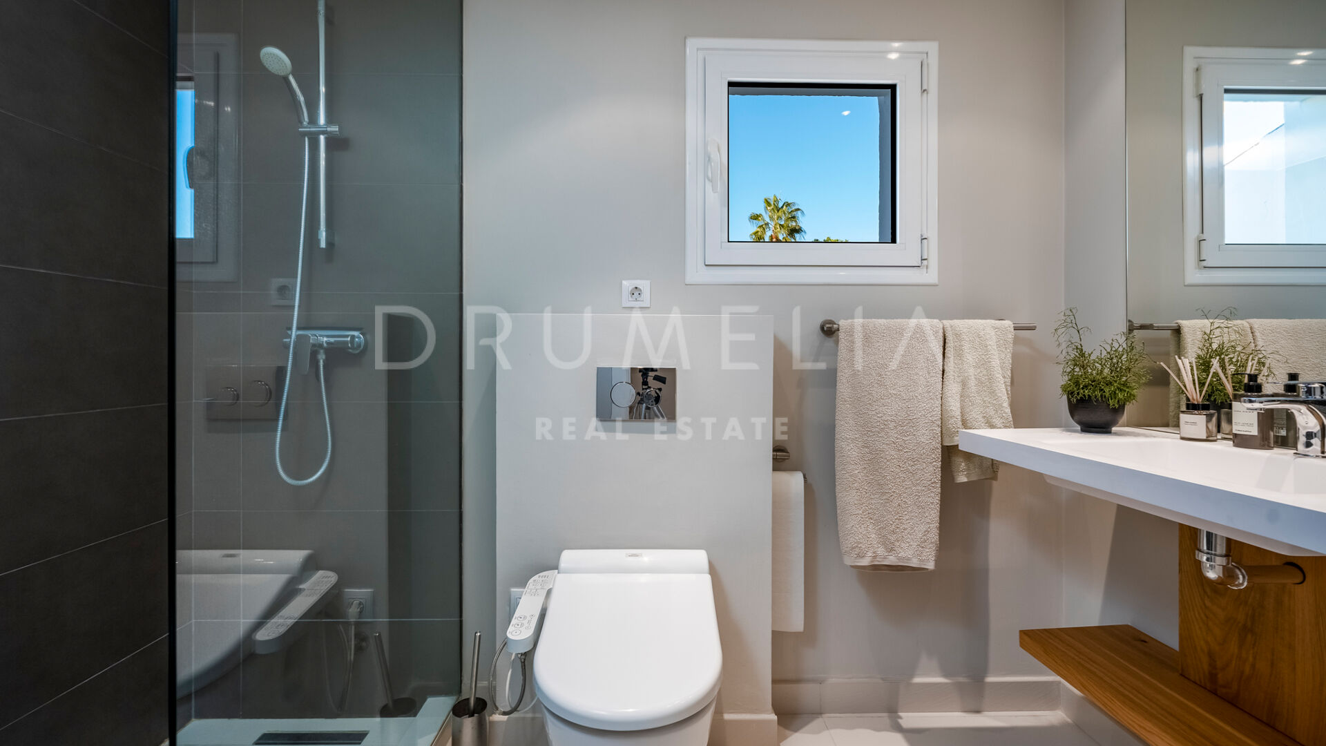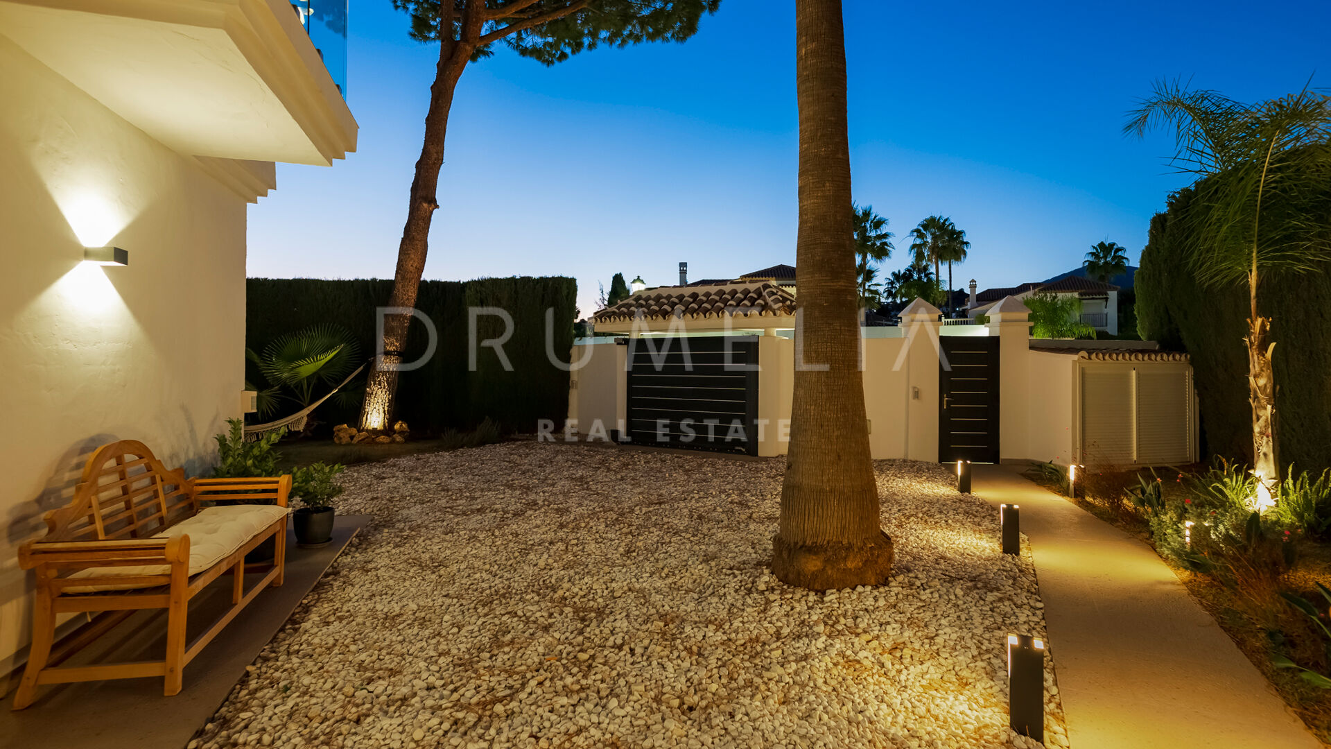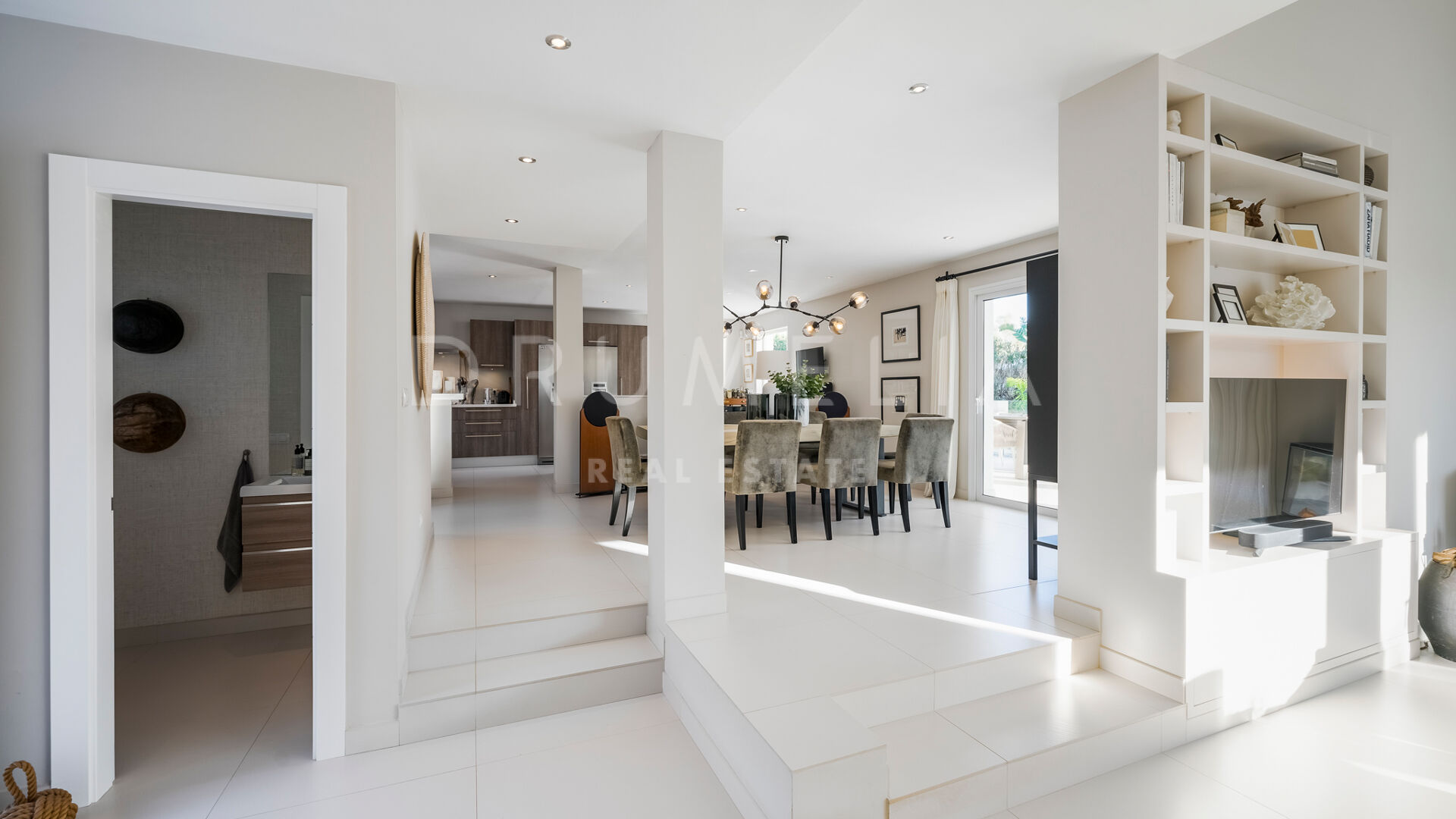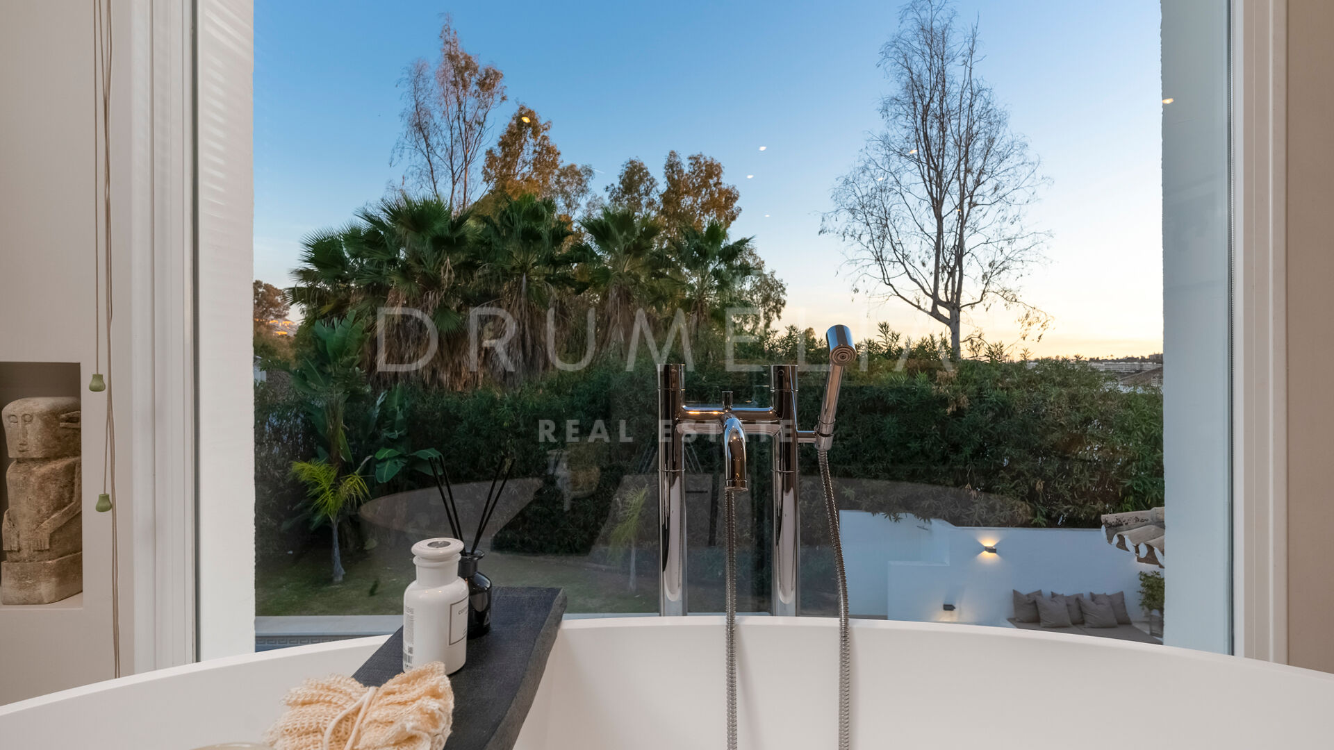 Umgeben von ähnlichen Luxusimmobilien und Golfplätzen des Golftals von Nueva Andalucia, liegt das 4-Schlafzimmer-Haus mit 418 m² (einschließlich 190 m² Terrassen) auf einem privaten und ruhigen Eckgrundstück von 1.000 m². Es ist nach Süden und Westen ausgerichtet und bietet einen herrlichen Blick auf die subtropische Vegetation. Im Erdgeschoss gibt es ein wunderschönes Wohnzimmer mit einem modernen Designer-Holzofen mit Thermostatventilator und einem eigenen, geschlossenen Holzlager im Freien. Eine offene Lösung auf verschiedenen Ebenen trennt den Ess- und Küchenbereich strategisch vom Wohnbereich. Es gibt 4 Schlafzimmer, 5 Bäder und eine Gästetoilette auf zwei Ebenen sowie eine separate Waschküche im Keller. Die Master-Suite hat einen begehbaren Kleiderschrank, eine private Terrasse und ein luxuriöses Badezimmer mit einer maßgefertigten freistehenden Badewanne aus Stein und einer übergroßen Dusche. Es gibt ein Mezzanin-Arbeitszimmer mit Blick auf das Wohnzimmer, einen Weinkeller und einen privaten Stellplatz für zwei Autos auf dem Grundstück. Im Außenbereich gibt es einen Garten mit einem schönen Pool, Chill-out-Bereiche und eine voll ausgestattete Außenküche mit integriertem Gaspizzaofen, Gasgrill und Holz-/Holzkohlegrill, Kühlschrank und Bar mit Weinkühler, perfekt für Familientreffen oder Partys mit deinen Freunden.