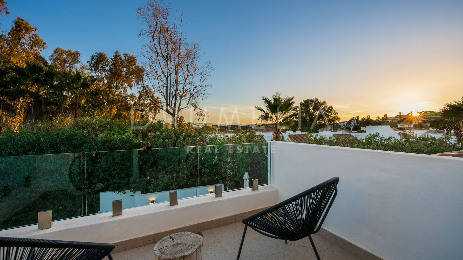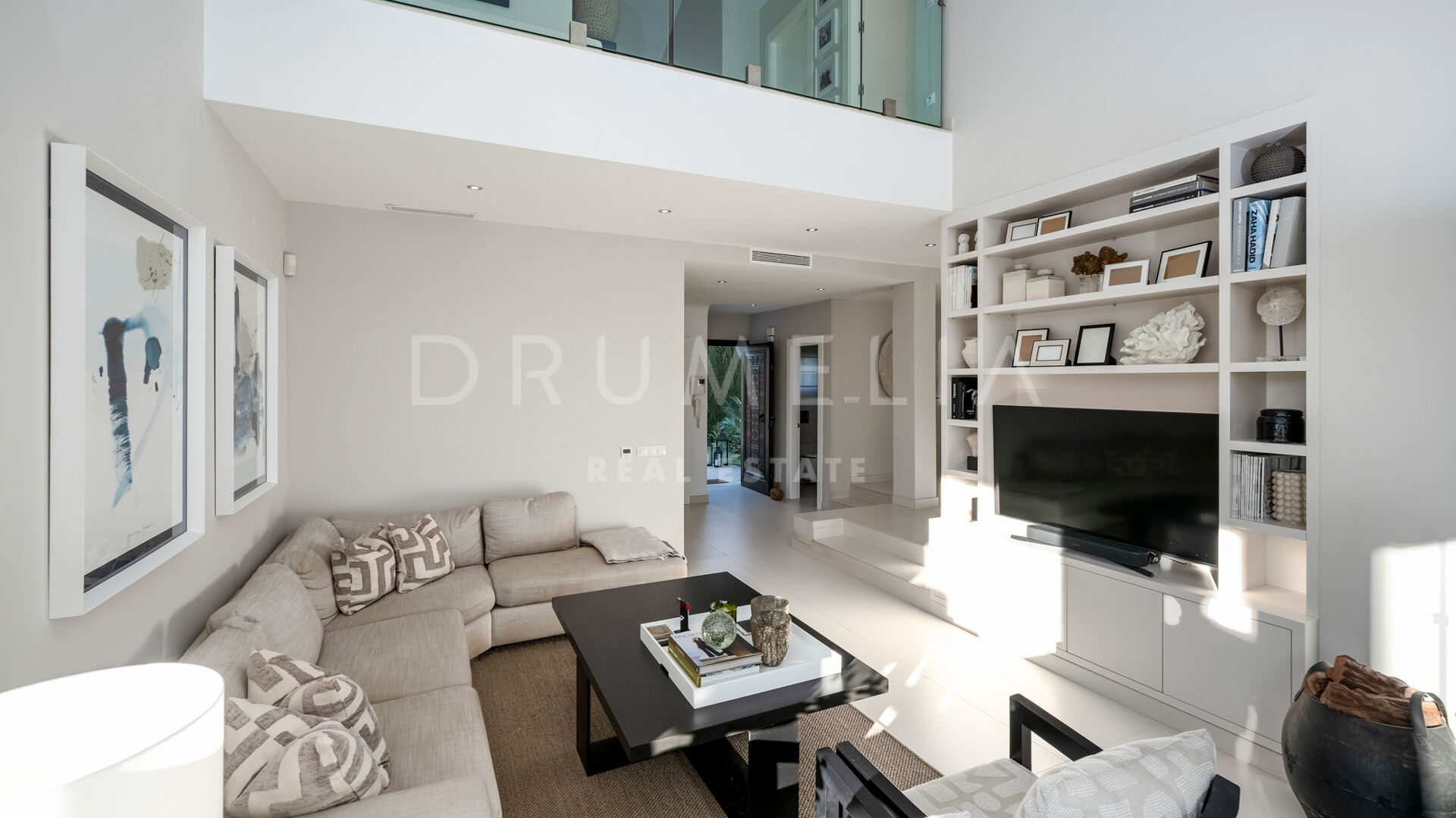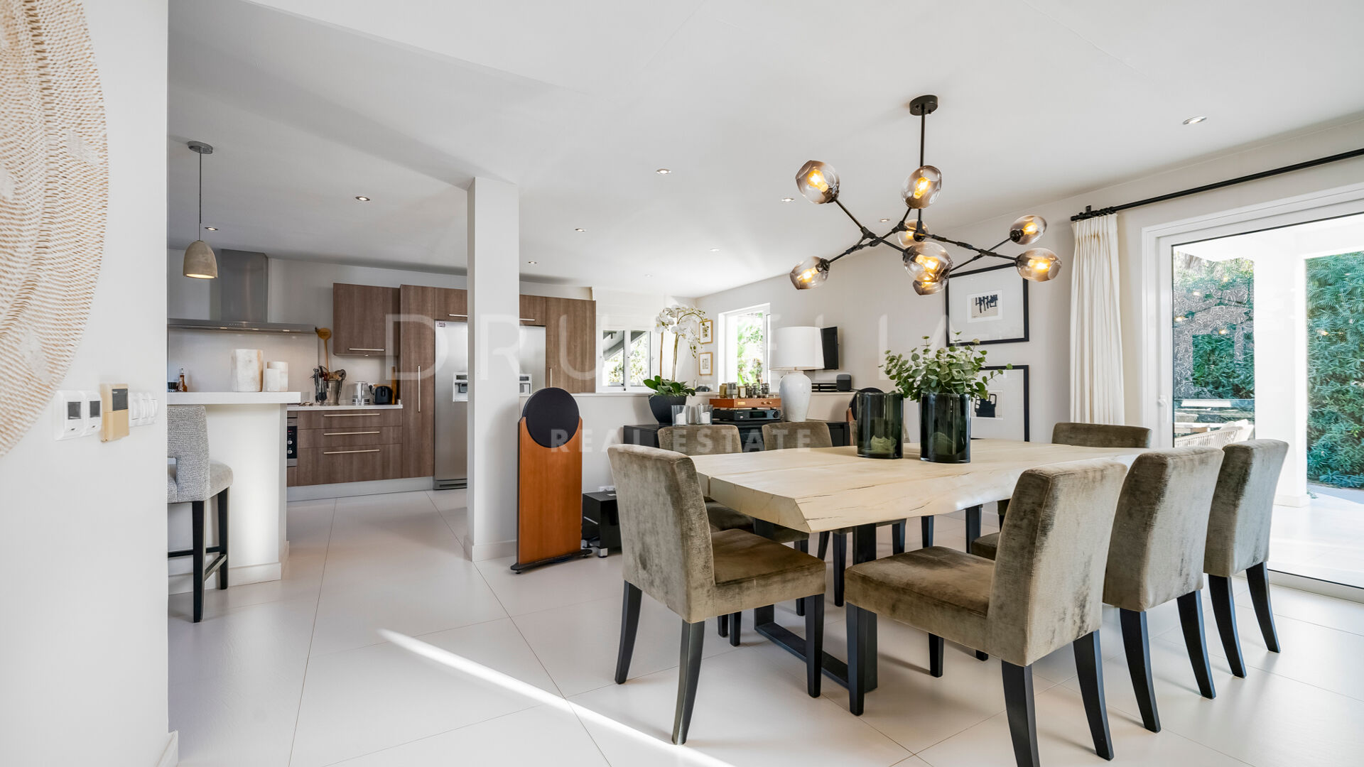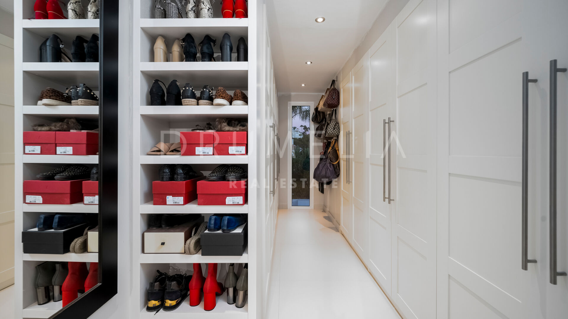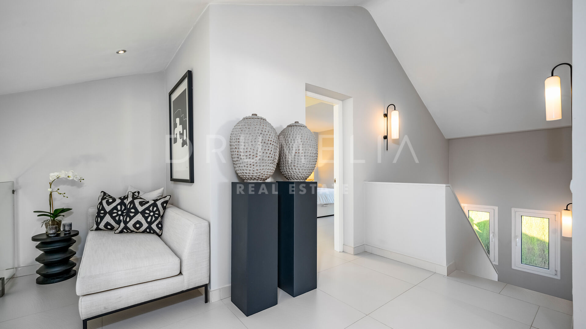 Umgeben von ähnlichen Luxusimmobilien und Golfplätzen des Golftals von Nueva Andalucia, liegt das 4-Schlafzimmer-Haus mit 418 m² (einschließlich 190 m² Terrassen) auf einem privaten und ruhigen Eckgrundstück von 1.000 m². Es ist nach Süden und Westen ausgerichtet und bietet einen herrlichen Blick auf die subtropische Vegetation. Im Erdgeschoss gibt es ein wunderschönes Wohnzimmer mit einem modernen Designer-Holzofen mit Thermostatventilator und einem eigenen, geschlossenen Holzlager im Freien. Eine offene Lösung auf verschiedenen Ebenen trennt den Ess- und Küchenbereich strategisch vom Wohnbereich. Es gibt 4 Schlafzimmer, 5 Bäder und eine Gästetoilette auf zwei Ebenen sowie eine separate Waschküche im Keller. Die Master-Suite hat einen begehbaren Kleiderschrank, eine private Terrasse und ein luxuriöses Badezimmer mit einer maßgefertigten freistehenden Badewanne aus Stein und einer übergroßen Dusche. Es gibt ein Mezzanin-Arbeitszimmer mit Blick auf das Wohnzimmer, einen Weinkeller und einen privaten Stellplatz für zwei Autos auf dem Grundstück. Im Außenbereich gibt es einen Garten mit einem schönen Pool, Chill-out-Bereiche und eine voll ausgestattete Außenküche mit integriertem Gaspizzaofen, Gasgrill und Holz-/Holzkohlegrill, Kühlschrank und Bar mit Weinkühler, perfekt für Familientreffen oder Partys mit deinen Freunden.
