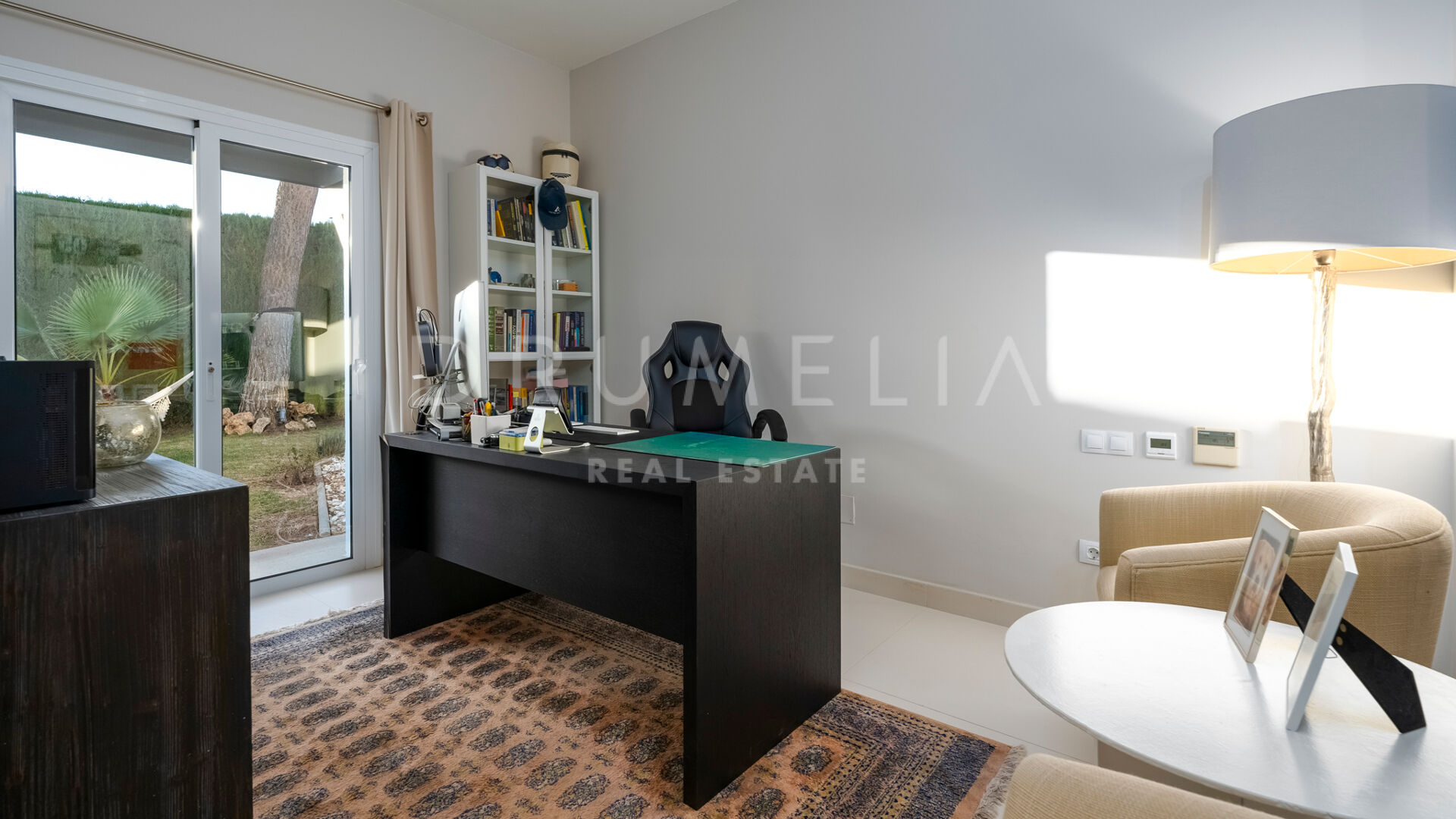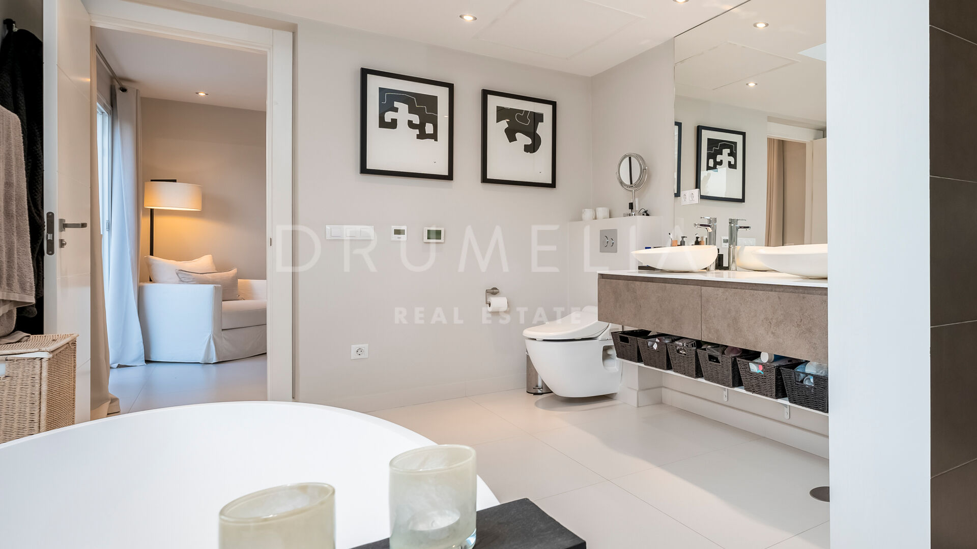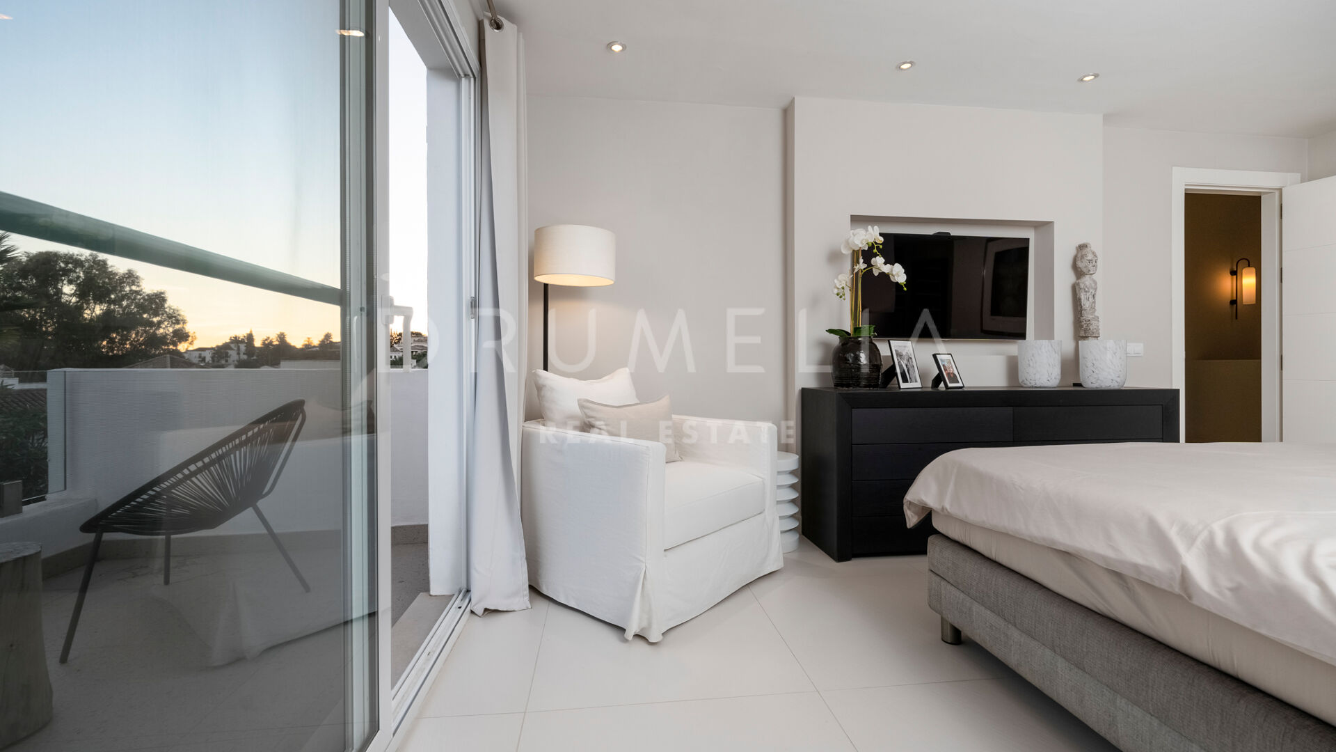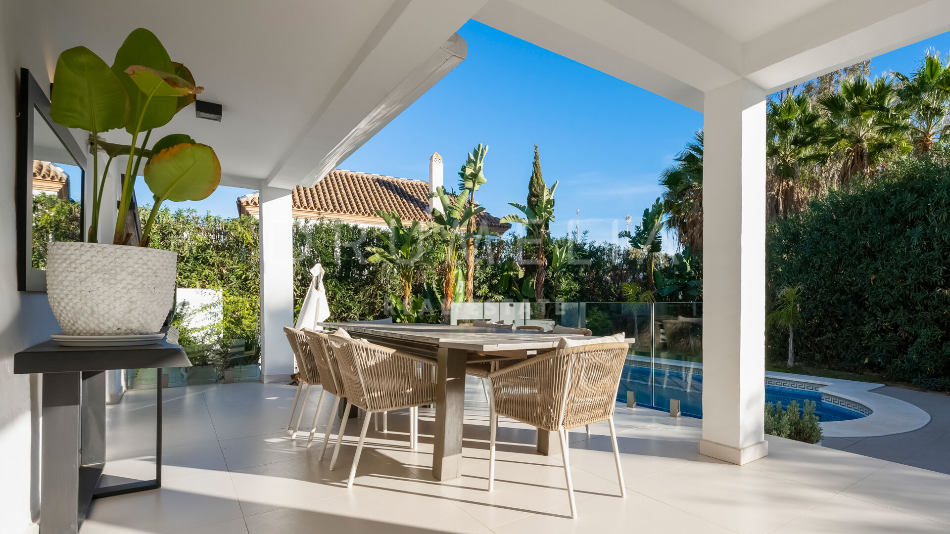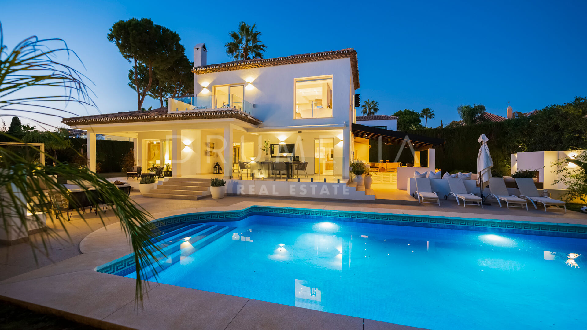 Umgeben von ähnlichen Luxusimmobilien und Golfplätzen des Golftals von Nueva Andalucia, liegt das 4-Schlafzimmer-Haus mit 418 m² (einschließlich 190 m² Terrassen) auf einem privaten und ruhigen Eckgrundstück von 1.000 m². Es ist nach Süden und Westen ausgerichtet und bietet einen herrlichen Blick auf die subtropische Vegetation. Im Erdgeschoss gibt es ein wunderschönes Wohnzimmer mit einem modernen Designer-Holzofen mit Thermostatventilator und einem eigenen, geschlossenen Holzlager im Freien. Eine offene Lösung auf verschiedenen Ebenen trennt den Ess- und Küchenbereich strategisch vom Wohnbereich. Es gibt 4 Schlafzimmer, 5 Bäder und eine Gästetoilette auf zwei Ebenen sowie eine separate Waschküche im Keller. Die Master-Suite hat einen begehbaren Kleiderschrank, eine private Terrasse und ein luxuriöses Badezimmer mit einer maßgefertigten freistehenden Badewanne aus Stein und einer übergroßen Dusche. Es gibt ein Mezzanin-Arbeitszimmer mit Blick auf das Wohnzimmer, einen Weinkeller und einen privaten Stellplatz für zwei Autos auf dem Grundstück. Im Außenbereich gibt es einen Garten mit einem schönen Pool, Chill-out-Bereiche und eine voll ausgestattete Außenküche mit integriertem Gaspizzaofen, Gasgrill und Holz-/Holzkohlegrill, Kühlschrank und Bar mit Weinkühler, perfekt für Familientreffen oder Partys mit deinen Freunden.