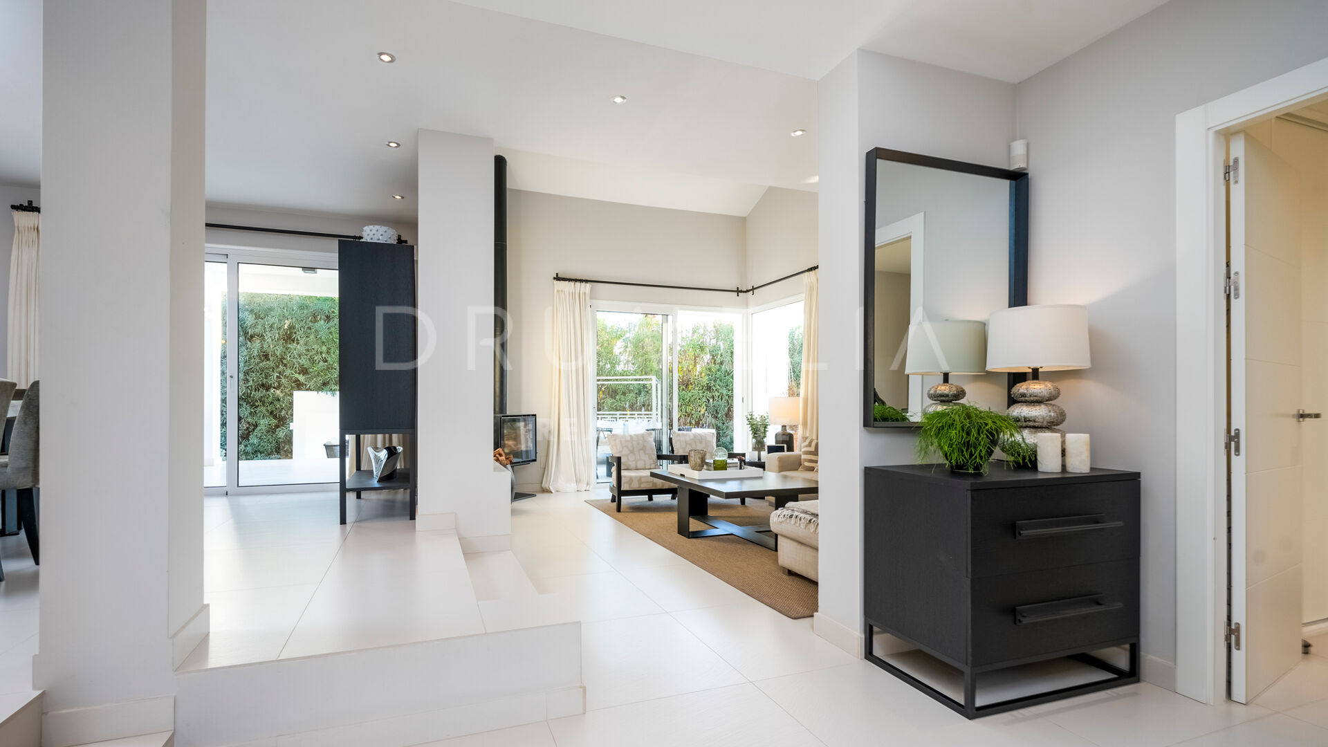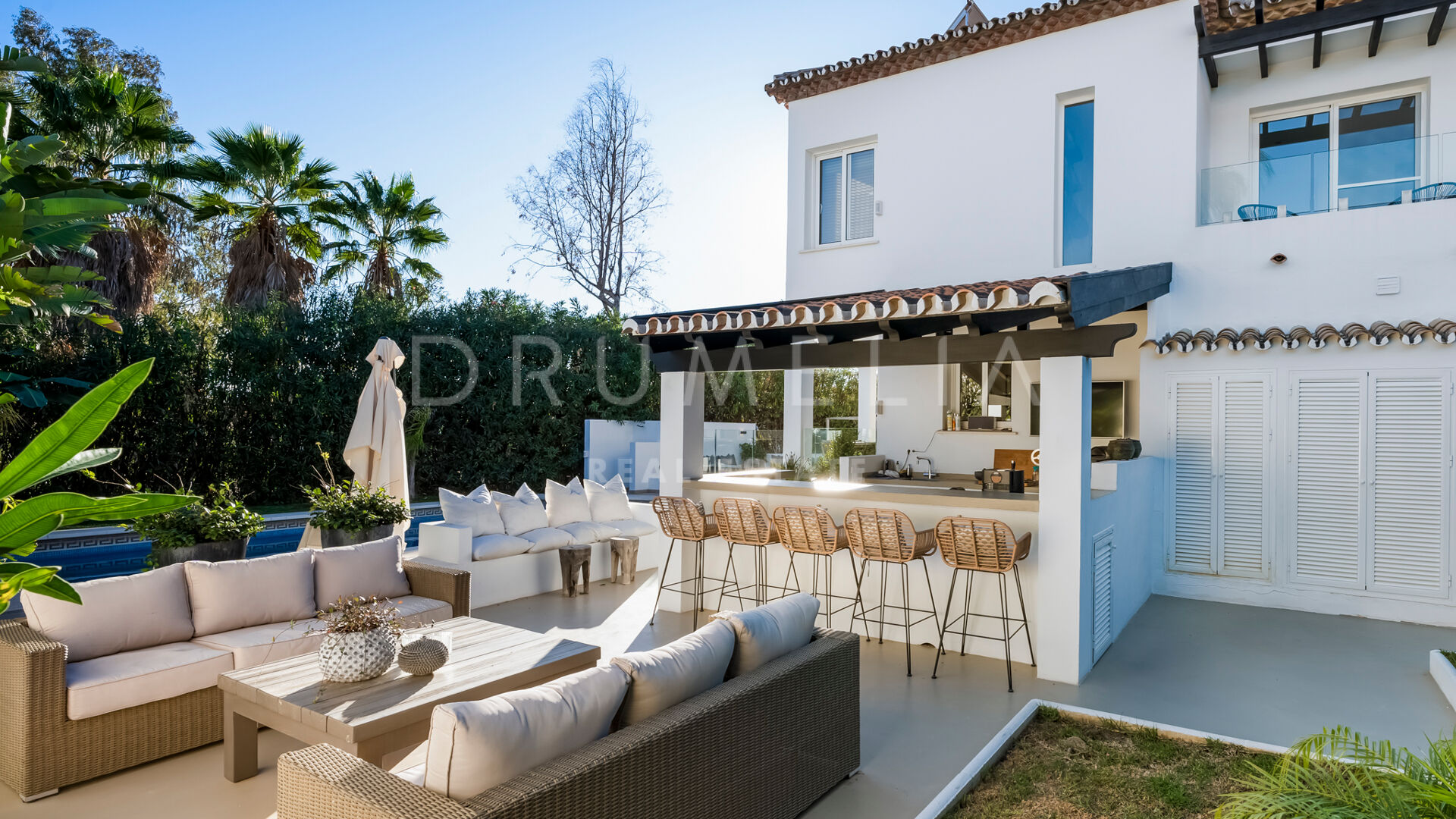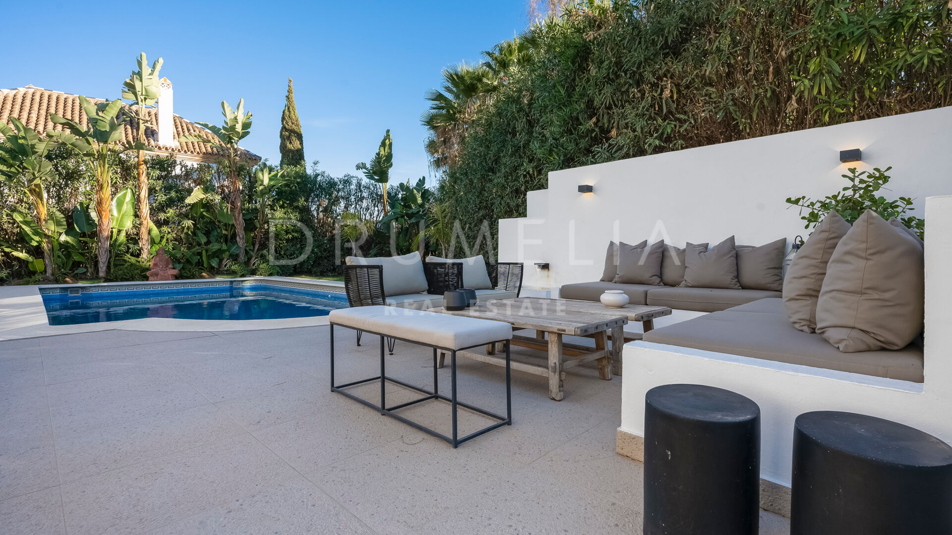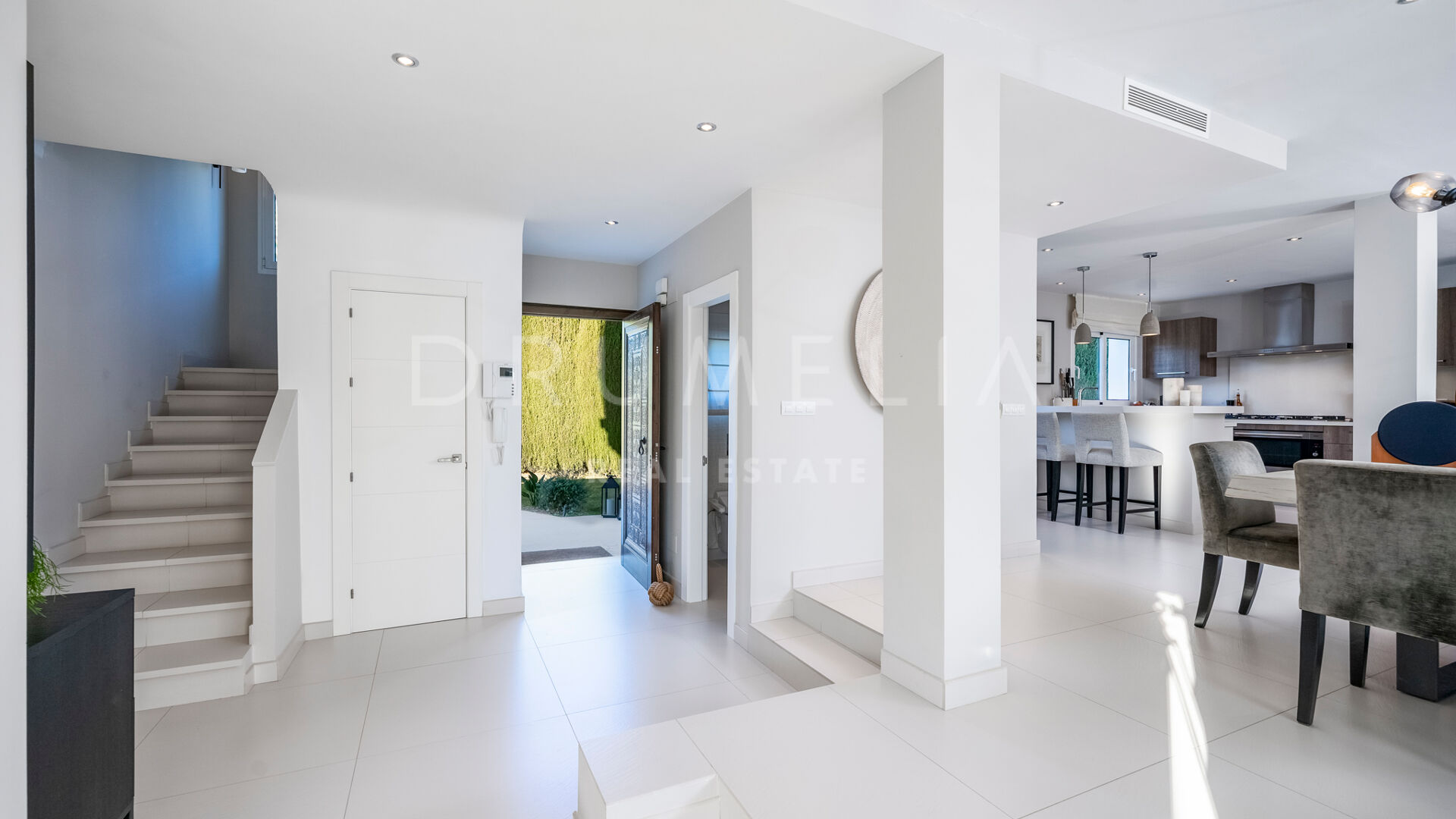 Dieses charmante, schlüsselfertige Haus im andalusischen Stil befindet sich in idealer Lage in Nueva Andalucia in einer ruhigen, bewachten und gesicherten Urbanisation des Marbella Country Club, einer gepflegten Anlage mit großartigen Nachbarn und elegant aussehenden Straßen. Sie liegt ca. 4 km vom legendären Puerto Banus, 5 km von den berühmten Luxushotels Puente Romano und Marbella Club an der Goldenen Meile, 10 km vom Zentrum Marbellas und 1,5 km vom Las Brisas Golf Club entfernt.