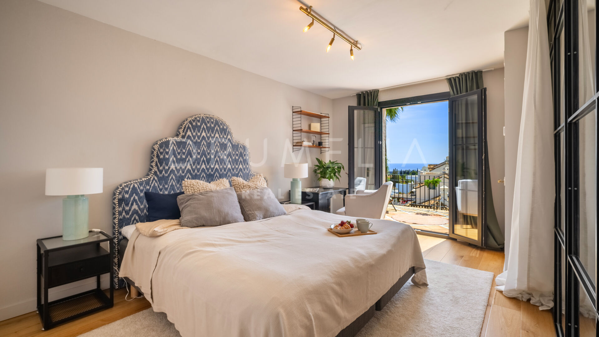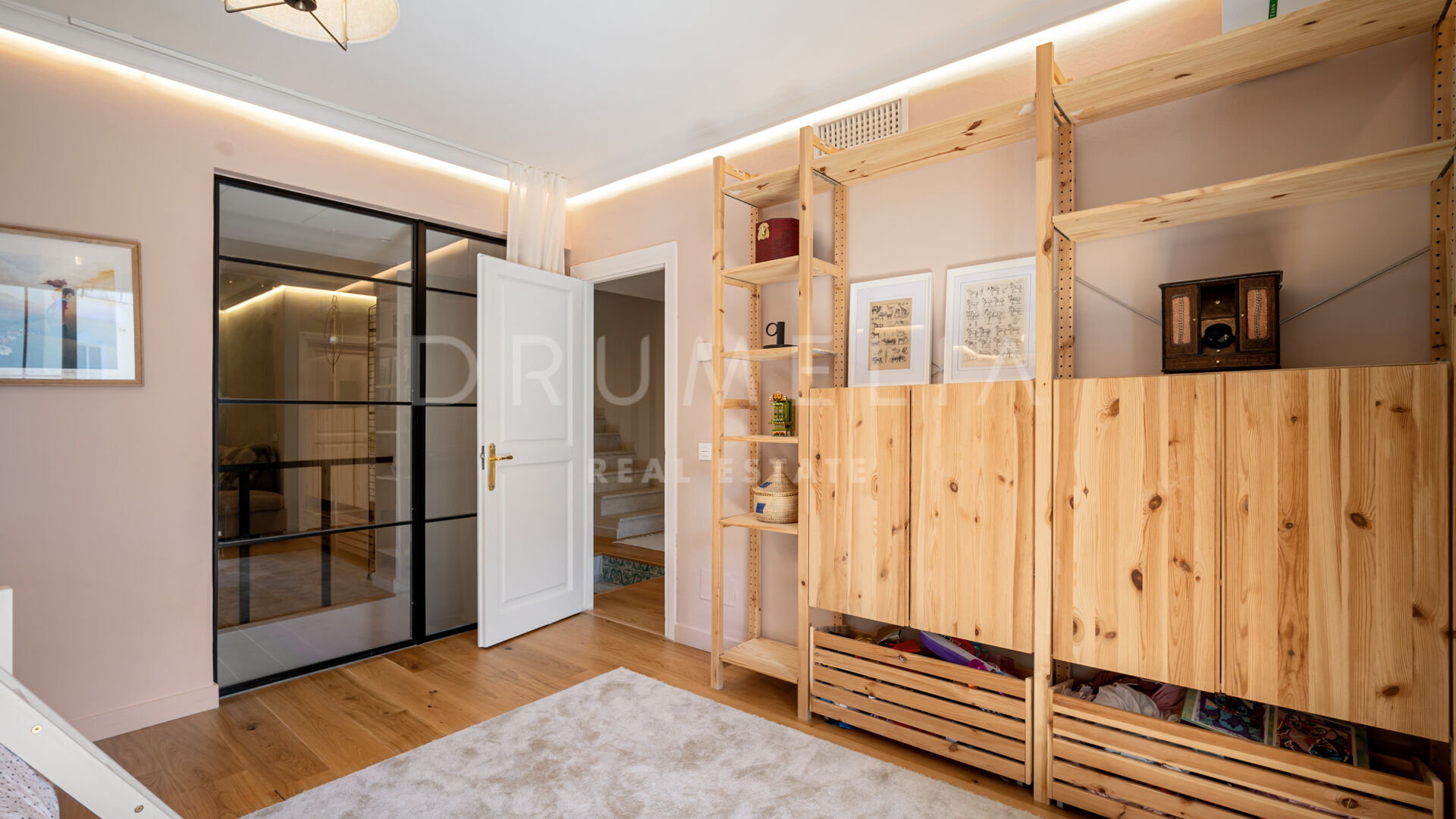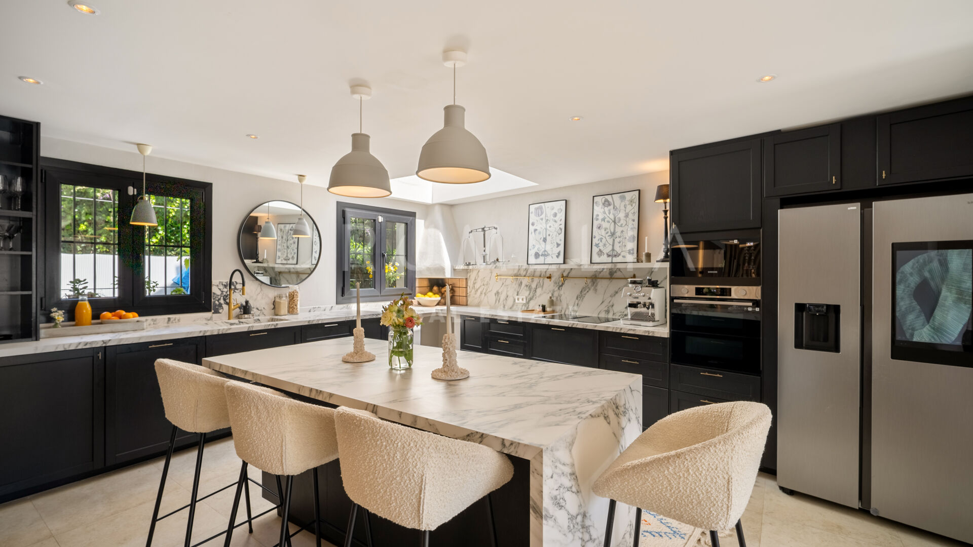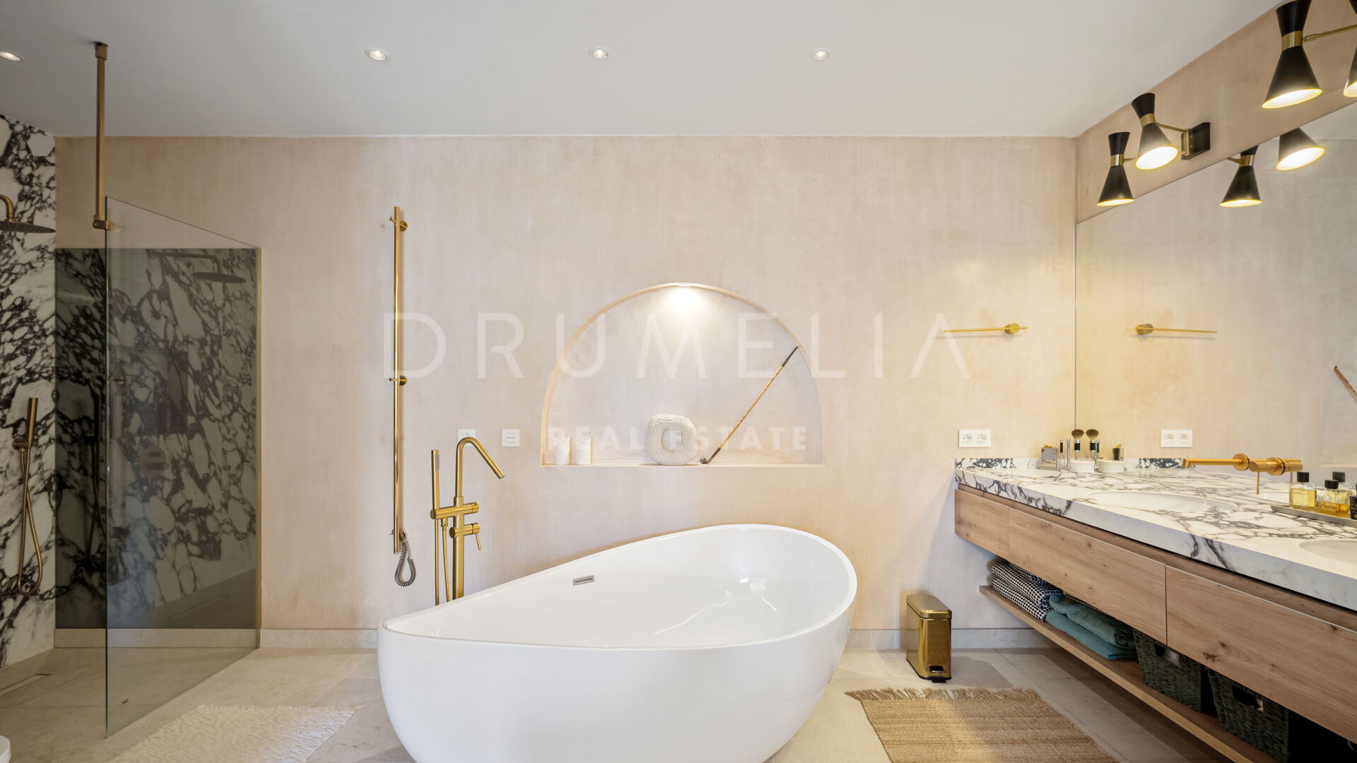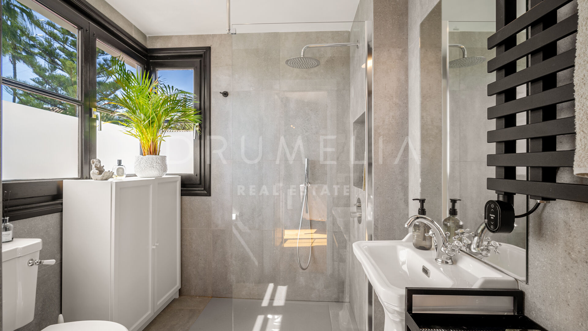 Das Untergeschoss vervollständigt das Angebot mit einem Gästezimmer, einer Chill-out-Lounge, einer privaten Sauna und einem kompletten Badezimmer, die auch als privater Garagenraum genutzt werden können. Das Haus befindet sich in einer geschlossenen Wohnanlage mit Sicherheit, Swimmingpool sowie Tennis- und Padelplätzen. Darüber hinaus verfügt es über nachhaltige Lösungen wie Solarpaneele, Ladestationen für Elektroautos und Fußbodenheizung, was es zu einer außergewöhnlichen Wahl für Familien oder diejenigen macht, die eine charaktervolle Residenz nur wenige Schritte vom Meer und den besten Services Marbellas suchen.