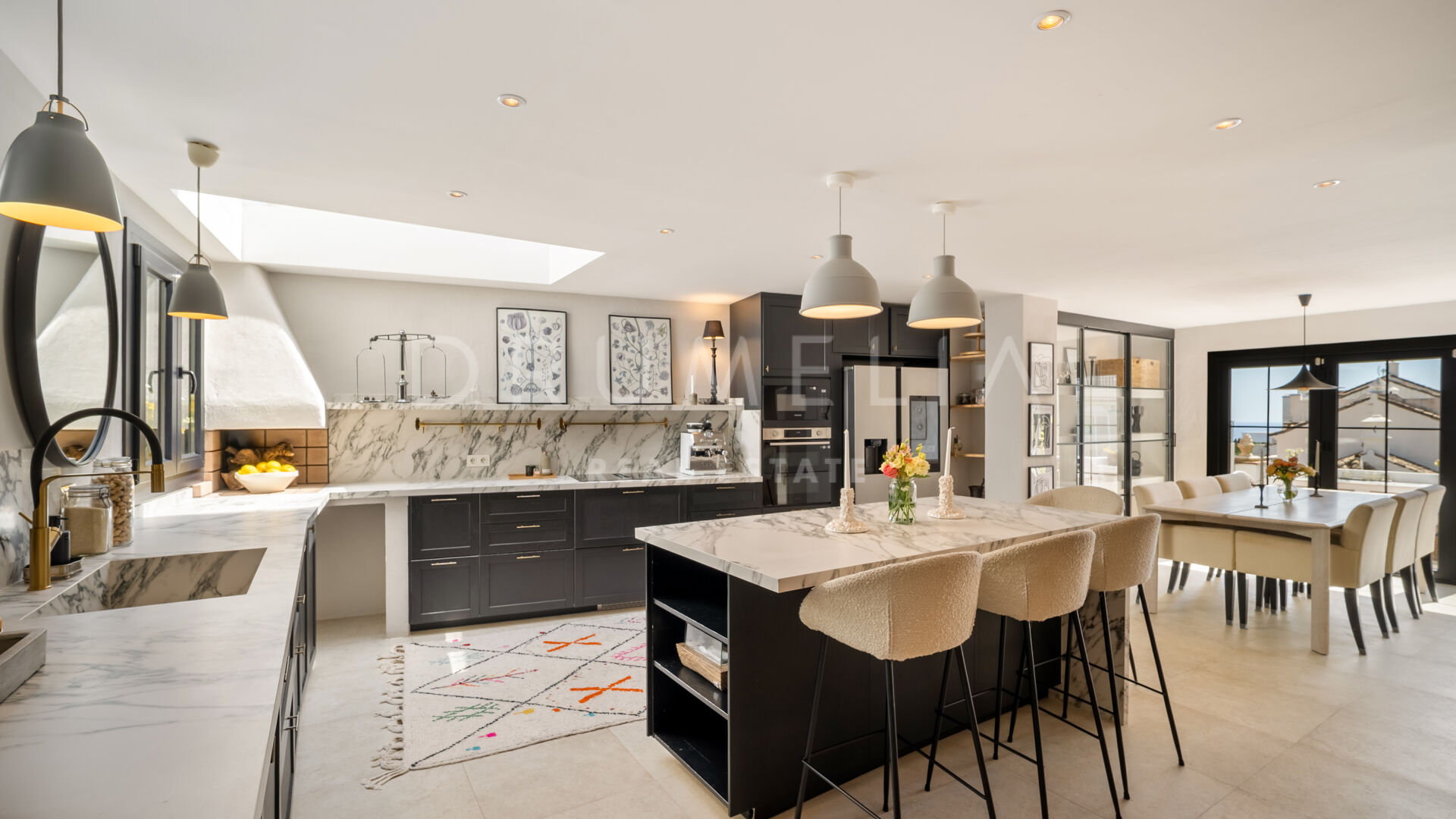 Das Haus erstreckt sich über mehrere Etagen. Im Erdgeschoss öffnet sich ein heller Wohnbereich mit Kamin zu einer modernen offenen Küche mit Essbereich, die wiederum mit einer großen, nach Süden ausgerichteten Terrasse verbunden ist. Diese Terrasse ist mit einem Außenessbereich, Grill und spektakulärem Blick auf das Mittelmeer ausgestattet und eignet sich perfekt, um das privilegierte Klima der Costa del Sol das ganze Jahr über zu genießen.