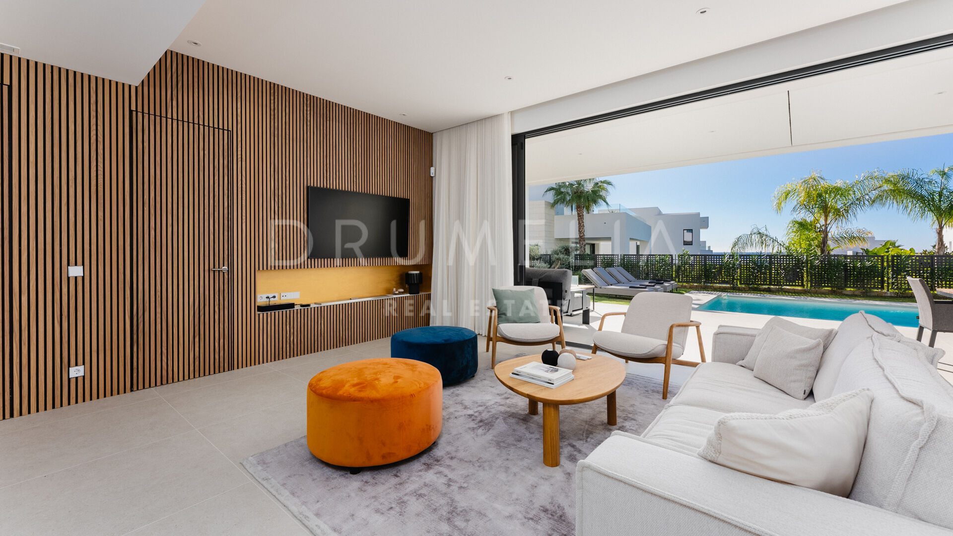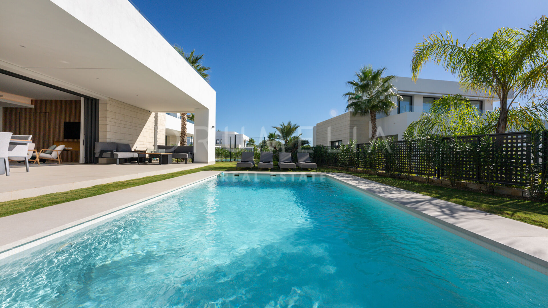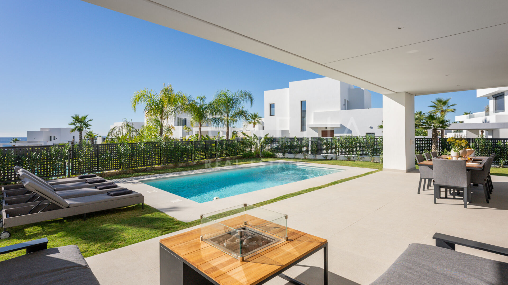 Treffen Sie draußen auf eine großzügige überdachte Terrasse, die durch große Schiebetüren zugänglich ist und die Innen- und Außenbereiche harmonisch miteinander verbindet. Ein glitzernder Pool, umgeben von einem wunderschön gestalteten Garten, verstärkt die Atmosphäre und lädt zur Entspannung und Regeneration ein, umgeben von den beruhigenden Klängen der Natur. Stellen Sie sich vor, Sie wachen auf zum Gesang der Vögel und dem sanften Geräusch fließenden Wassers im Pool, ohne störenden Verkehrslärm.