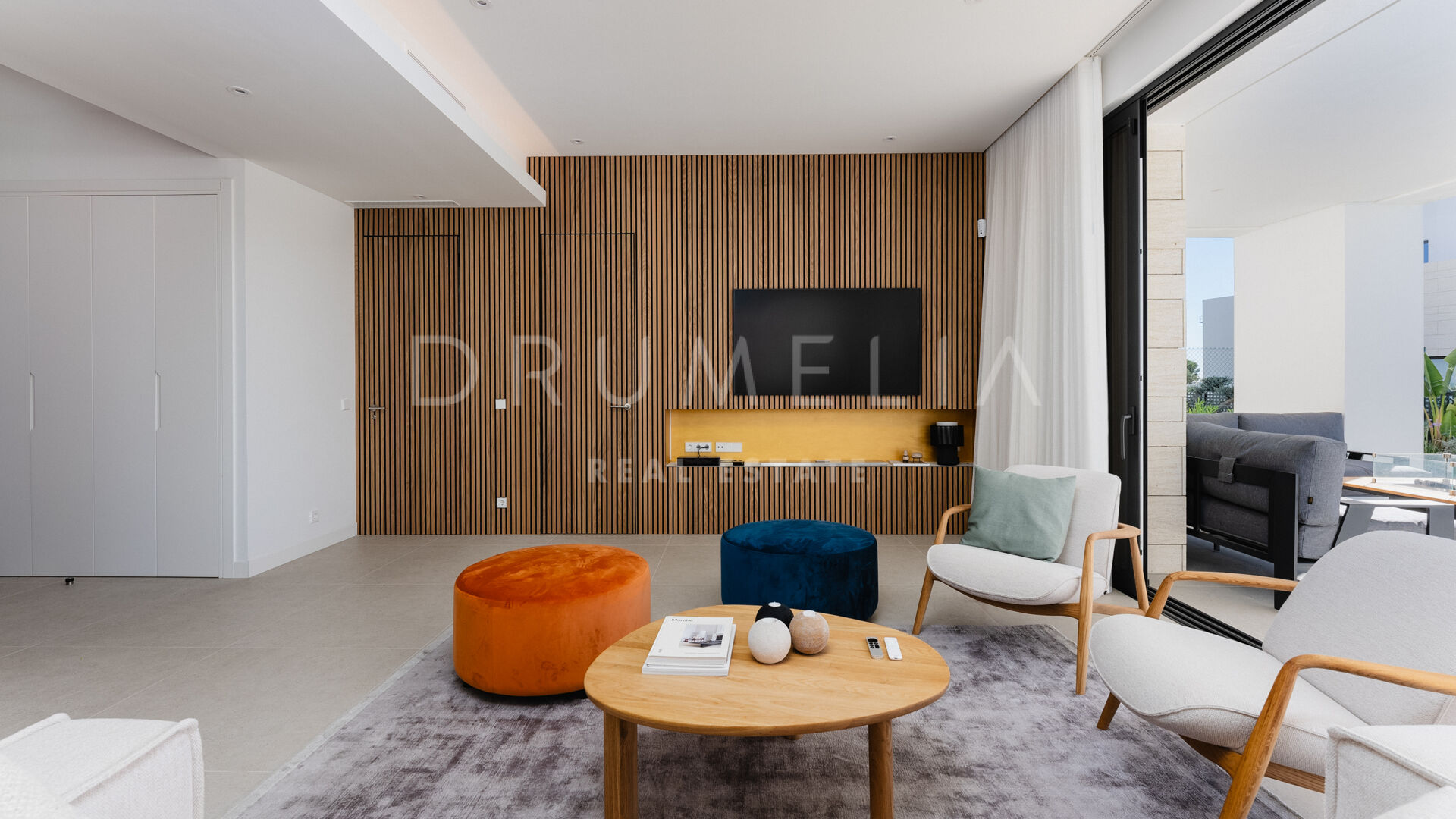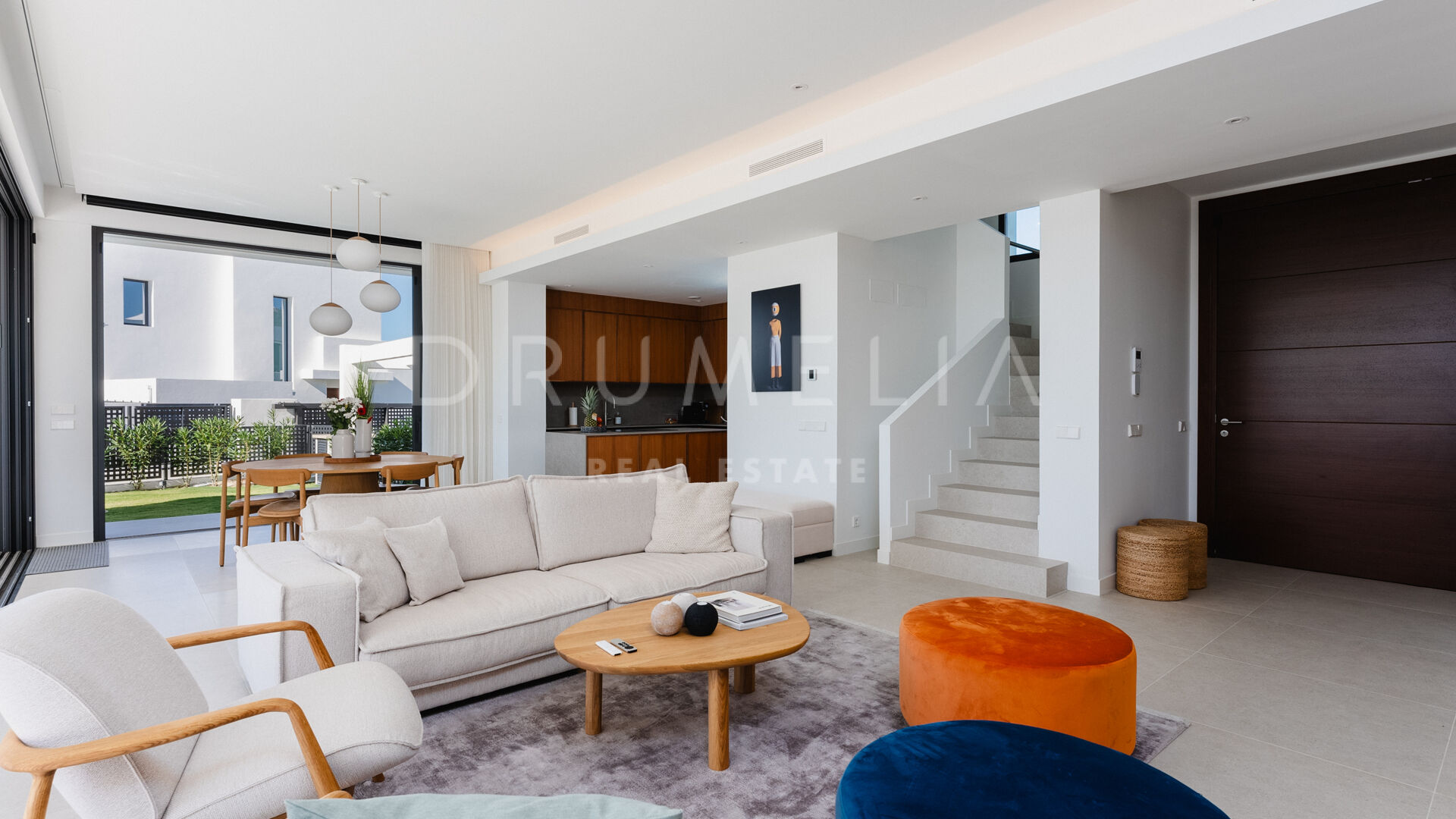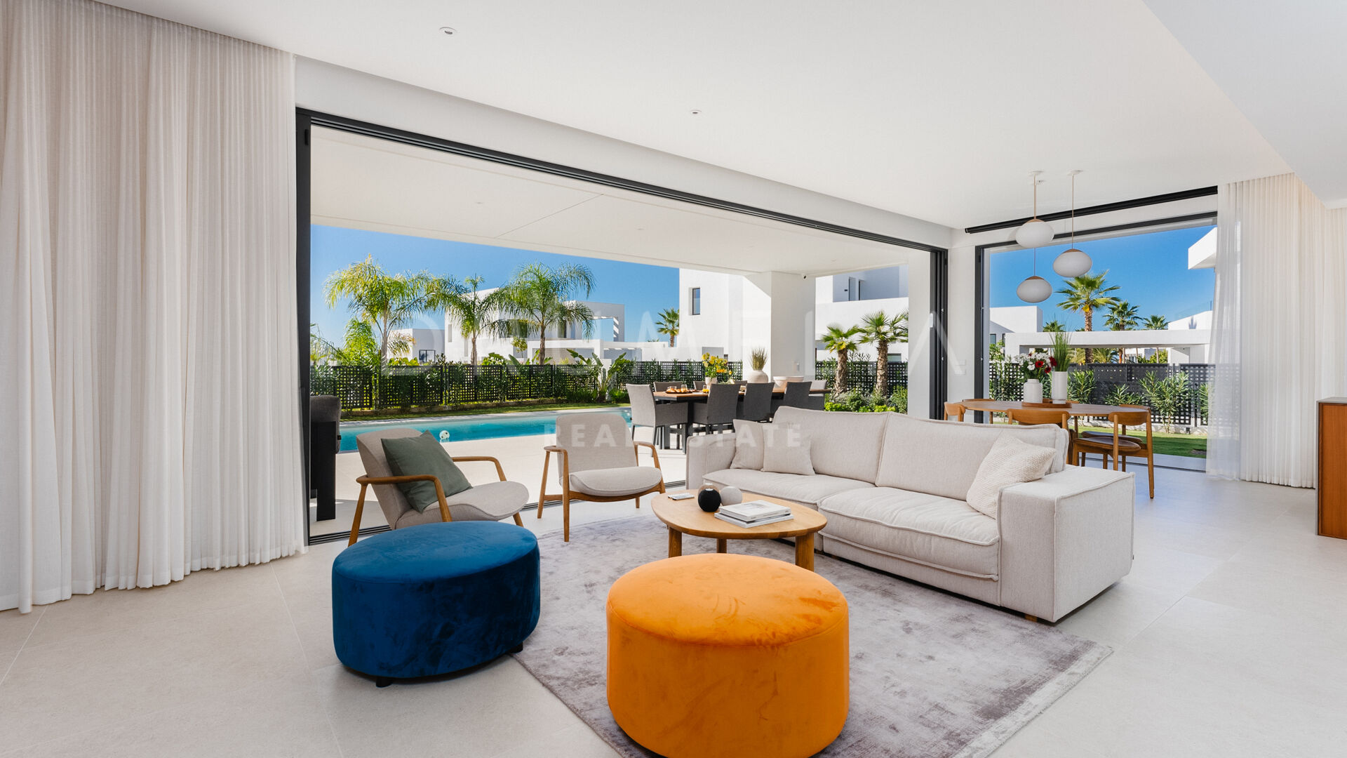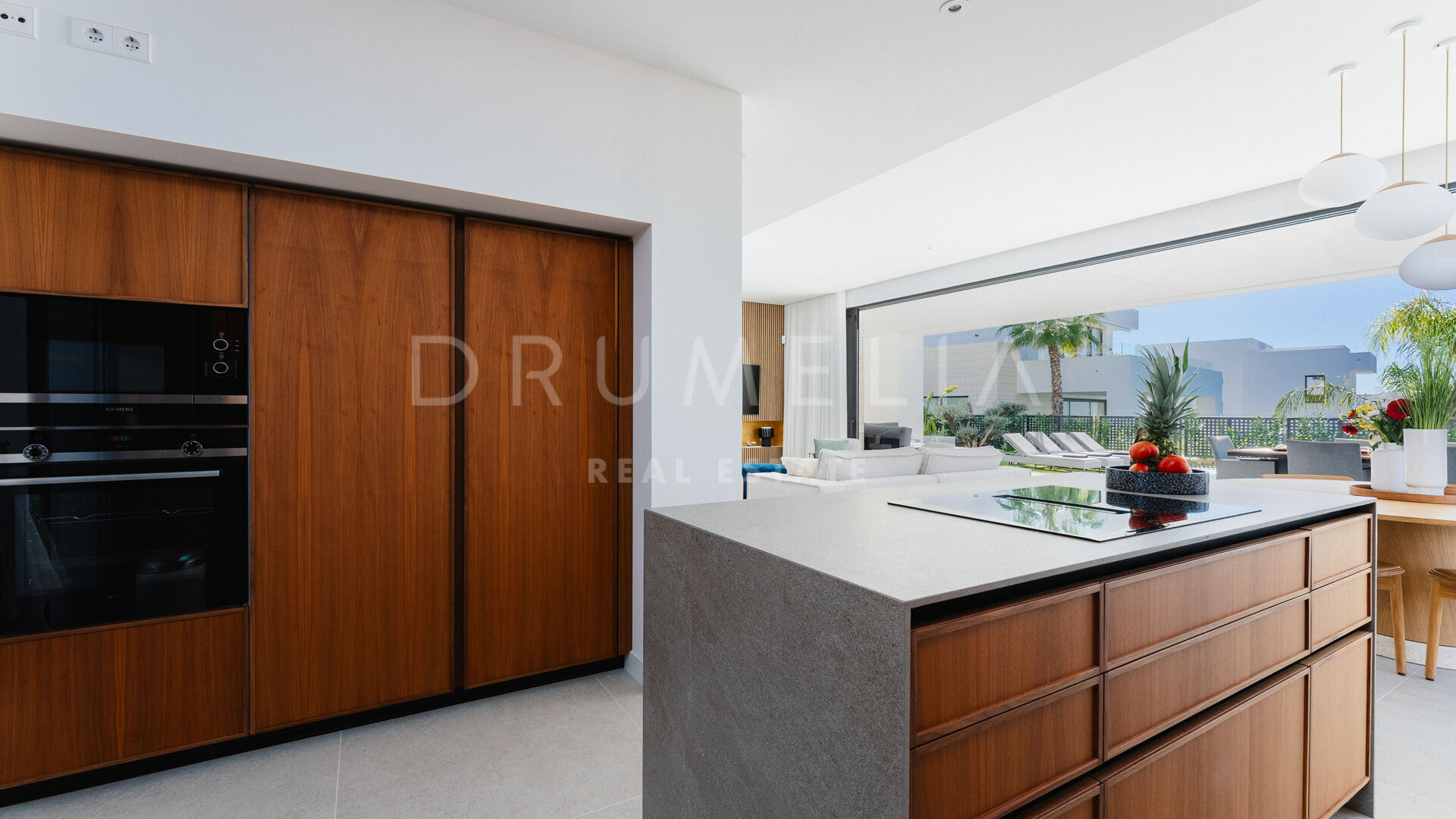Treffen Sie draußen auf eine großzügige überdachte Terrasse, die durch große Schiebetüren zugänglich ist und die Innen- und Außenbereiche harmonisch miteinander verbindet. Ein glitzernder Pool, umgeben von einem wunderschön gestalteten Garten, verstärkt die Atmosphäre und lädt zur Entspannung und Regeneration ein, umgeben von den beruhigenden Klängen der Natur. Stellen Sie sich vor, Sie wachen auf zum Gesang der Vögel und dem sanften Geräusch fließenden Wassers im Pool, ohne störenden Verkehrslärm.