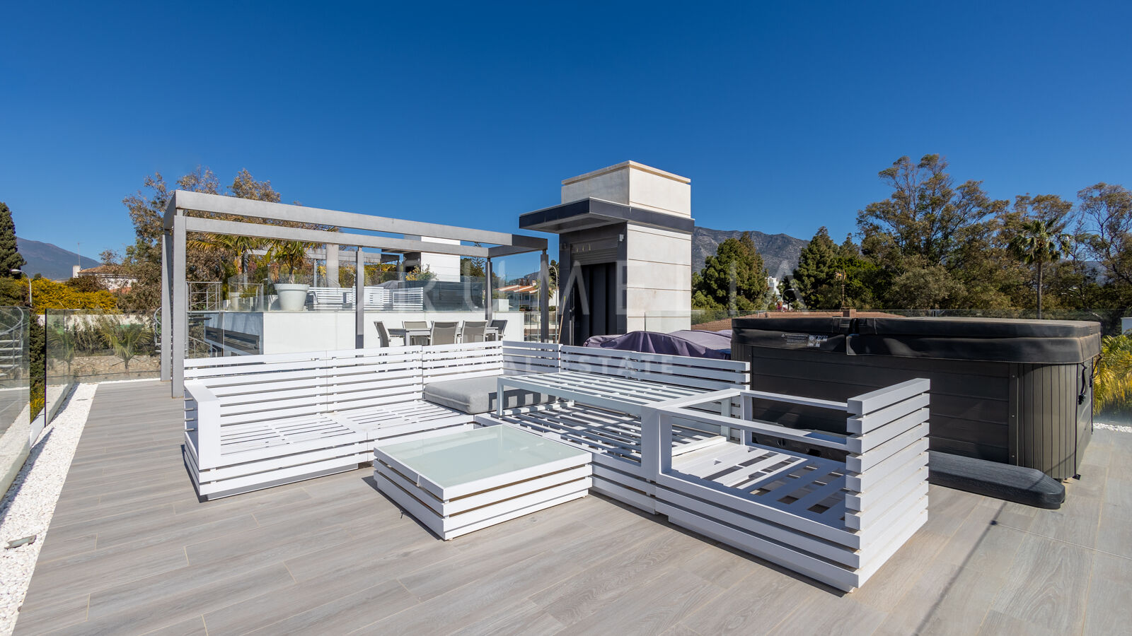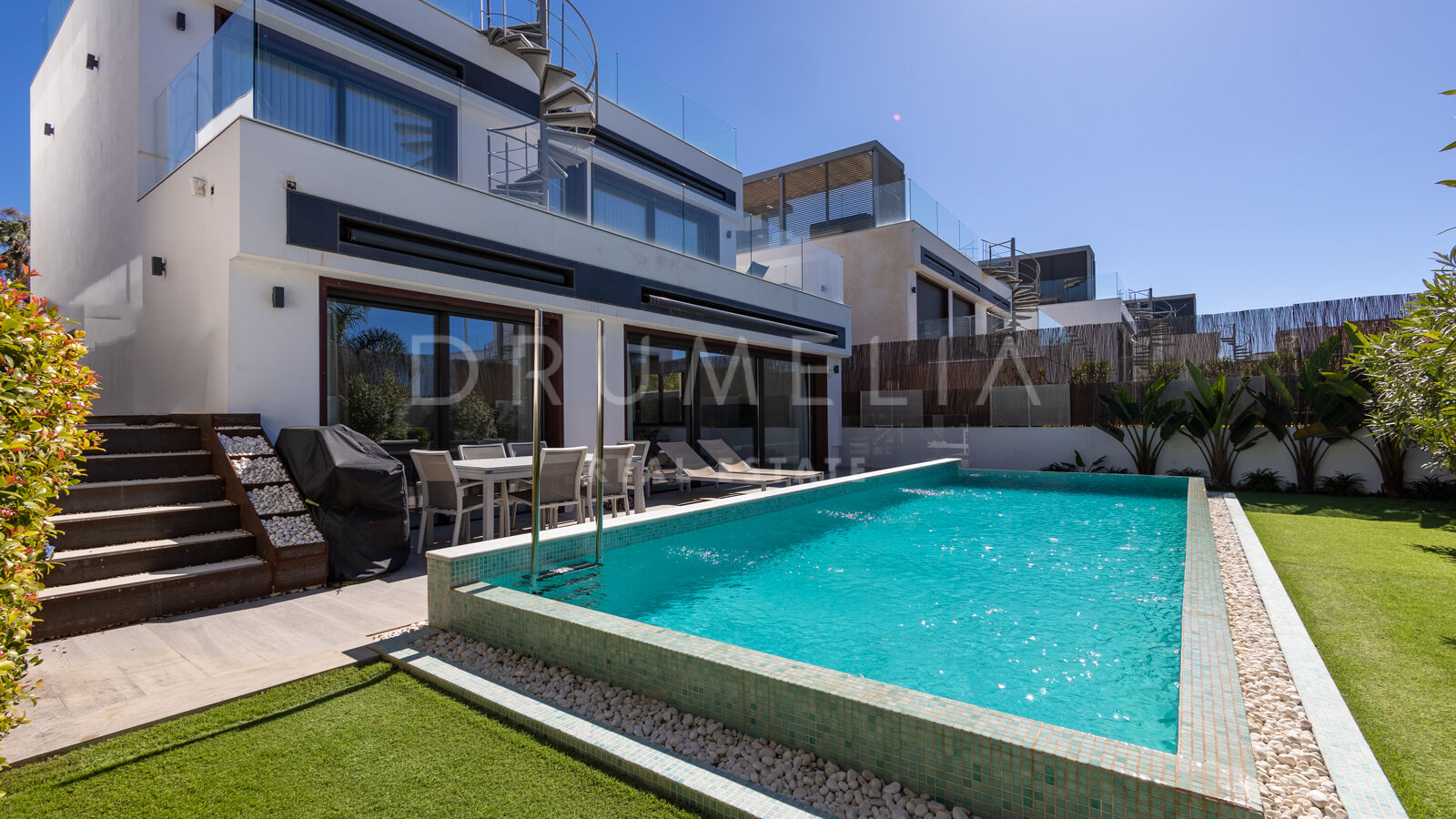 Die Villa erstreckt sich über drei Etagen und verfügt über 4 geräumige Schlafzimmer, 4 elegante Badezimmer und ein Gäste-WC, in denen bis zu 10 Gäste bequem Platz finden. Das Anwesen verfügt über einen privaten Garten, einen makellosen Swimmingpool und eine Dachterrasse mit Whirlpool für ultimative Entspannung.