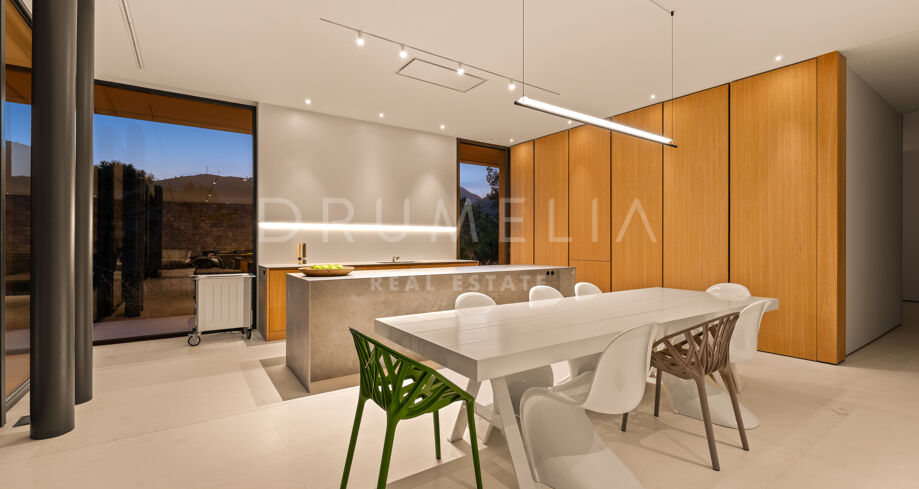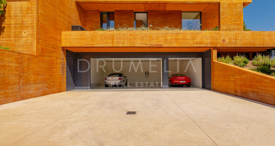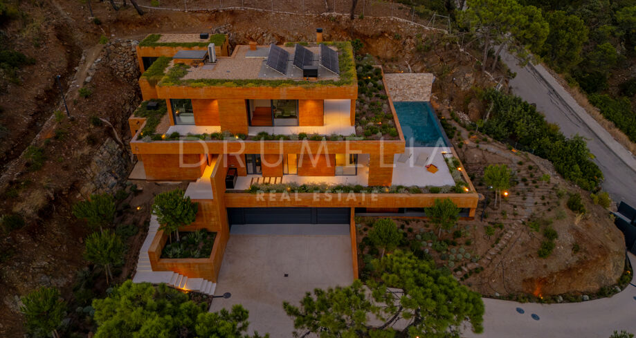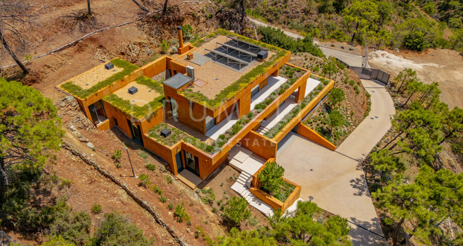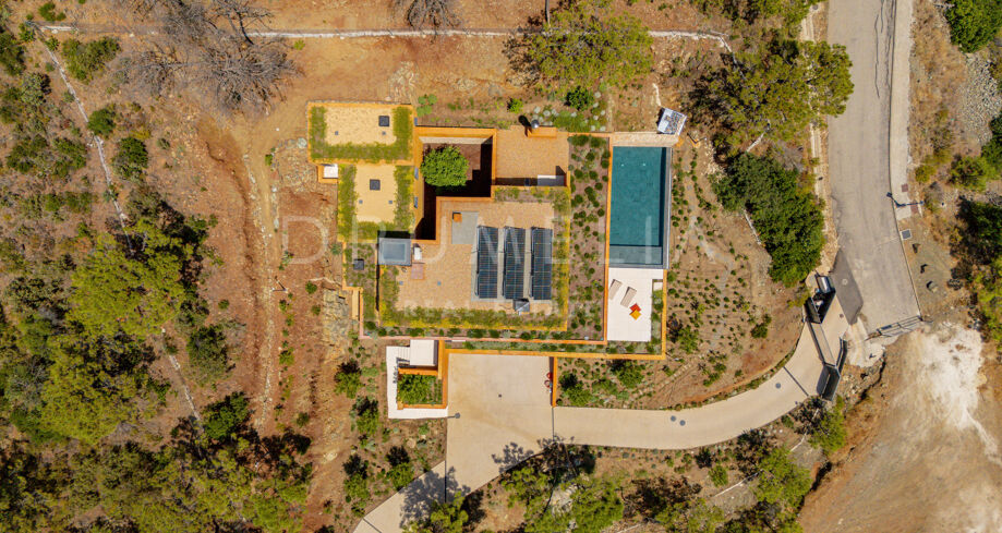 Diese Villa liegt tief eingebettet im Hang, umgeben von Natur und ohne sichtbare Nachbarn. Die markante Architektur mit klaren Linien und starken Formen fügt sich harmonisch in die Umgebung ein und schafft gleichzeitig einen einzigartigen Auftritt. Die Raumaufteilung ist auf den Ausblick ausgerichtet, mit großen Fensterfronten, die Innen- und Außenbereiche miteinander verbinden.