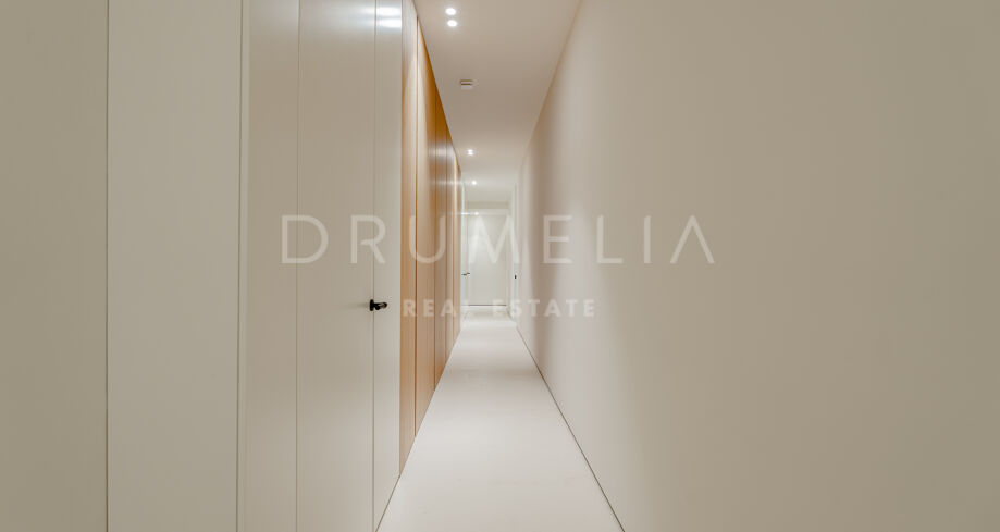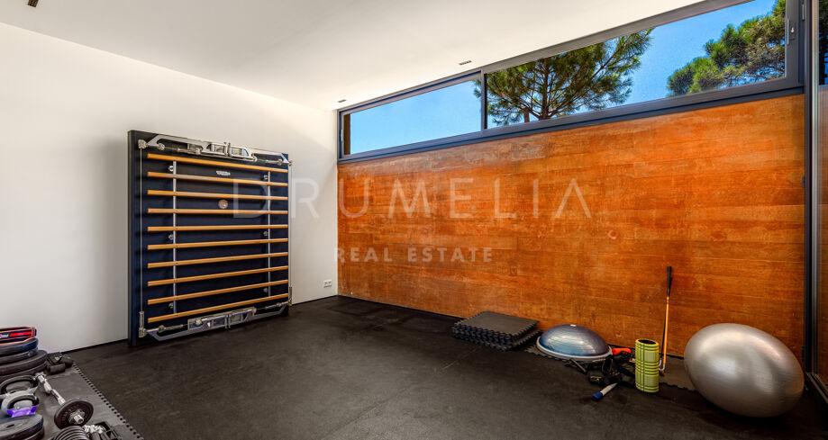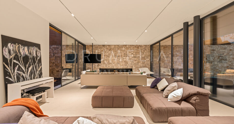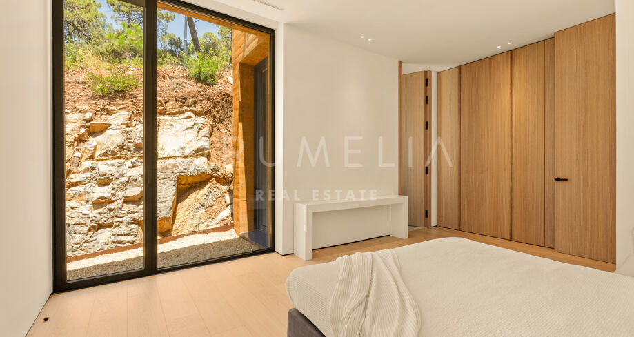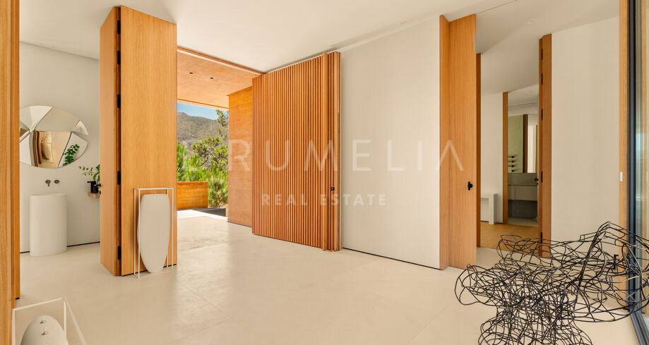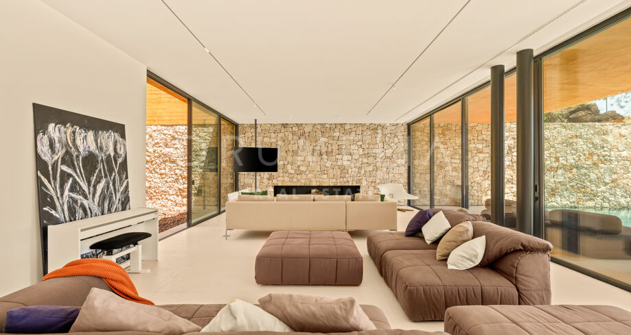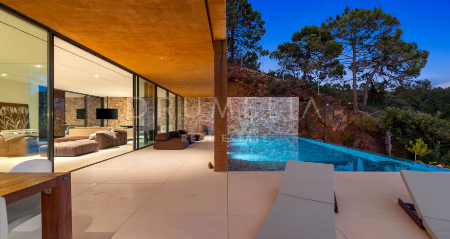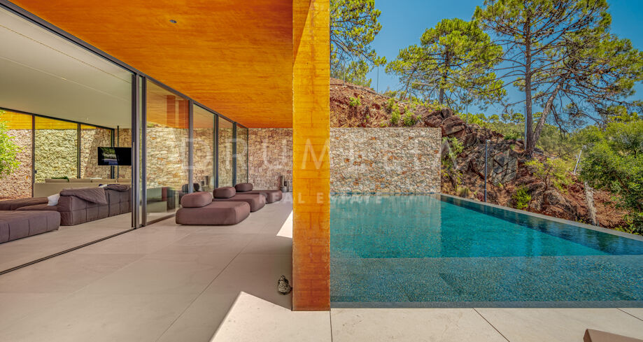 Im Inneren verteilen sich mehrere offene Ebenen mit verschiedenen Wohnbereichen, Suiten und großzügigen Terrassen, die sowohl Sonne als auch Schatten bieten. Innen- und Außenleben gehen fließend ineinander über, mit einem einladenden Poolbereich, eingerahmt von Bergen und Pinien – ideal für ruhige Nachmittage.