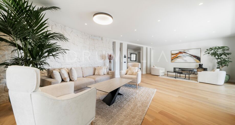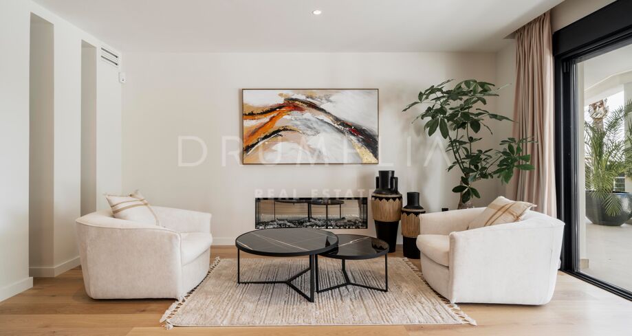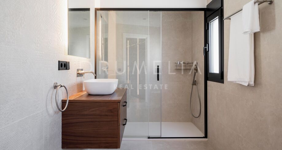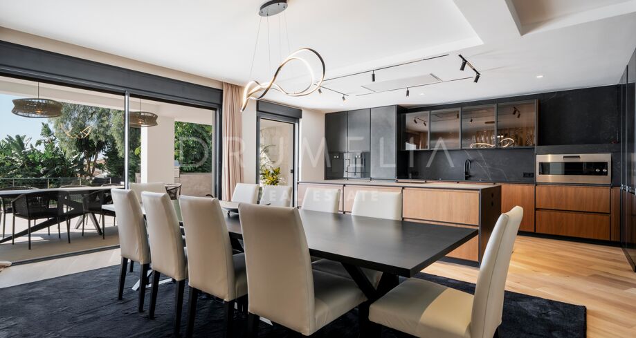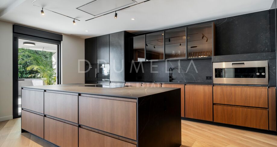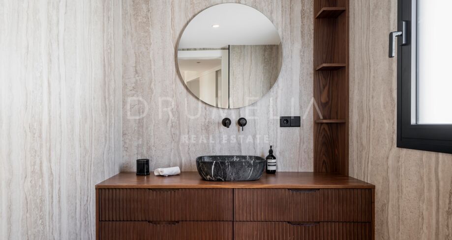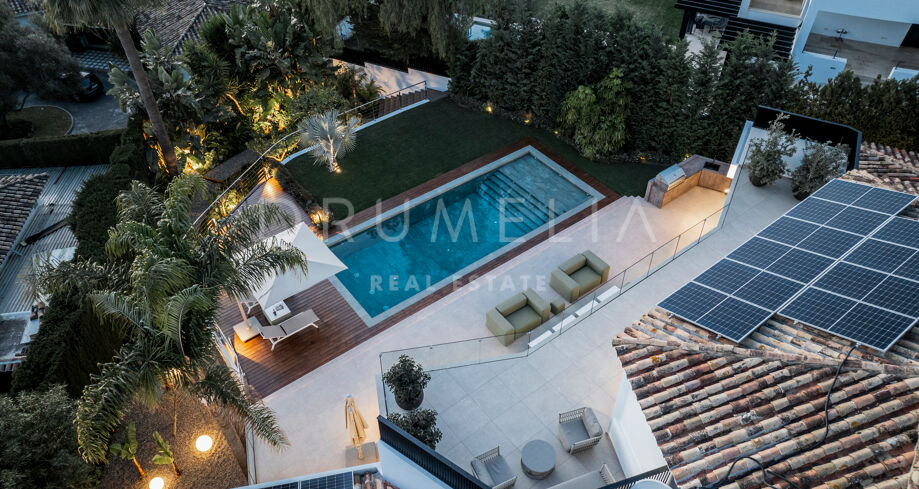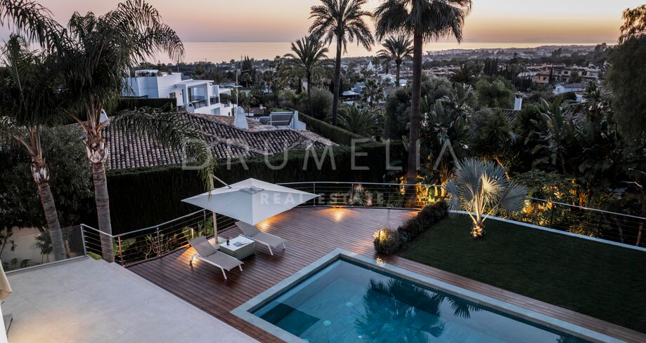Der Außenbereich ist eine wahre Oase mit sorgfältig gepflegten Gärten, einem stilvollen Swimmingpool und mehreren Außenloungebereichen. Die Dachterrasse ist der perfekte Ort, um den Panoramablick auf Marbella, Puerto Banús und den Mittelmeerhorizont zu genießen.