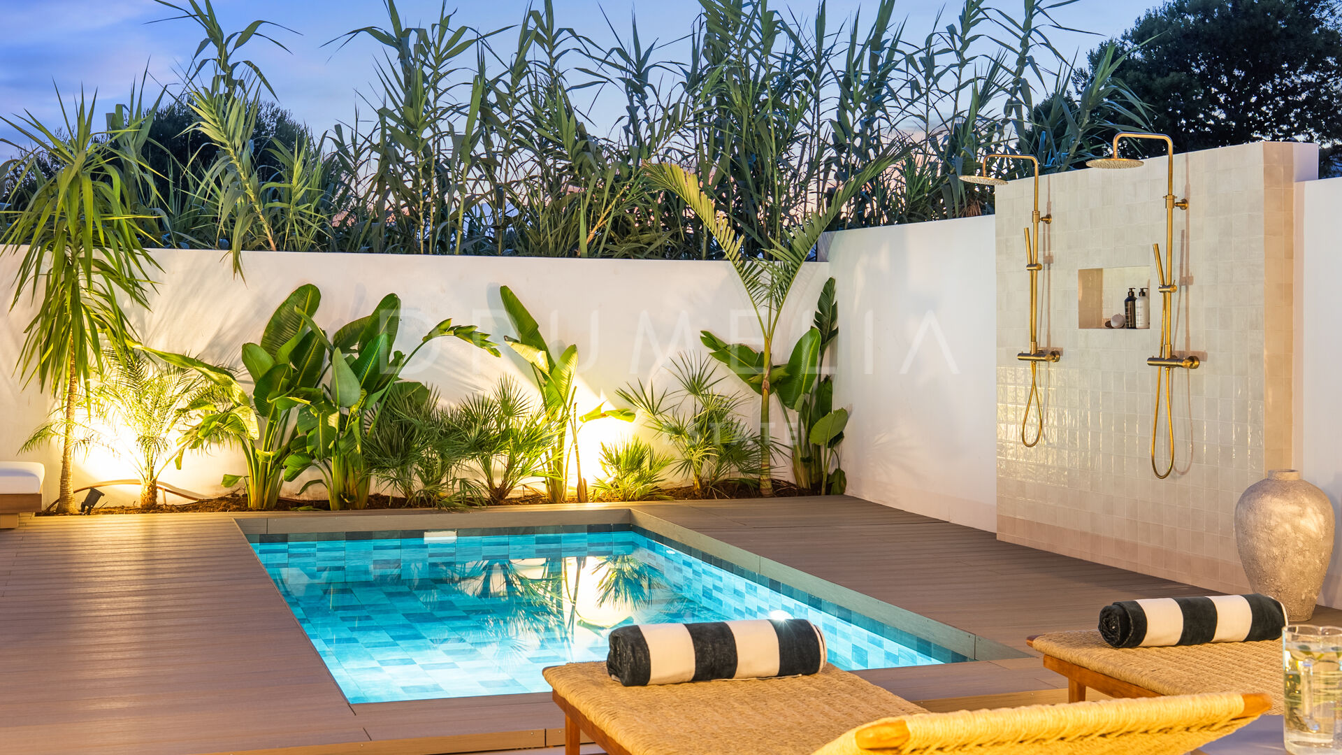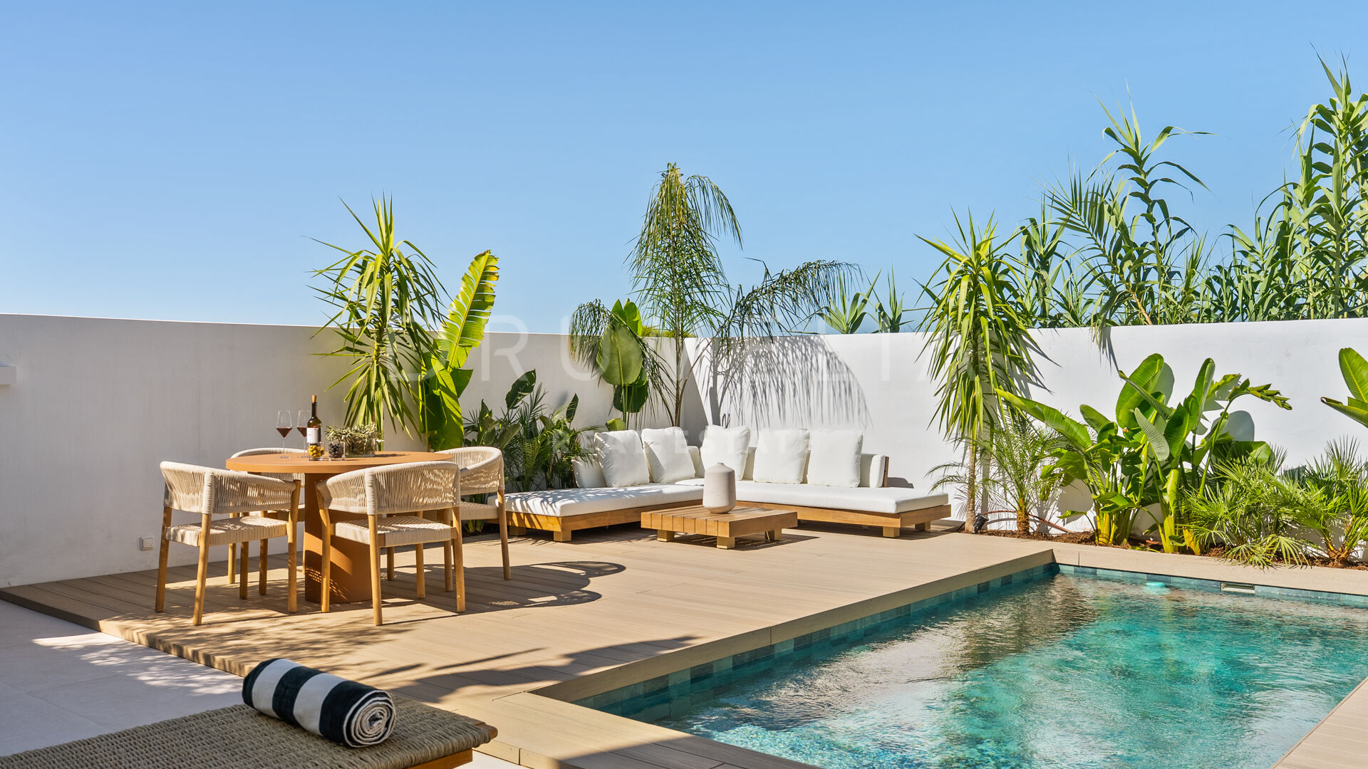 Auf zwei Ebenen verteilt, bietet die Immobilie drei Schlafzimmer und drei Badezimmer. Im Obergeschoss befindet sich eine private Terrasse mit Außenbadewanne und Lounge-Bereich. Das Erdgeschoss verbindet Küche, Ess- und Wohnbereich nahtlos mit dem Außenbereich, wo ein wunderschöner privater Pool zum Entspannen oder geselligen Beisammensein einlädt.