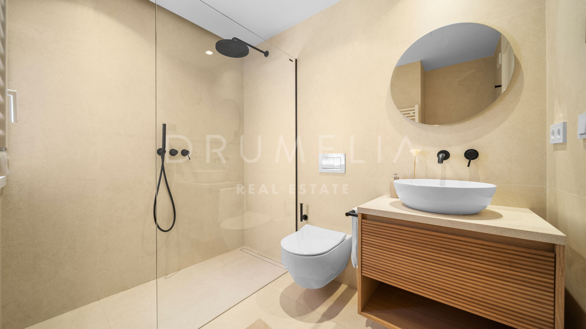 Die Immobilie verfügt über großzügige Schlafzimmer, alle mit eigenem Bad und privater Terrasse, sowie ein Gäste-WC. Die offene Santos-Küche eignet sich ideal für den Alltag und gesellschaftliche Anlässe, während das Wohnzimmer mit Planika-Kamin und Zugang zu einer überdachten Terrasse eine gemütliche Atmosphäre schafft. Doppelverglasung, elektrische Rollläden und Markisen, Hausautomationssystem, Fußbodenheizung in den Bädern und Aerothermie-System sorgen das ganze Jahr über für Komfort.