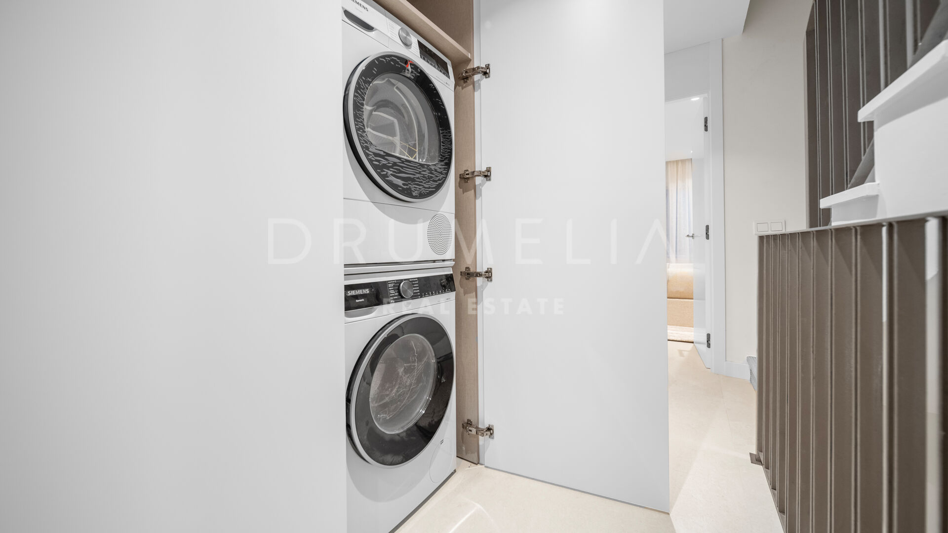 Bewohner genießen exklusive Gemeinschaftsbereiche mit Pool, Whirlpool, Sauna, Fitnessraum und gepflegten Gärten. Das Haus ist vollständig möbliert und mit hochwertigen Materialien dekoriert und umfasst einen Weinkeller, eine Waschküche und eine private Garage. In fußläufiger Entfernung befinden sich Tennis- und Padelclubs, Restaurants, Geschäfte, Supermärkte und Golfplätze wie Aloha und Las Brisas sowie das Aloha College (5 Minuten). Diese Immobilie bietet einen unvergleichlichen Lebensstil, der Luxus, Komfort und mediterranen Charme vereint.