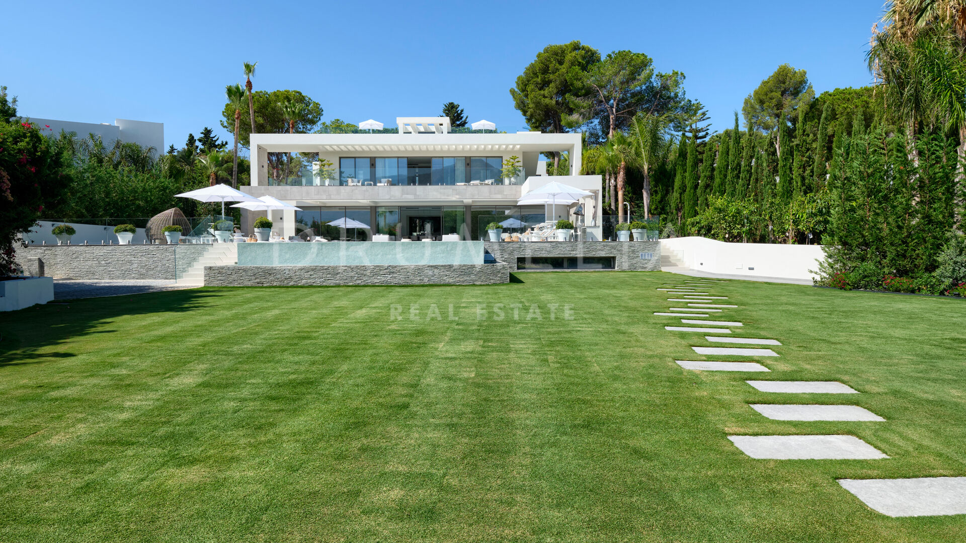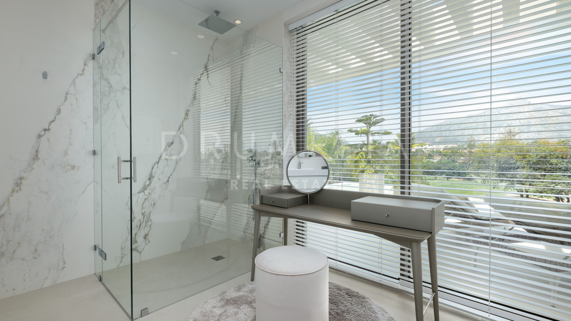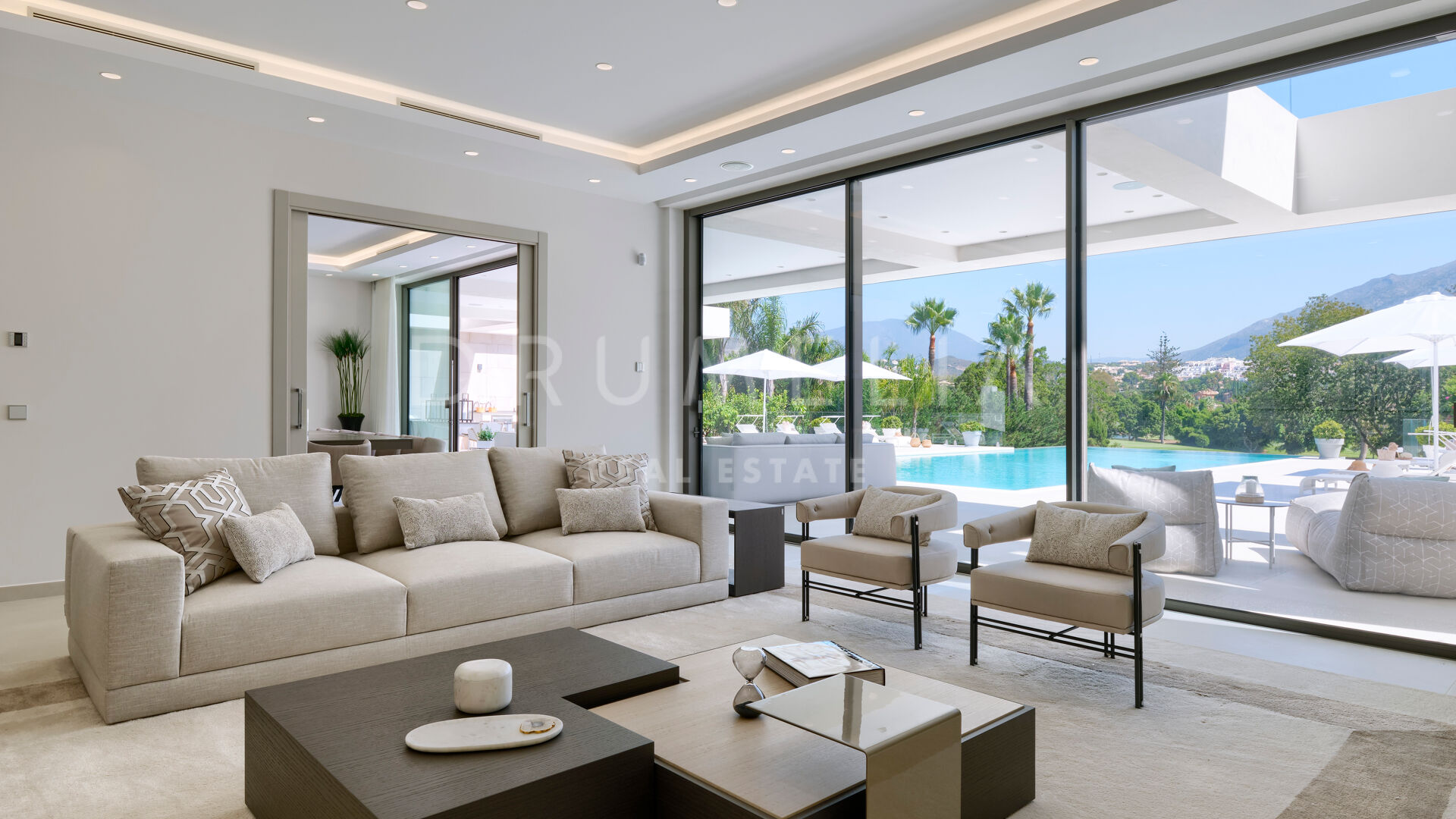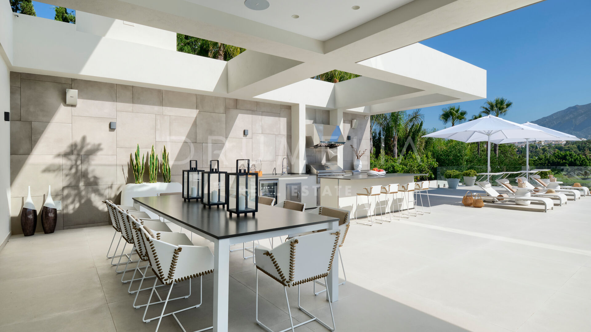 Diese absolut faszinierende, hochmoderne und spektakuläre Immobilie wird dein perfektes mediterranes Zuhause sein, wenn dein Lebensstil modernen Chic, Komfort, Sicherheit, Genuss und ein paar Extras beinhaltet. Du wirst es nicht bereuen! Die superexklusive moderne Villa von 1.197 m² mit großzügigem 2.580 m² großen Grundstück und malerischem Golf- und Bergblick hat alle möglichen und atemberaubenden Vorteile. Sie ist nicht nur eine wunderschöne mediterrane, moderne Villa, die als modernes Zuhause funktioniert. Es ist ein Statement und ein stressfreier, superbequemer Lebensstil, der vom Fortschritt und der besonderen Lage bestimmt wird.