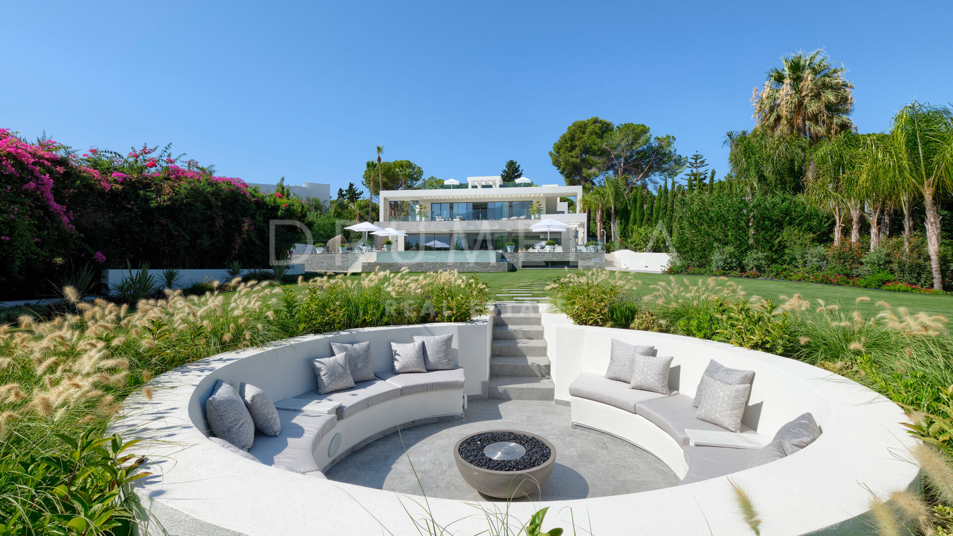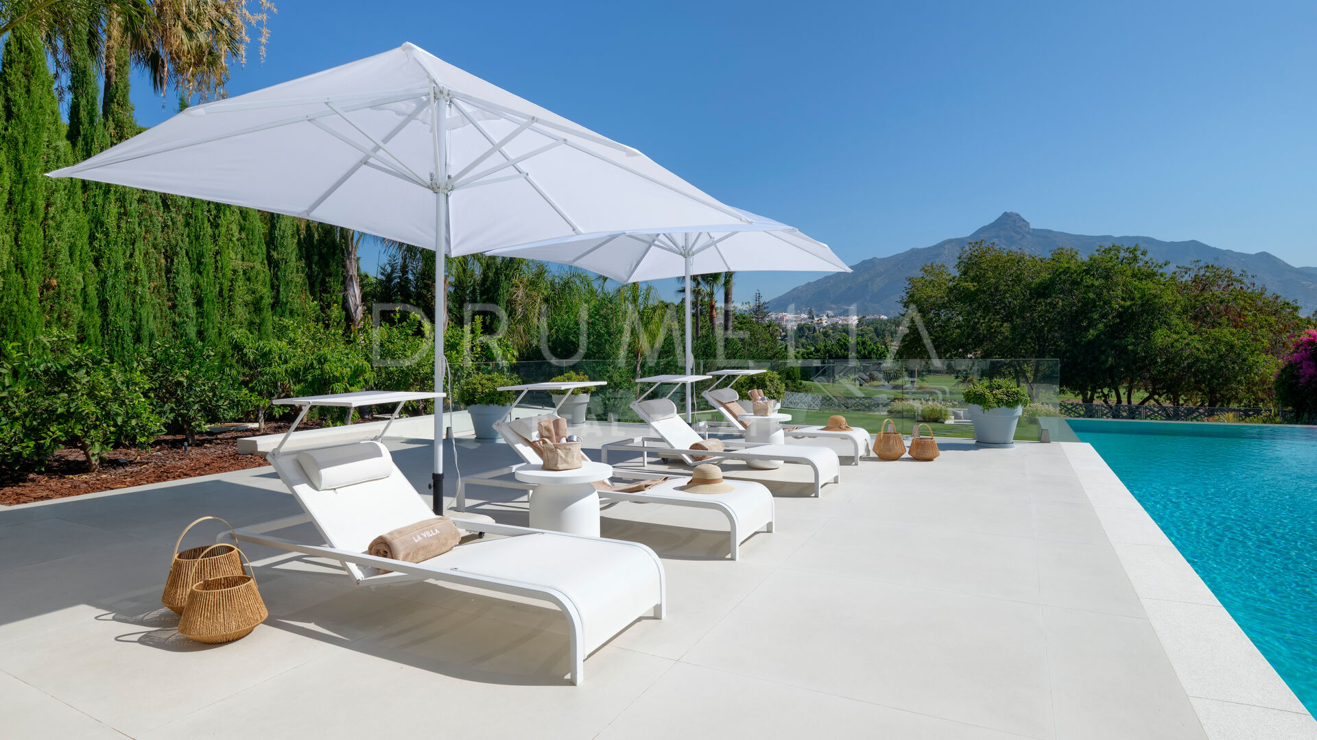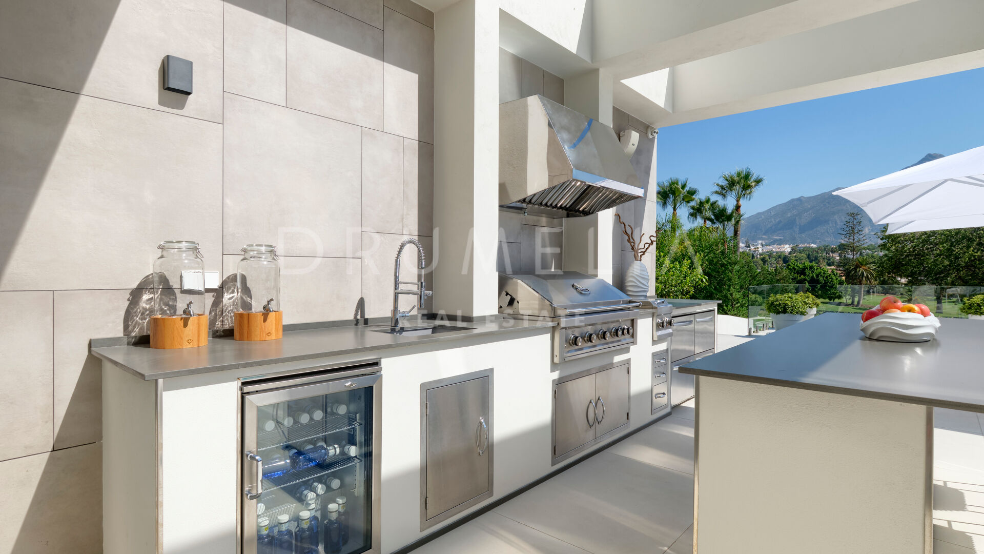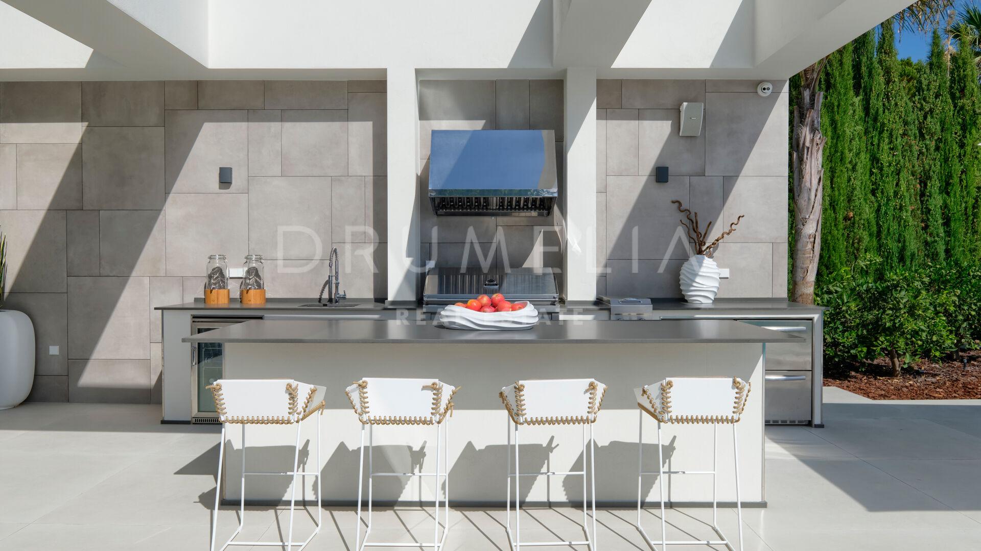 Die wunderschön angelegten Gärten und Außenbereiche bieten einen 16 m langen Infinity-Pool, überdachte und sonnige Terrassen, eine versunkene Lounge mit Bio-Ethanol-Kamin, Sonnenbäder, Grillplätze, Ess- und Ruhebereiche – ideal, um das ganze Jahr über draußen zu verbringen, zu unterhalten, zu entspannen, im Freien zu essen, das ausgezeichnete milde Klima, sensationelle mediterrane Sonnenuntergänge und ruhige Aussichten zu genießen. Der Buggy-Zugang führt dich direkt zum Golfplatz Las Brisas.