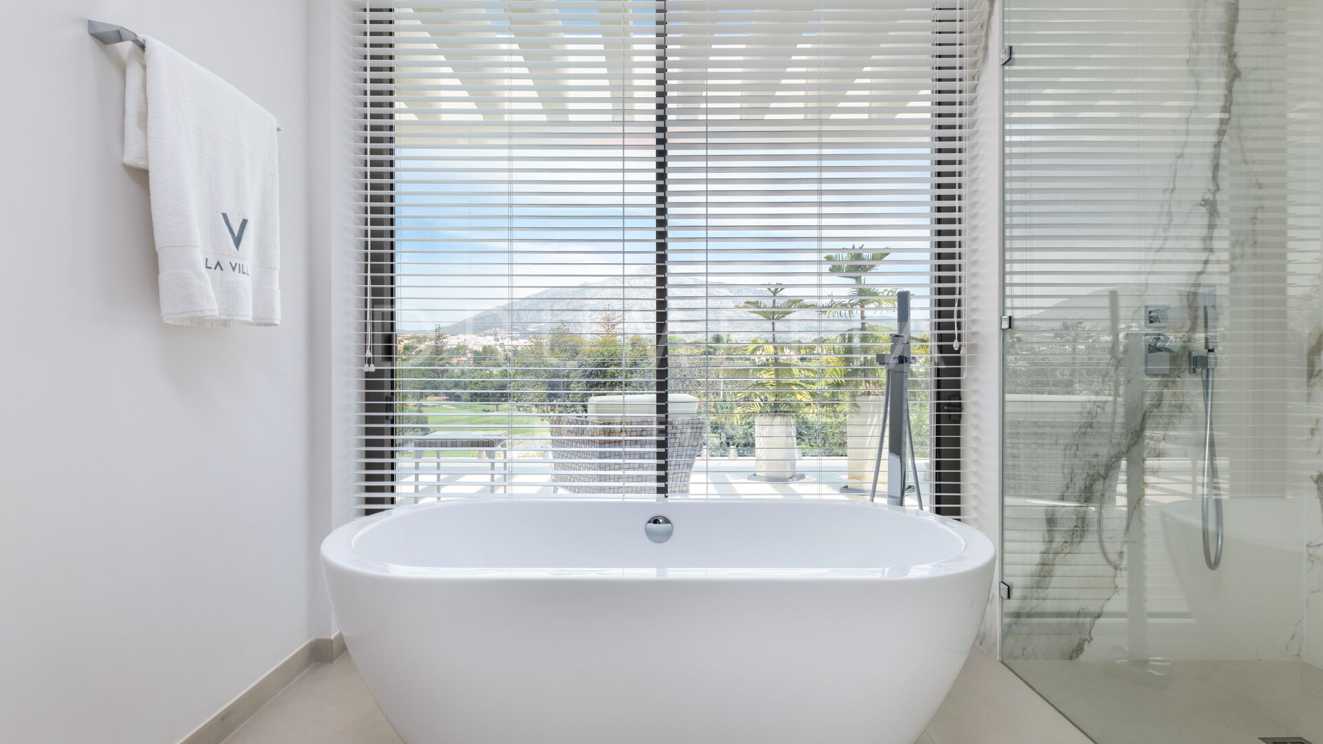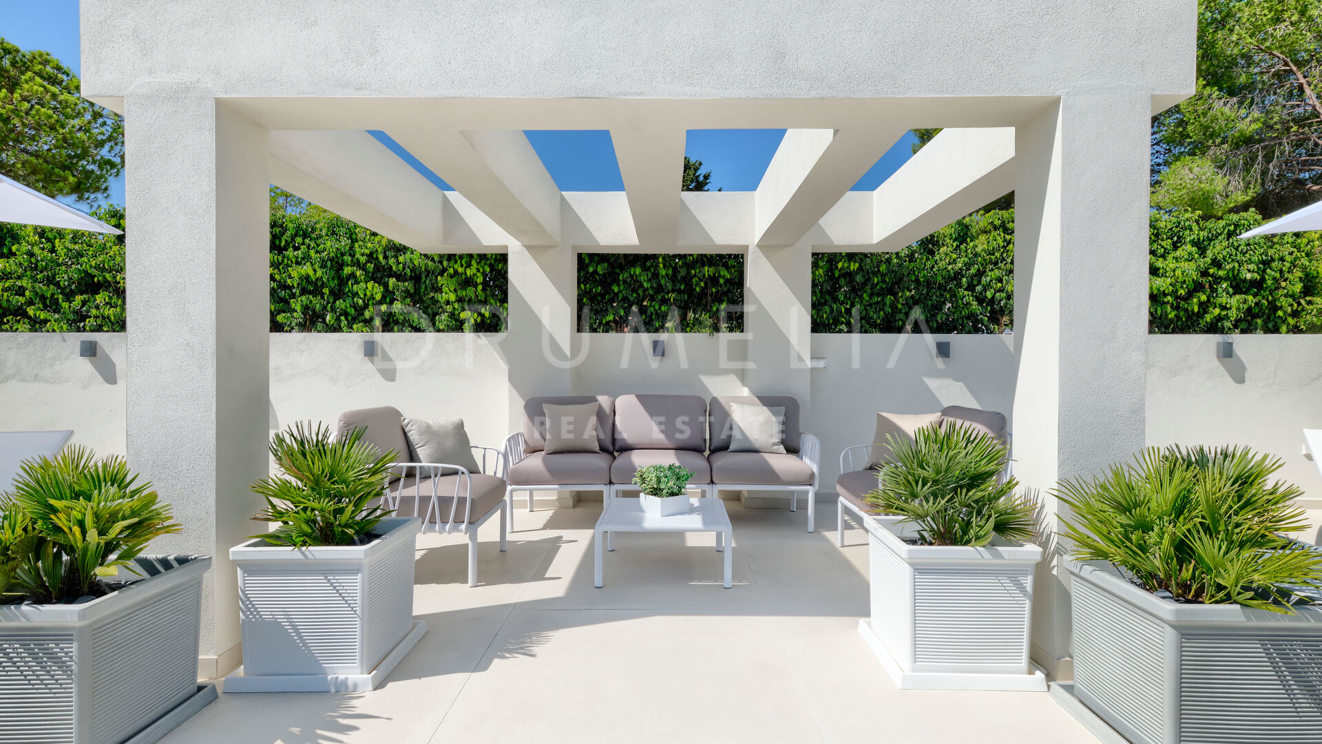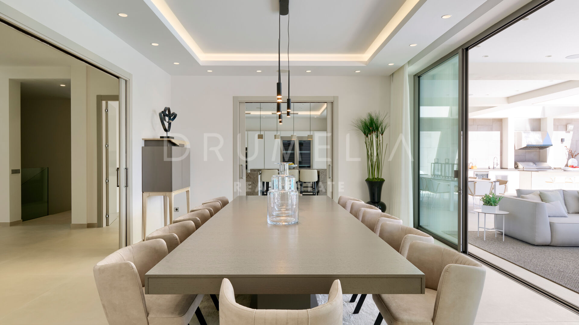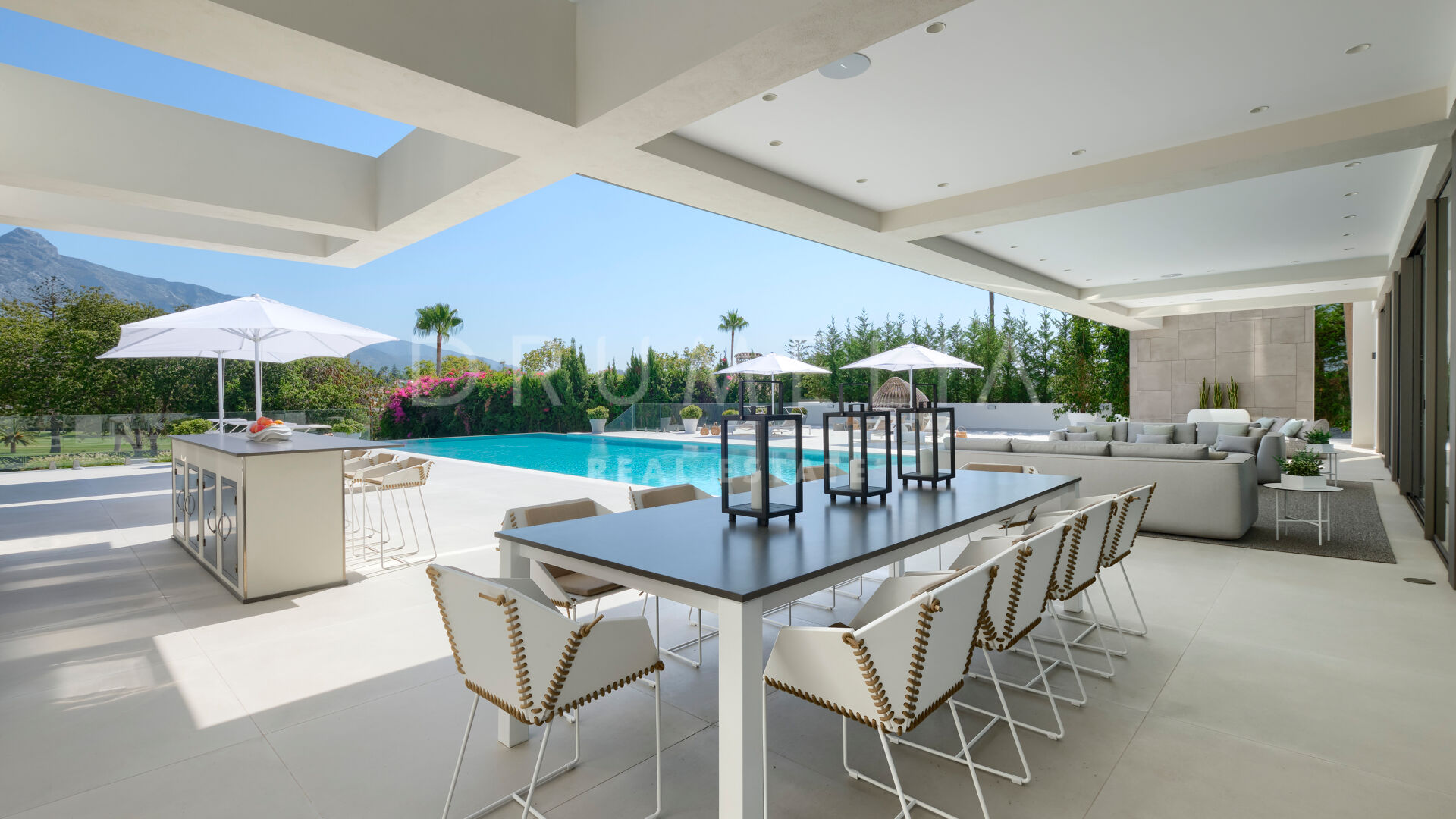 Die wunderschön angelegten Gärten und Außenbereiche bieten einen 16 m langen Infinity-Pool, überdachte und sonnige Terrassen, eine versunkene Lounge mit Bio-Ethanol-Kamin, Sonnenbäder, Grillplätze, Ess- und Ruhebereiche – ideal, um das ganze Jahr über draußen zu verbringen, zu unterhalten, zu entspannen, im Freien zu essen, das ausgezeichnete milde Klima, sensationelle mediterrane Sonnenuntergänge und ruhige Aussichten zu genießen. Der Buggy-Zugang führt dich direkt zum Golfplatz Las Brisas.