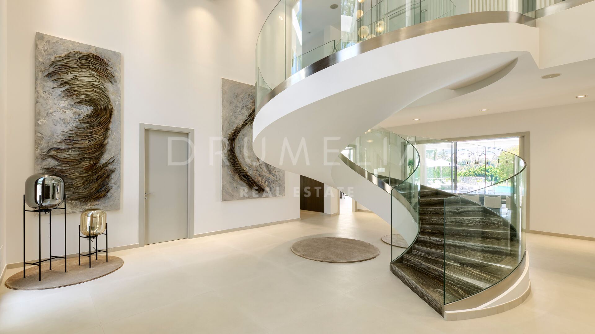 Die Luxusvilla mit sehr hohem Standard beeindruckt durch ihre moderne Ästhetik, zeitgemäße Formen, Linien und Gestalten, innovative und auffällige architektonische Elemente sowie eine praktische und logische Innenaufteilung. Die stilvolle, begrenzte Farbpalette basiert auf ruhigen, neutralen Tönen. Panoramatüren und eine ausgeklügelte Beleuchtung innen und außen machen den Zauber noch größer und besser. Die atemberaubende, wirklich atemberaubende moderne Treppe ist ein großartiges Statement.