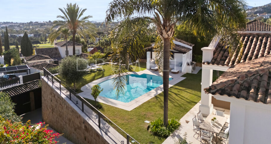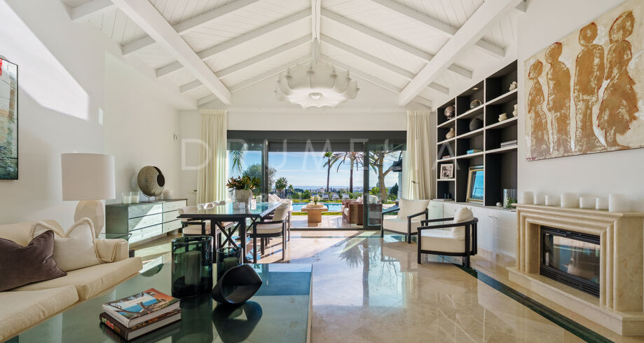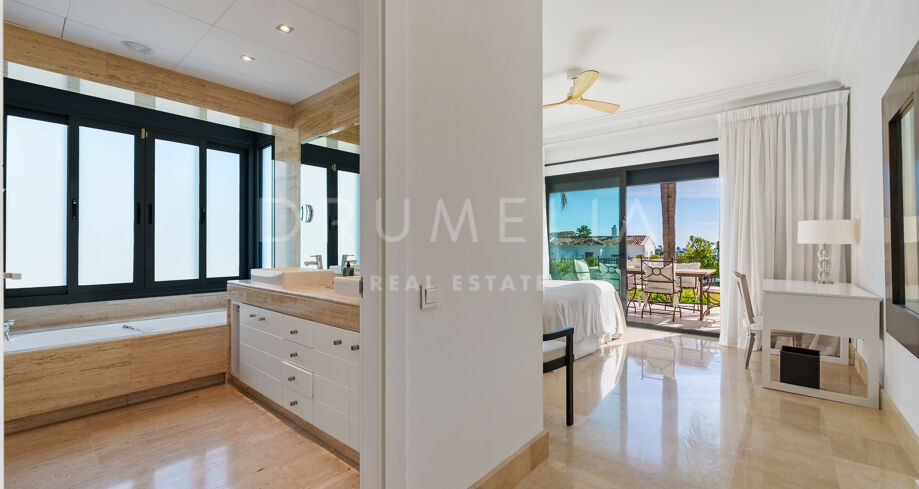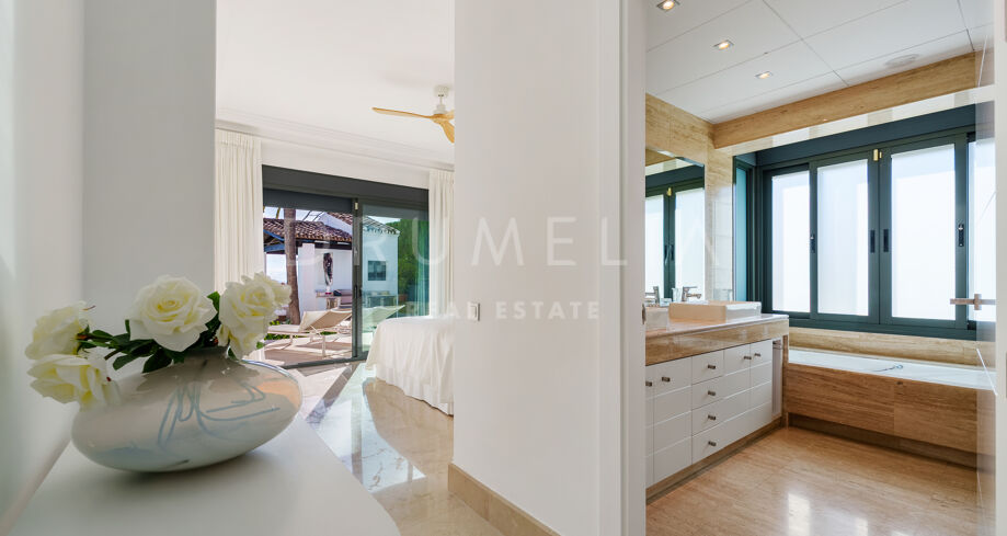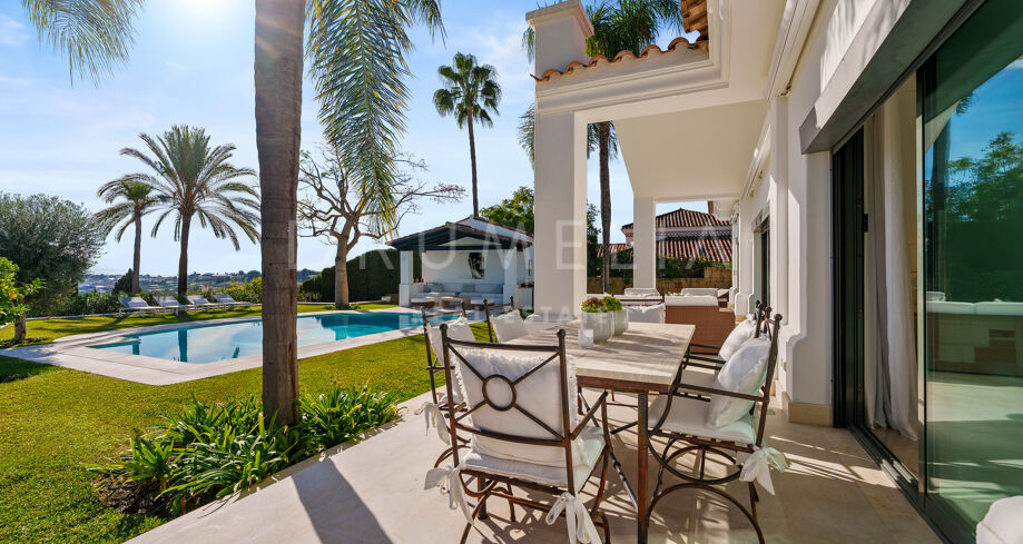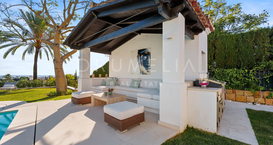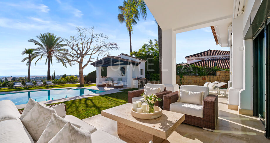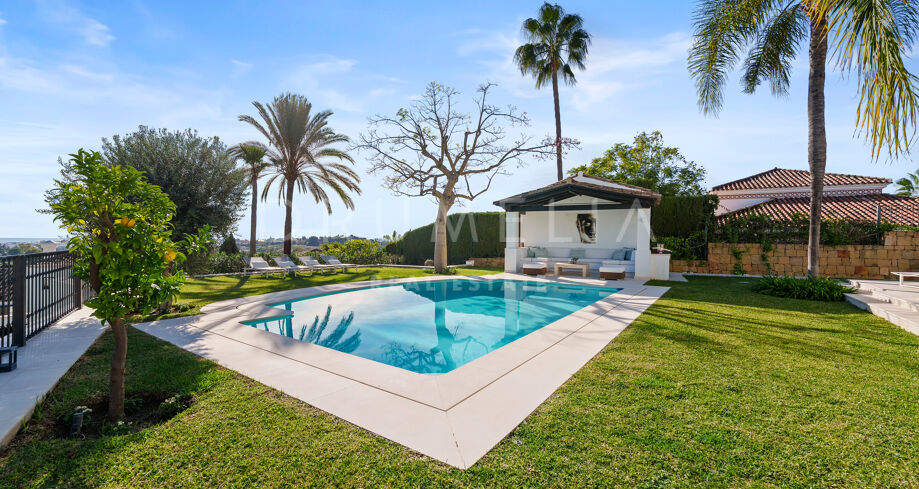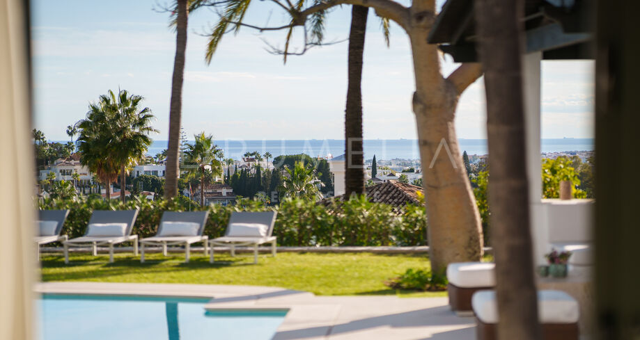 Villa mit 4 Schlafzimmern auf einem erhöhten Grundstück von 1.265 m² mit Meerblick, privatem Pool und angelegtem Garten in Nueva Andalucía, Marbella.