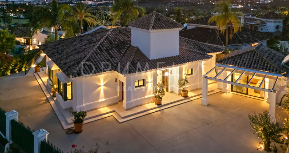 Diese Villa mit 4 Schlafzimmern und 4 Badezimmern befindet sich in der Wohngegend Haza del Conde in Nueva Andalucía, Marbella. Das Anwesen liegt auf einem erhöhten Grundstück von 1.265 m² und bietet einen offenen Blick auf die umliegende Landschaft und das Mittelmeer, während es dennoch Privatsphäre in einer etablierten Wohnumgebung gewährleistet.