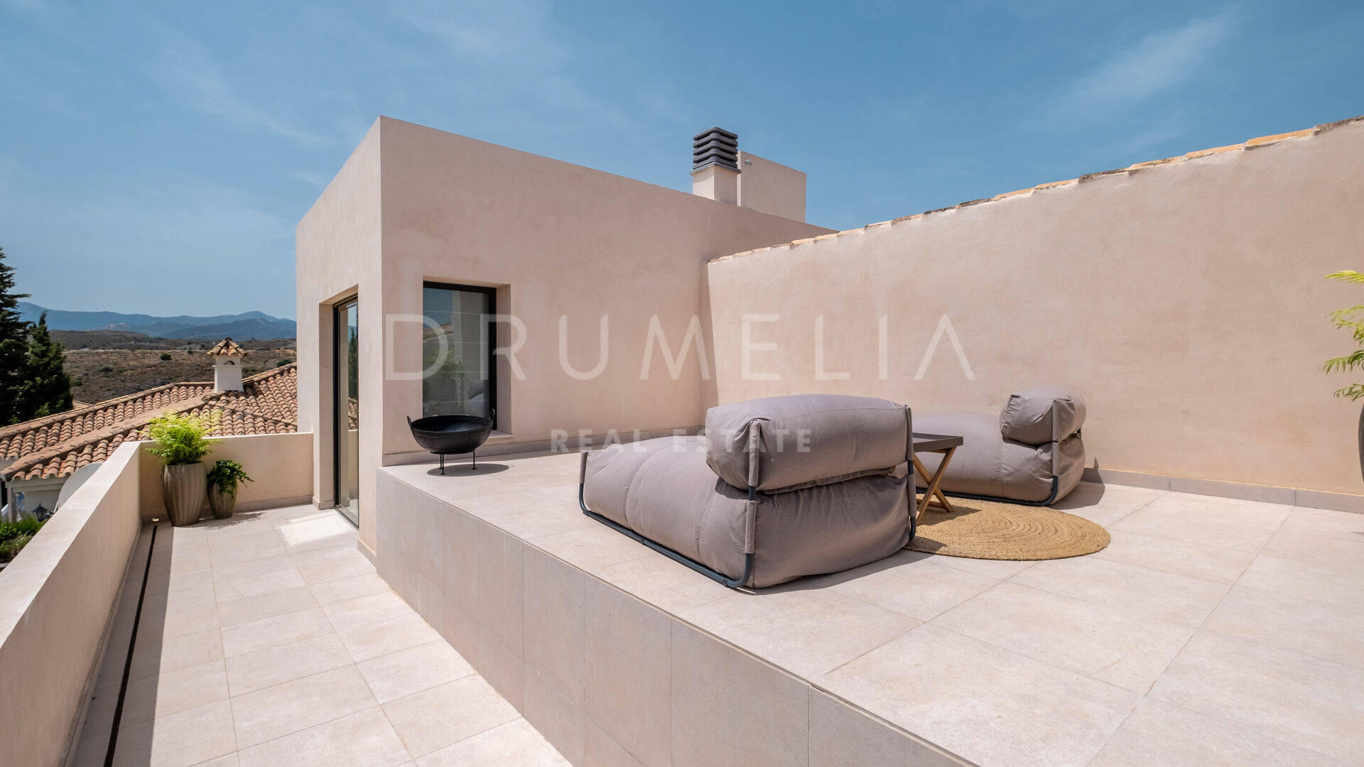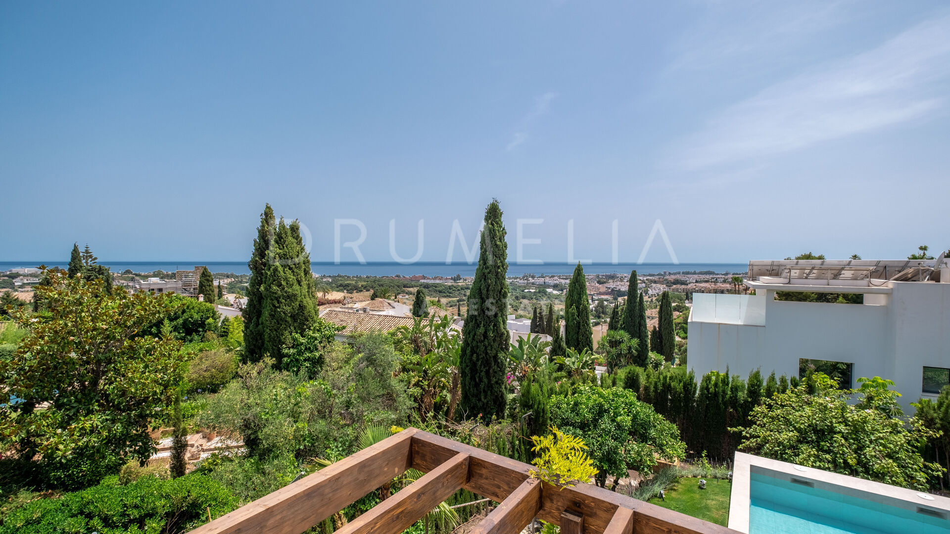 Diese Villa mit 4 Schlafzimmern steht in Paraiso Alto, einer prestigeträchtigen und ruhigen Gegend in Benahavis, nur 10 Autominuten von Puerto Banús und dem Strand entfernt, zum Verkauf. In einer ruhigen und exklusiven Lage gelegen, bietet diese Immobilie einen atemberaubenden Meerblick. Paraiso Alto ist bekannt für seine friedliche Atmosphäre, die es zu einem begehrten Standort macht. Die Villa befindet sich auf einem großzügigen 964 m² großen Grundstück mit einer Gesamtfläche von 270 m² und verkörpert ein modernes mediterranes Wohngefühl.