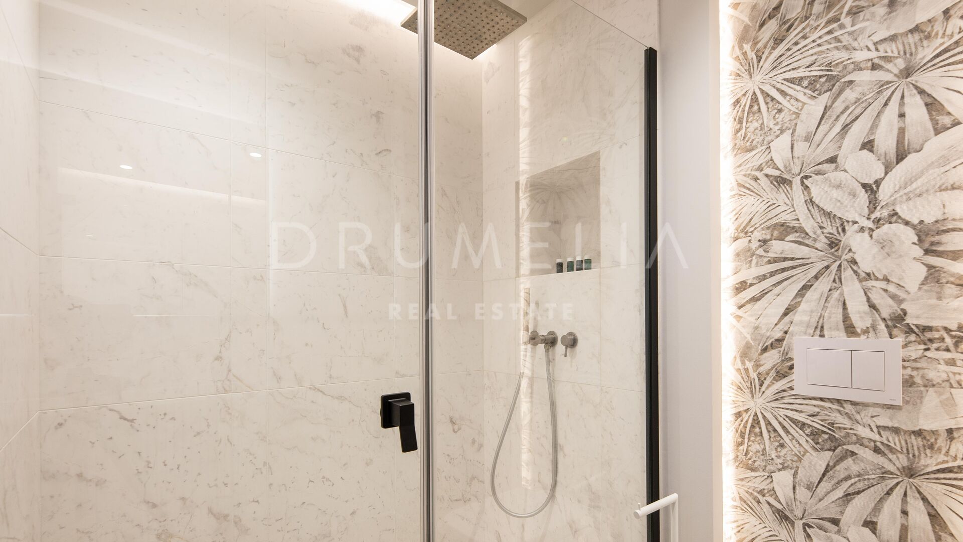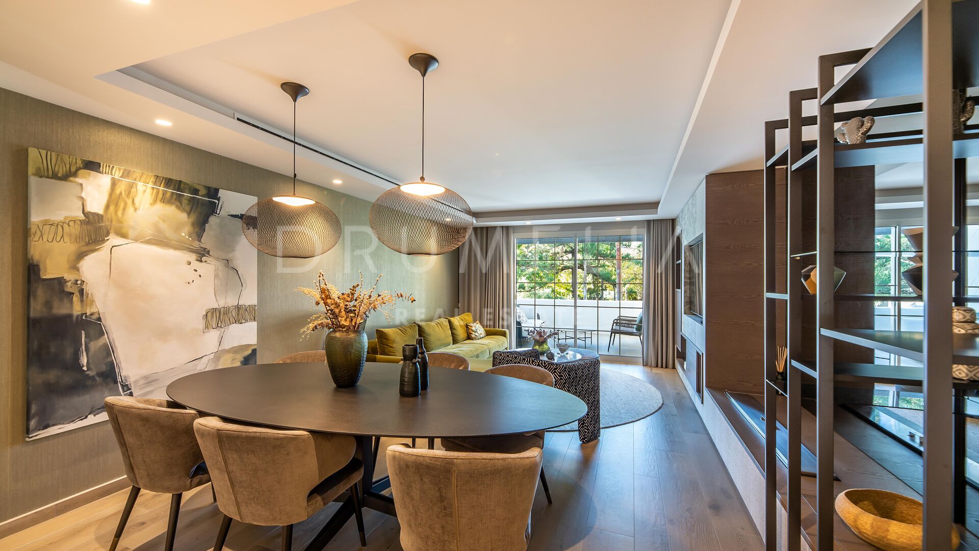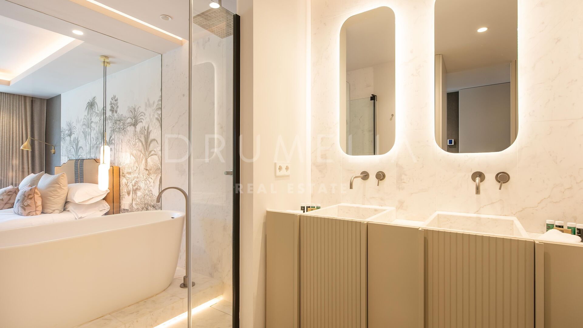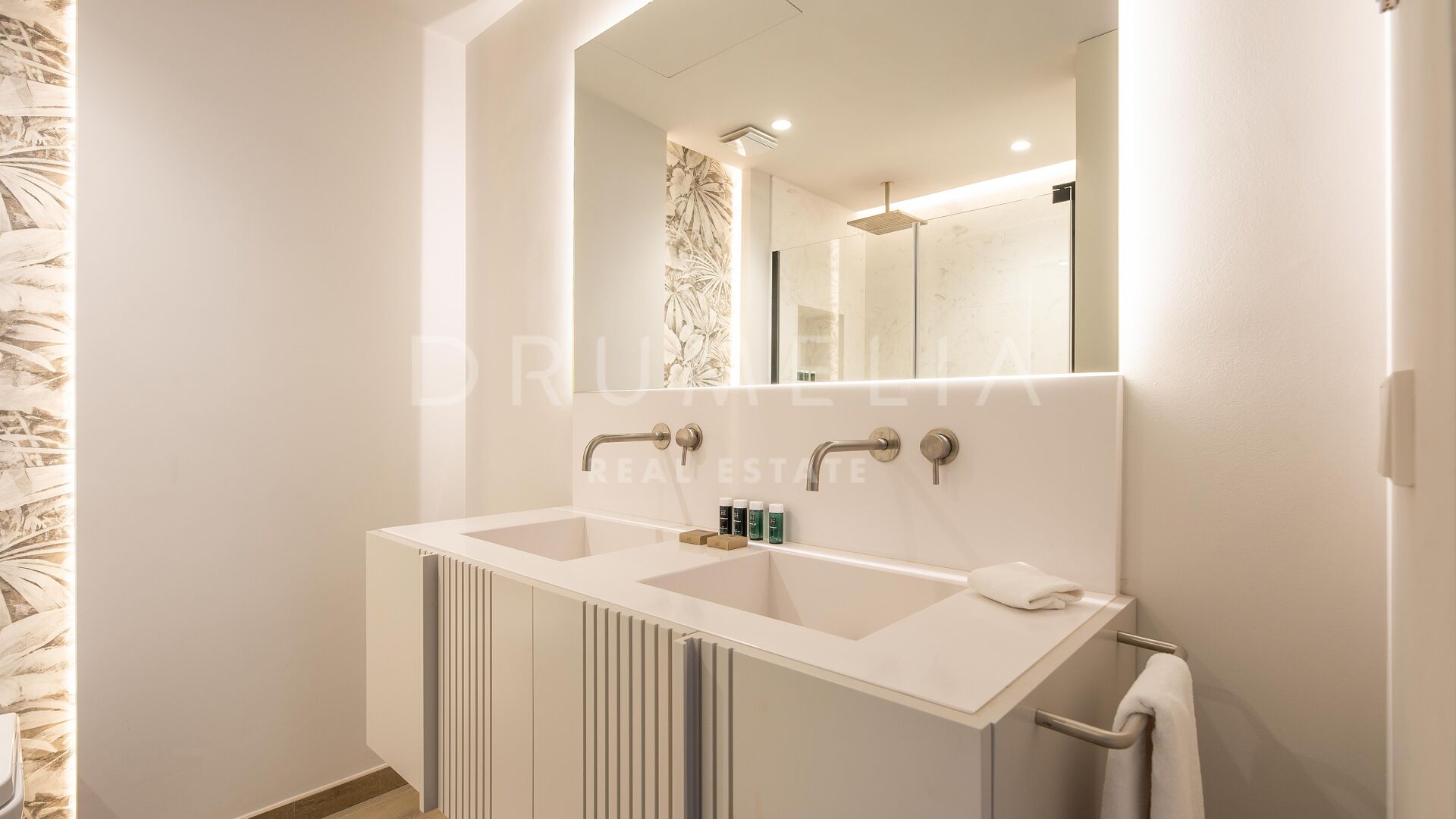 Das 176 m² große High-End-Apartment mit einer 24 m² großen, nach Westen ausgerichteten Terrasse ist exquisit gestaltet und verfügt über eine maßgeschneiderte Innenausstattung mit hochwertigen Materialien und erstklassigem Komfort. Sie ist ideal für den luxuriösen Lebensstil in Marbella und verfügt über ein geräumiges Wohnzimmer mit Flügeltüren, die auf die Terrasse mit Blick auf die zauberhaften Gärten führen; 2 Schlafzimmer mit 2 Badezimmern und einem Gäste-WC; eine elegante, moderne, offene Küche mit Insel/Frühstücksbereich und einem eleganten Essbereich. Die raffinierte Master-Suite verfügt über eine luxuriöse, freistehende Badewanne. Eine Garage bietet Platz für dein Auto.