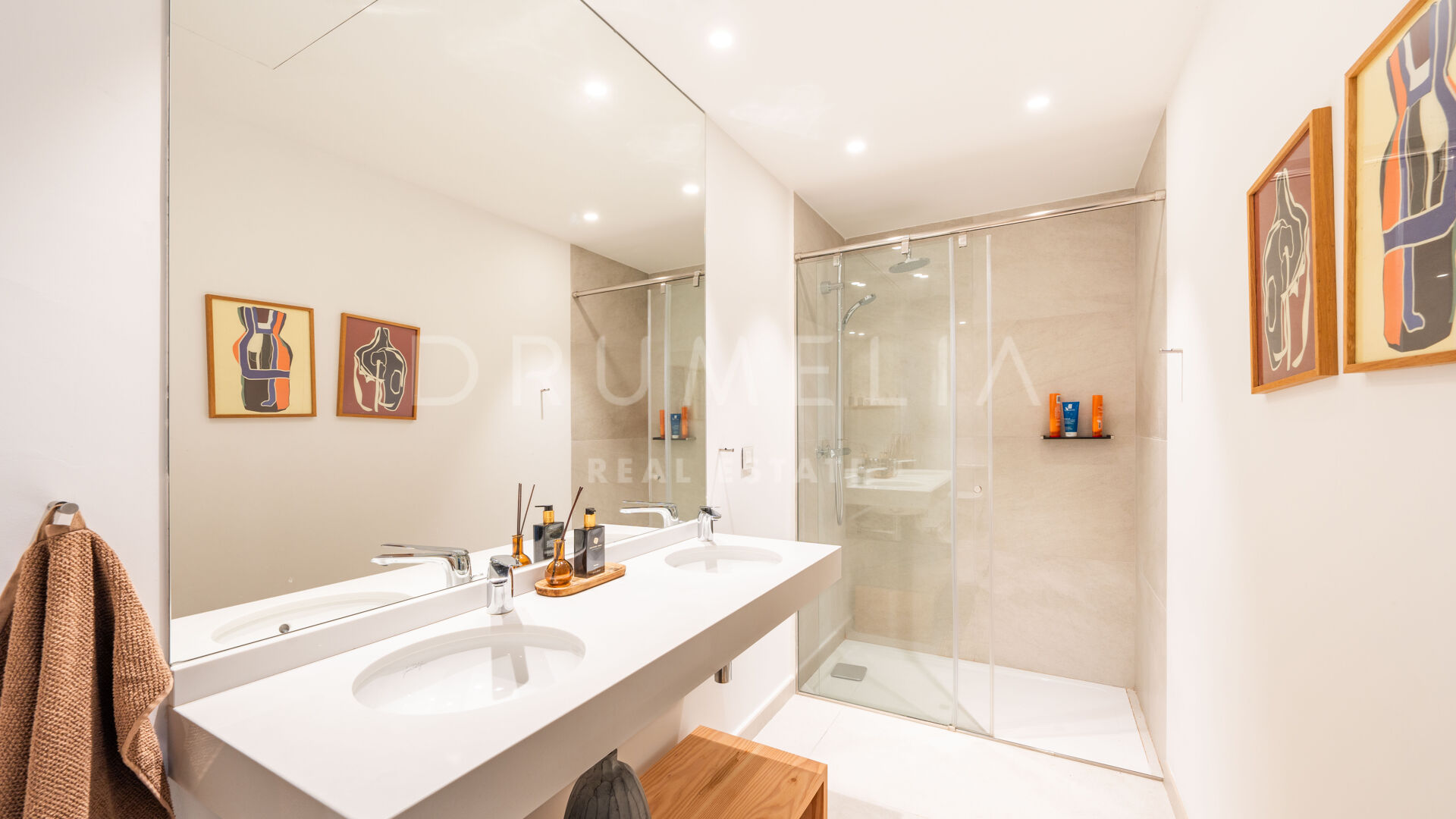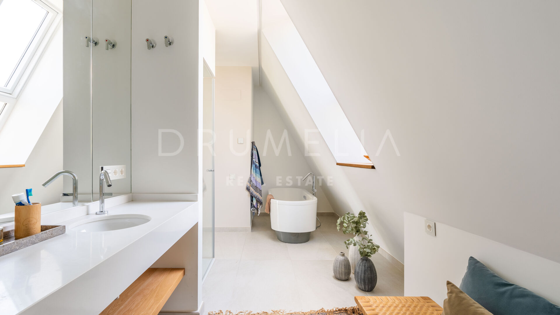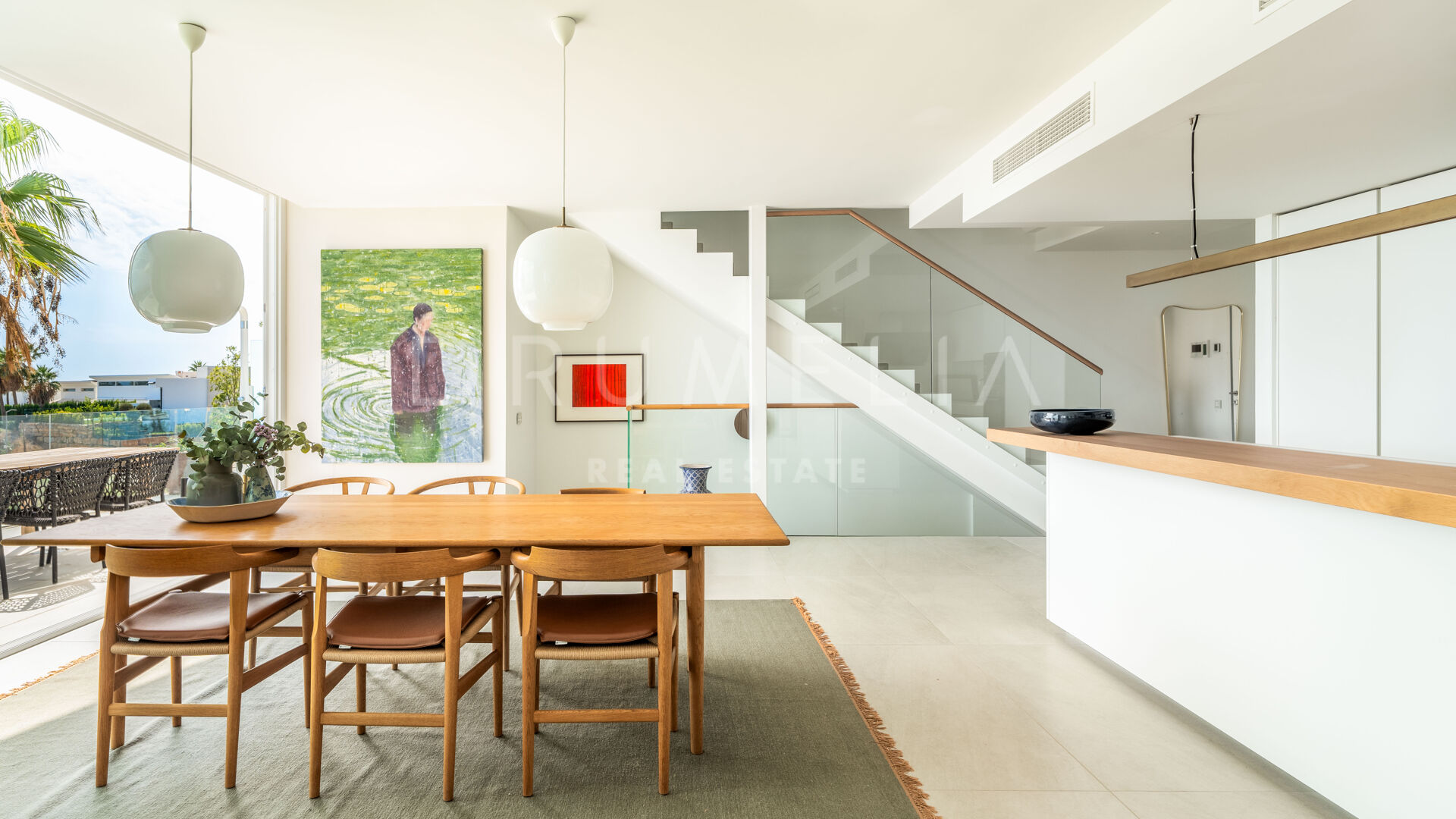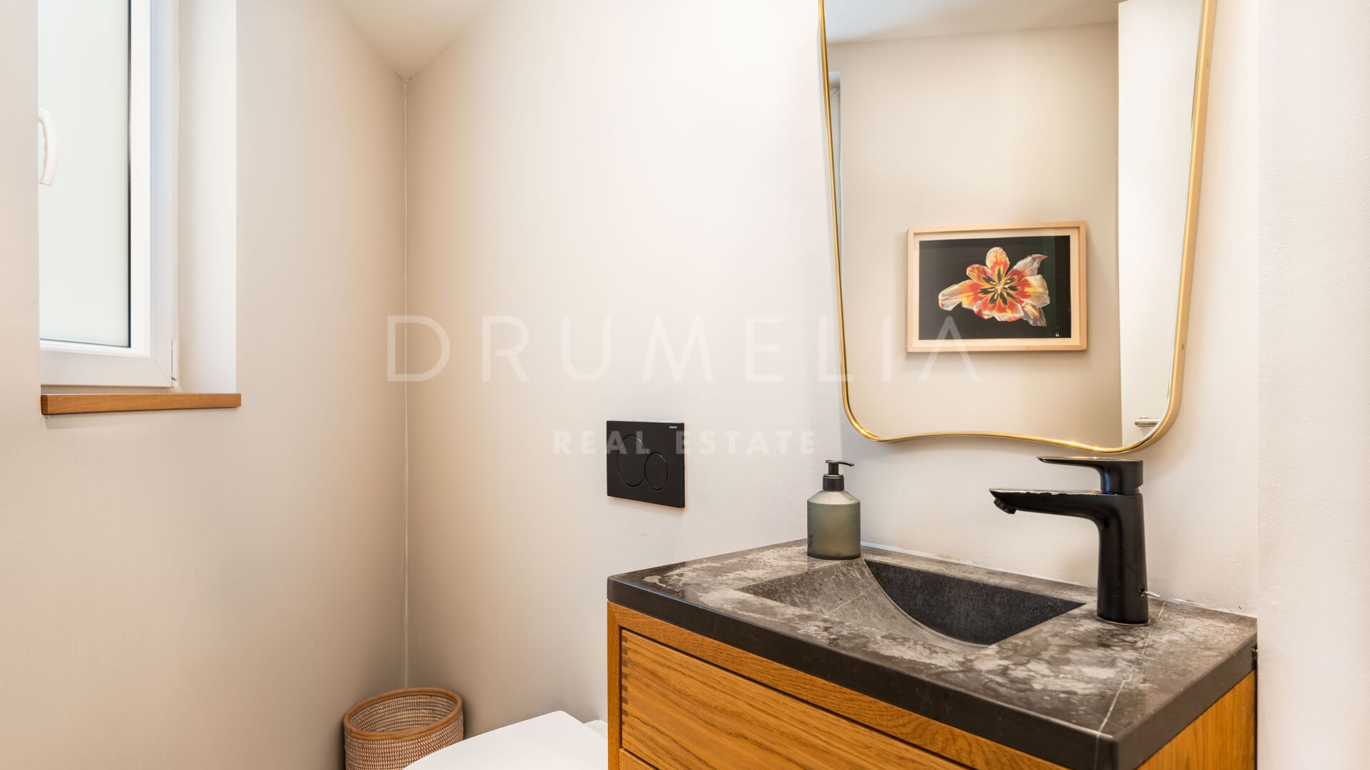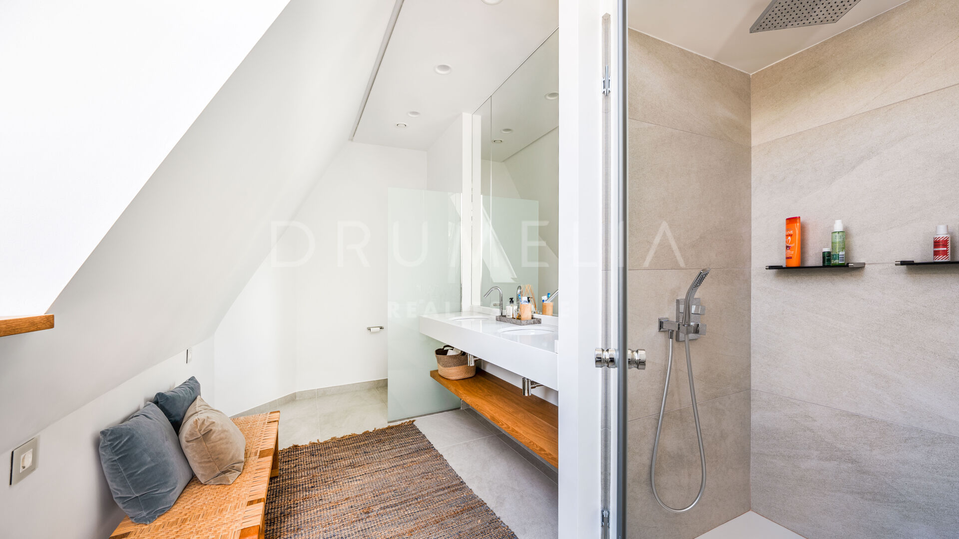 Das Haus verfügt über das Erdgeschoss, die mittlere und obere Etage, 5 Schlafzimmer (3 mit Badezimmern en-suite), 4 Badezimmer und ein Gäste-WC, helle und geräumige Wohn- und Essbereiche, eine voll ausgestattete Küche, Hauswirtschafts-, Wasch- und Abstellräume, 2 Parkplätze in der Garage. Die Glastüren führen auf den Balkon, überdachte und sonnige Terrassen, ideal zum Entspannen, Sonnenbaden, Essen im Freien und Grillen mit Freunden und Familie. Ein privater kleiner Garten mit einem automatischen Bewässerungssystem verfügt über einen Salzwasser-Infinity-Swimmingpool. Die Immobilie befindet sich in einem ausgezeichneten Zustand und ist geschmackvoll eingerichtet mit Aufzug, Hausautomatisierungssystem, Klimaanlage, Fußbodenheizung im ganzen Haus, Einbauschränken, Grill, Internet – Wi-Fi, Wassertank, Doppelverglasung und vielen anderen Merkmalen. Der Sicherheitseingang der bewachten Wohnanlage, der 24-Stunden-Sicherheitsdienst und die Alarmanlage sorgen für Ihren Seelenfrieden. Ein privilegierter Ort, um an der Costa del Sol luxuriöses Leben, Freizeit, Kultur und Gastronomie zu genießen und den wahren andalusischen Charakter zu erleben!
