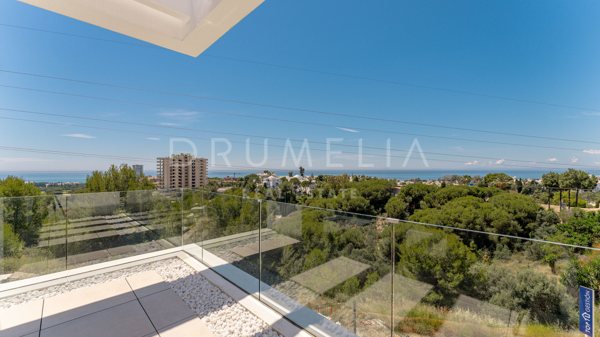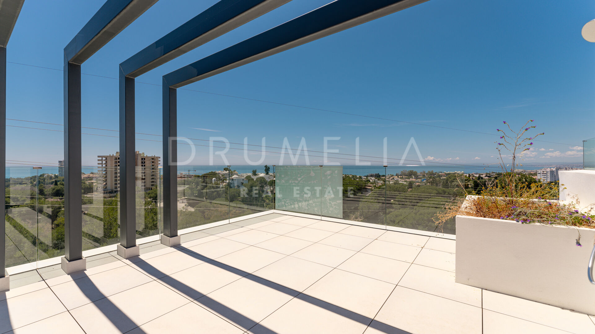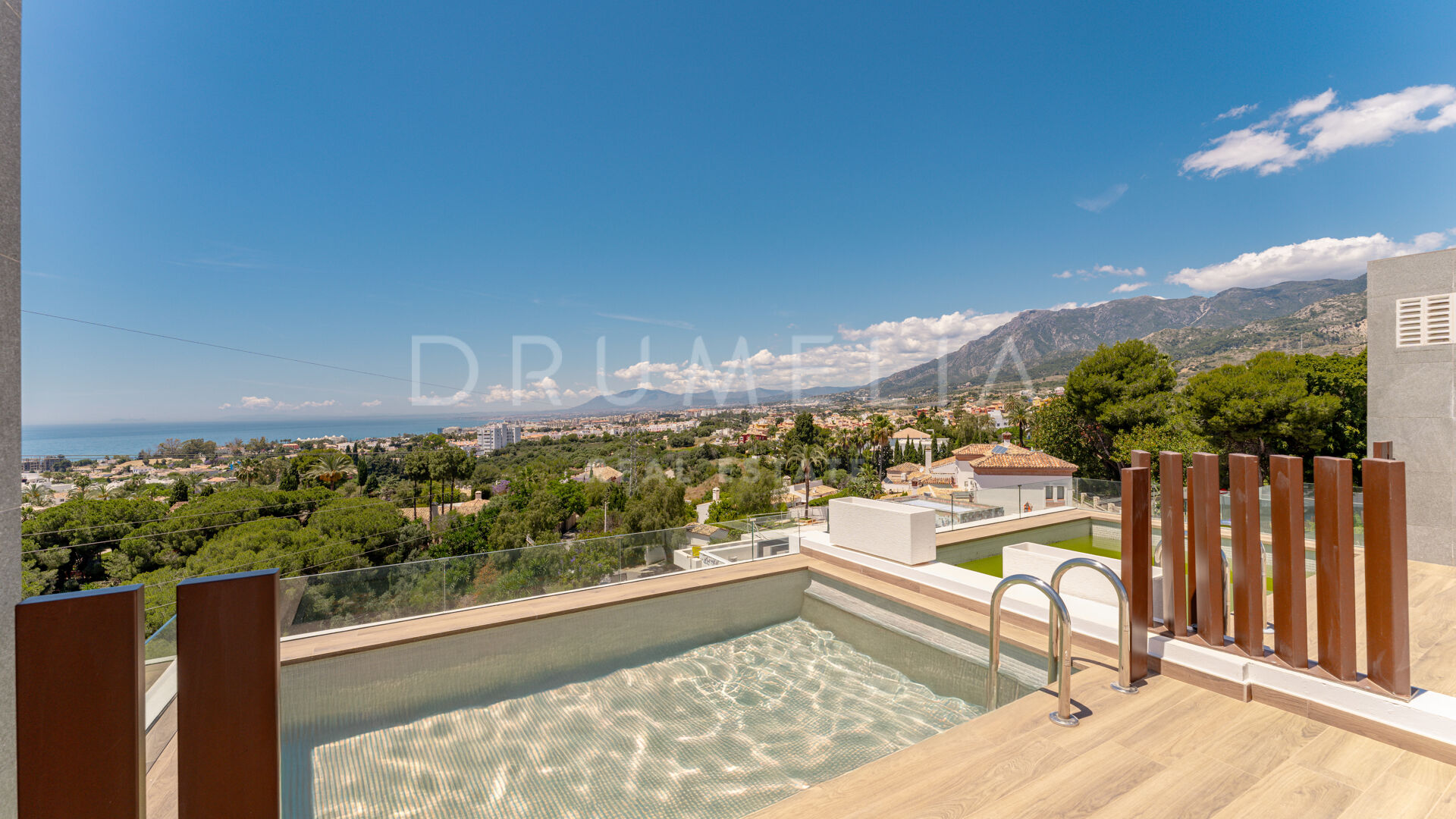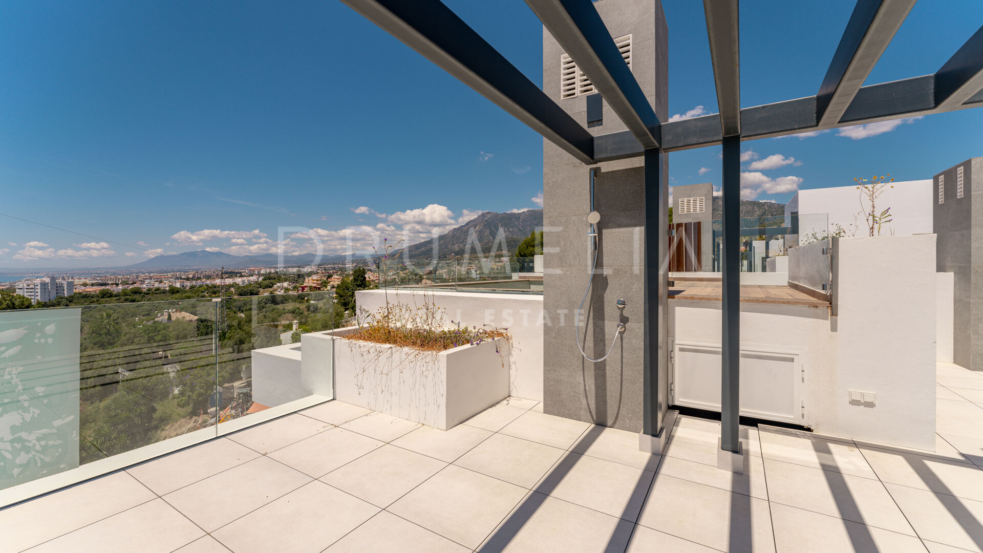 Das private Dachterrassen-Solarium bietet einen atemberaubenden Blick auf das Mittelmeer und die umliegenden Hügel. Die Dachterrasse verfügt außerdem über einen eigenen Pool – perfekt zum Genießen der Sonne und der Aussicht.