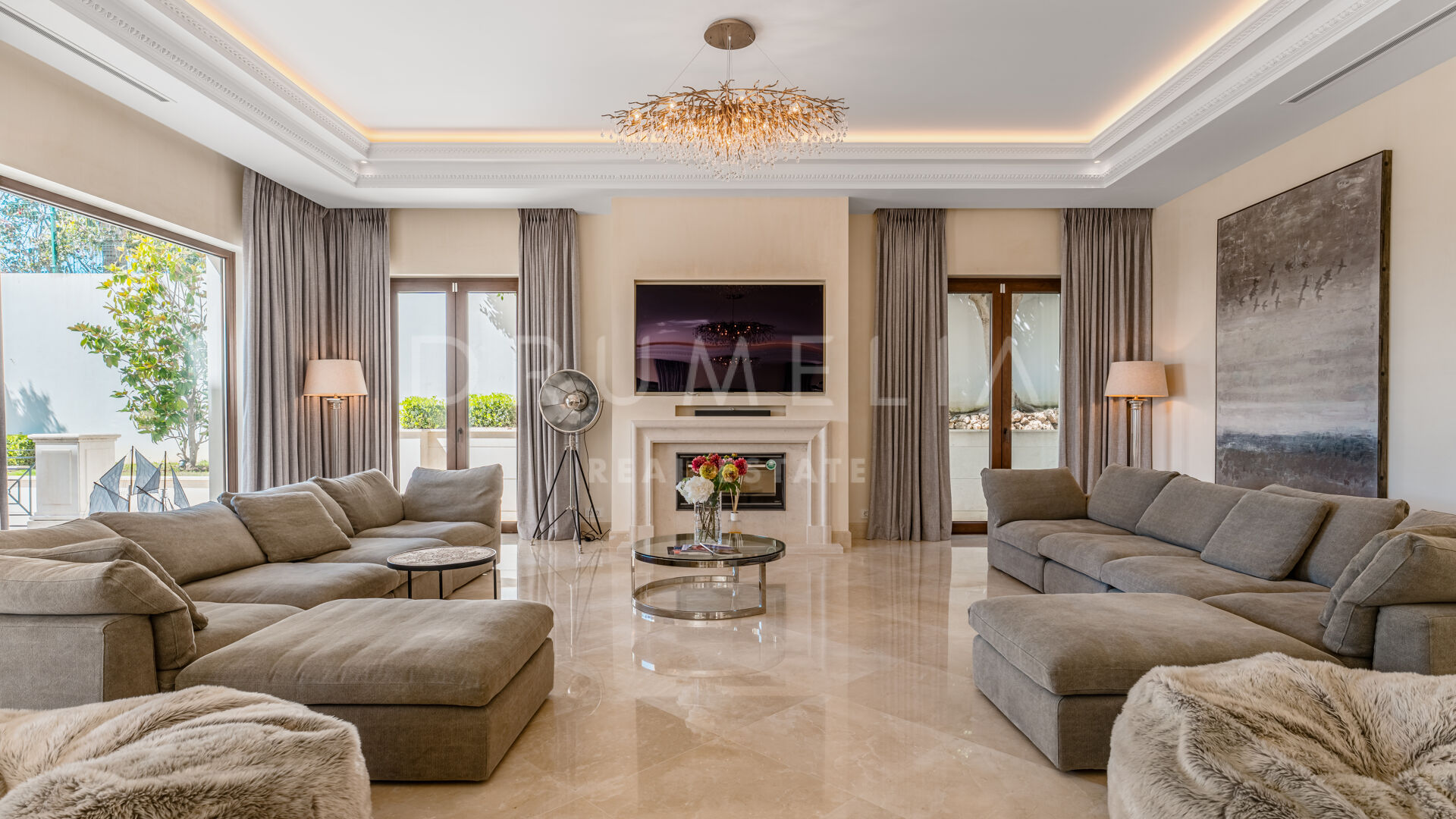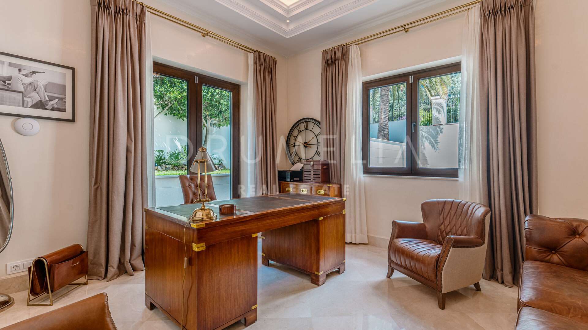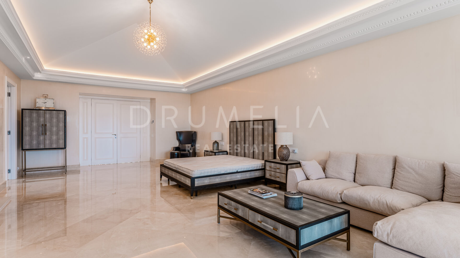 Eine große Eingangshalle aus Marmor setzt einen opulenten Akzent und führt zu geräumigen Wohnbereichen, die mit hohen Decken, aufwendigen Zierleisten und exquisiten Oberflächen ausgestattet sind. Die Residenz verfügt über mehrere Unterhaltungs- und Entspannungsräume, darunter ein elegantes Büro mit klassischen Holzmöbeln und einem gemütlichen Vintage-Ambiente.