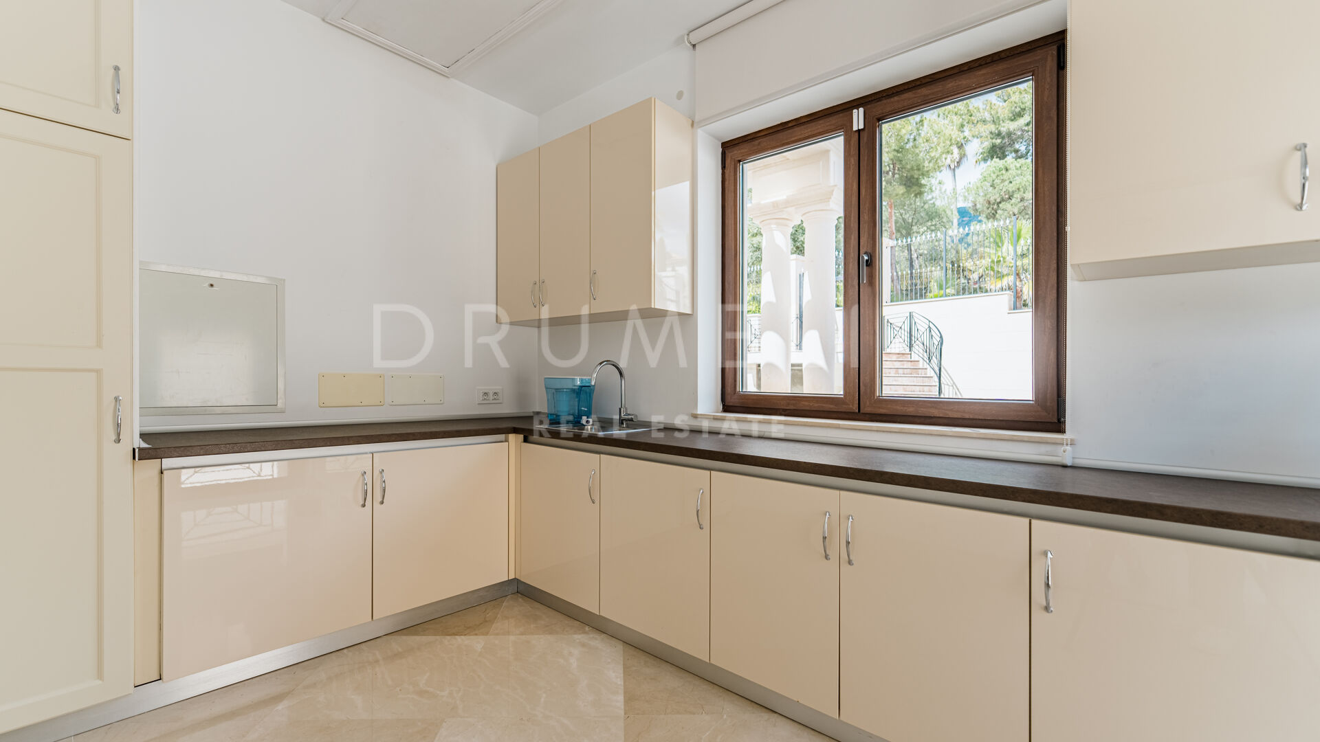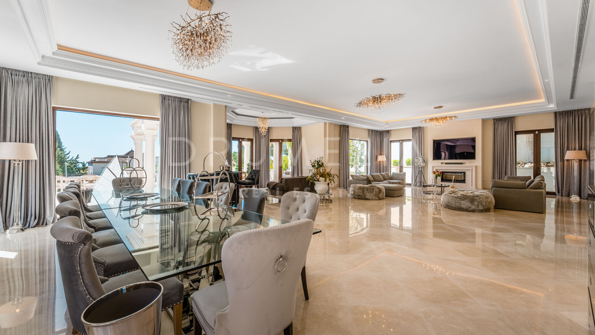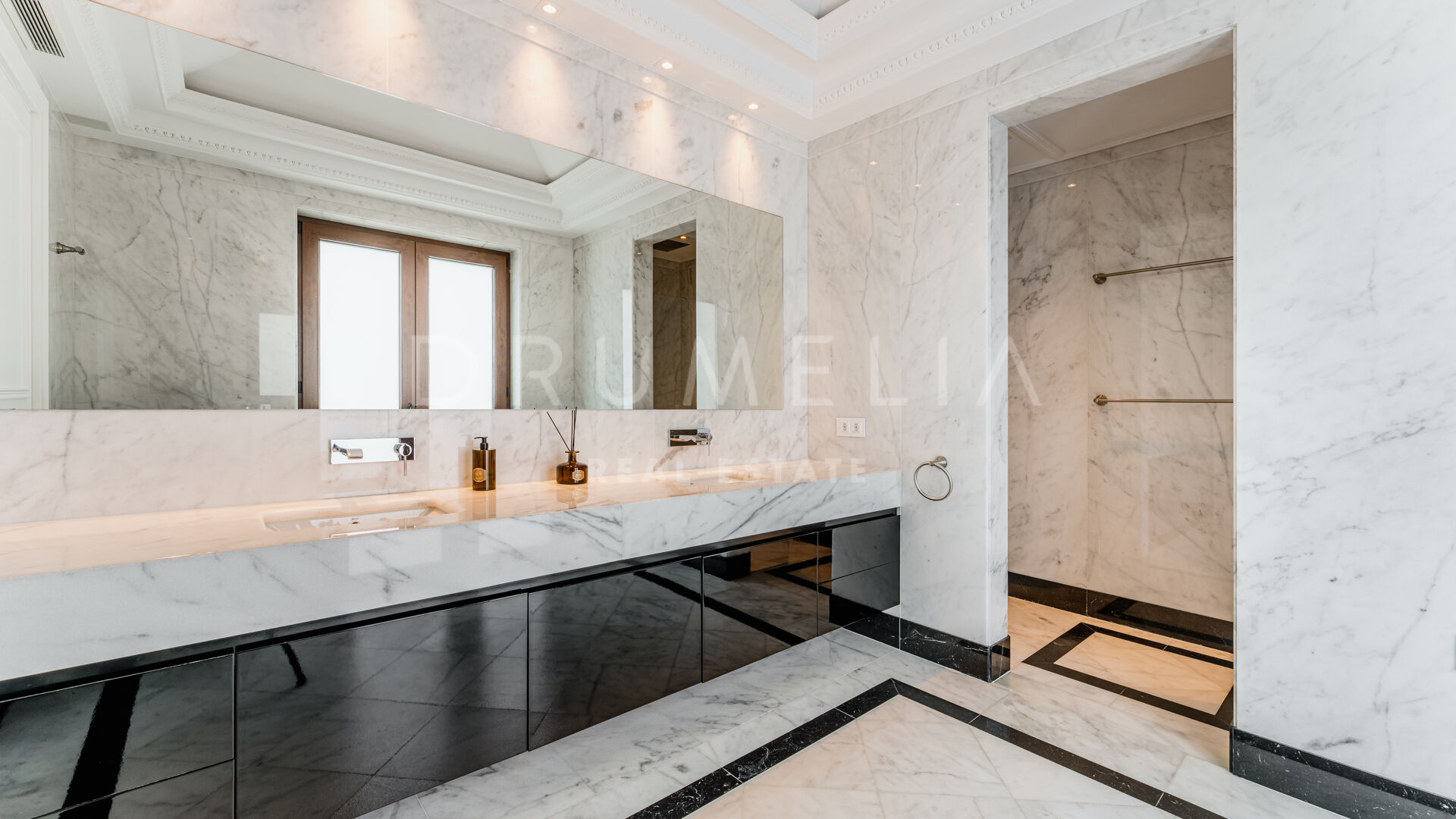 Eine große Eingangshalle aus Marmor setzt einen opulenten Akzent und führt zu geräumigen Wohnbereichen, die mit hohen Decken, aufwendigen Zierleisten und exquisiten Oberflächen ausgestattet sind. Die Residenz verfügt über mehrere Unterhaltungs- und Entspannungsräume, darunter ein elegantes Büro mit klassischen Holzmöbeln und einem gemütlichen Vintage-Ambiente.