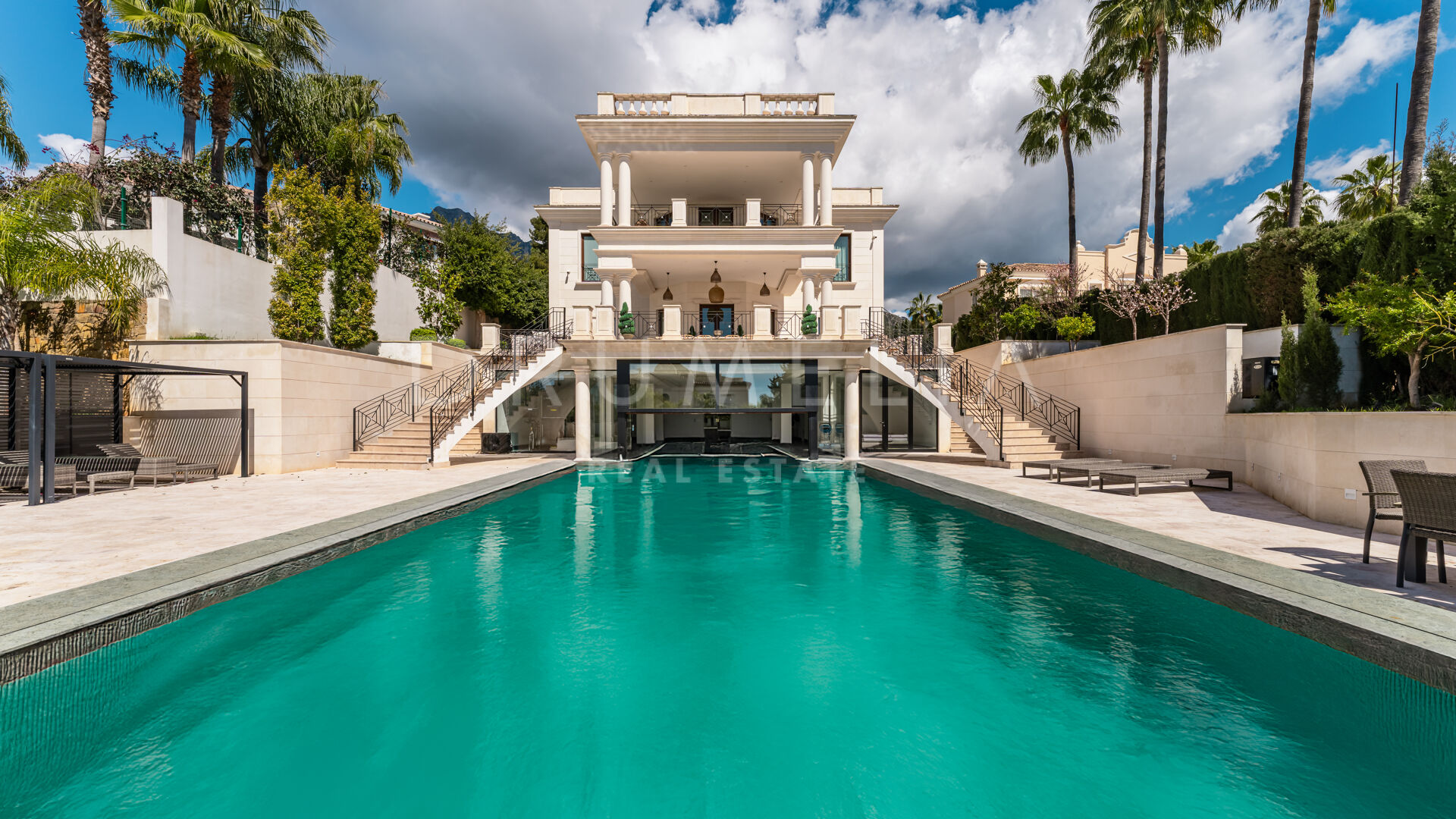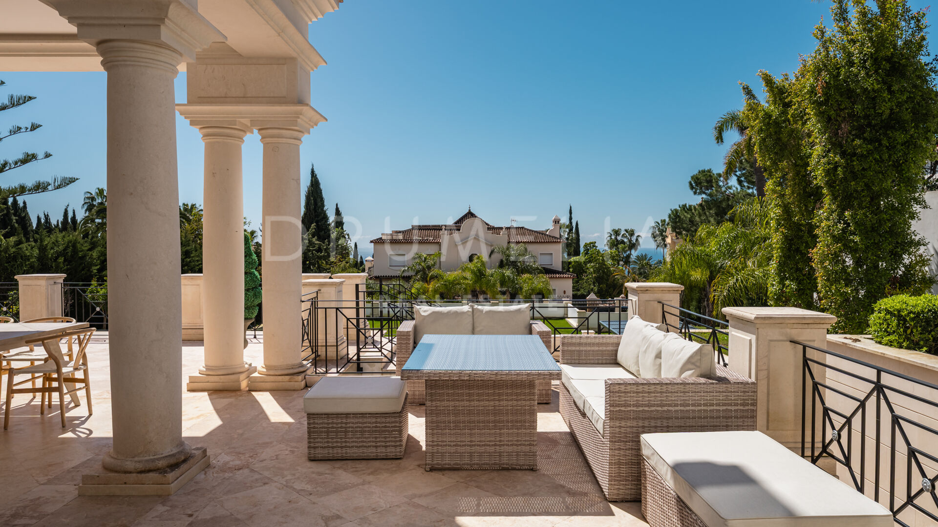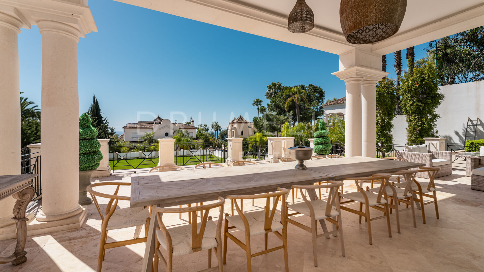 Der Luxus erstreckt sich über die Wohnräume hinaus und umfasst einen beheizten Salzwasser-Innen- und Außenpool, ein voll ausgestattetes Fitnessstudio und einen ruhigen Wellnessbereich. Zu den Außenbereichen gehören eine wunderschön gestaltete Terrasse mit klassischen Säulen, ein großer Essbereich im Freien und gepflegte Gärten.