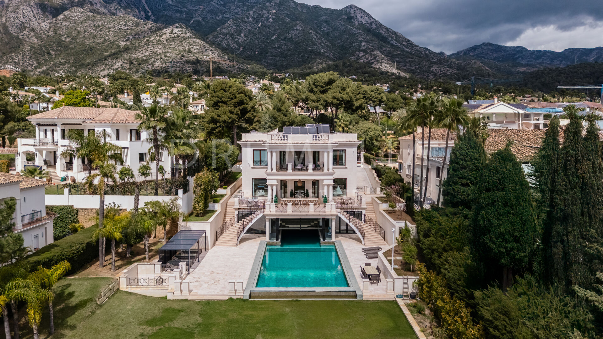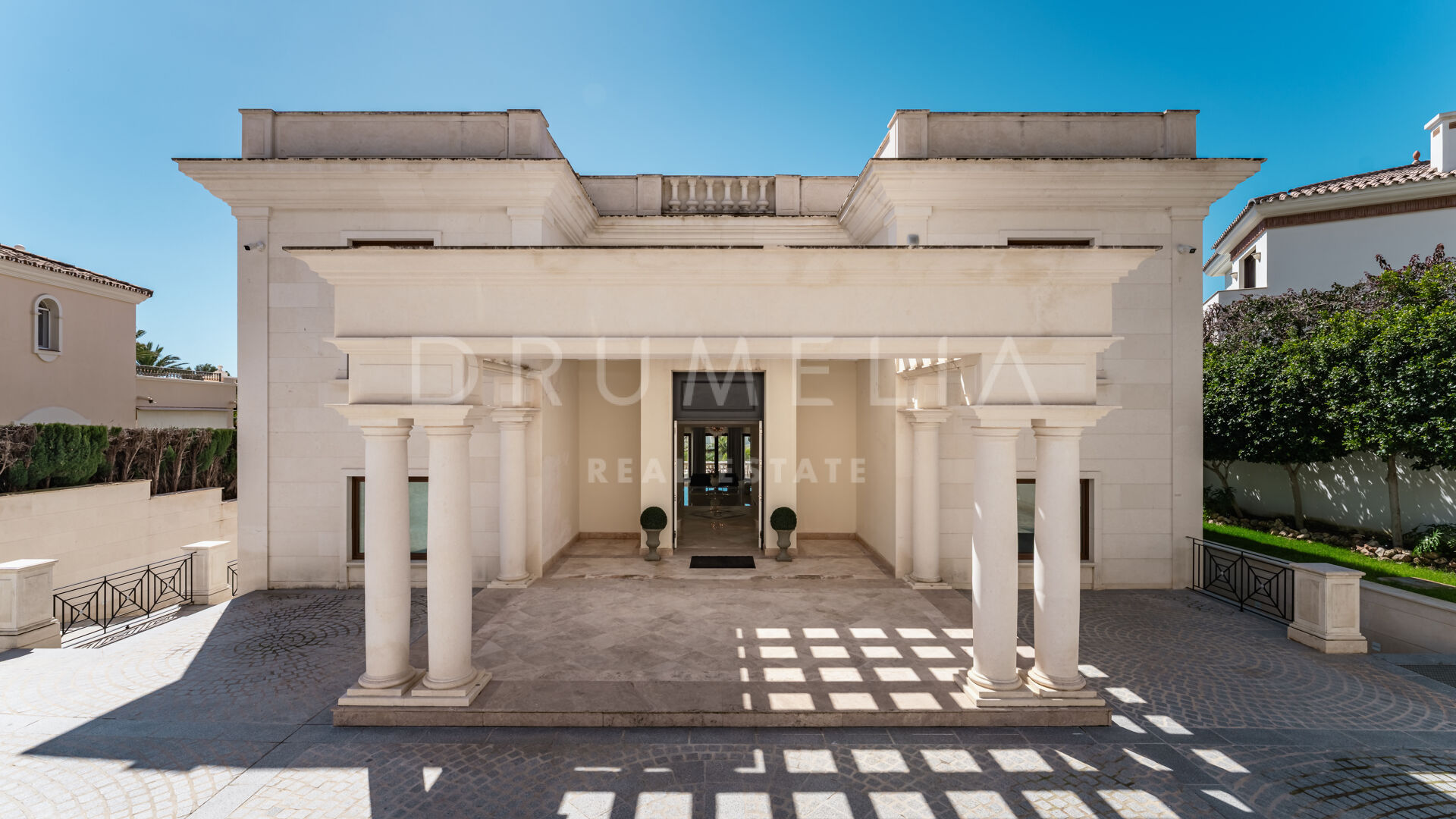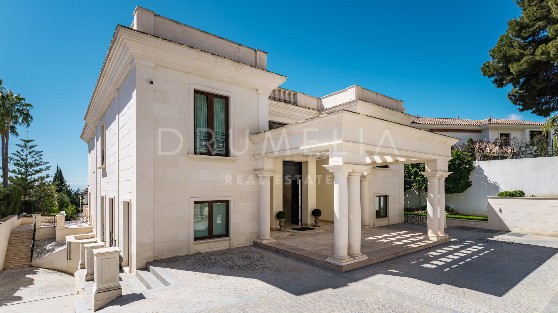 Der Luxus erstreckt sich über die Wohnräume hinaus und umfasst einen beheizten Salzwasser-Innen- und Außenpool, ein voll ausgestattetes Fitnessstudio und einen ruhigen Wellnessbereich. Zu den Außenbereichen gehören eine wunderschön gestaltete Terrasse mit klassischen Säulen, ein großer Essbereich im Freien und gepflegte Gärten.