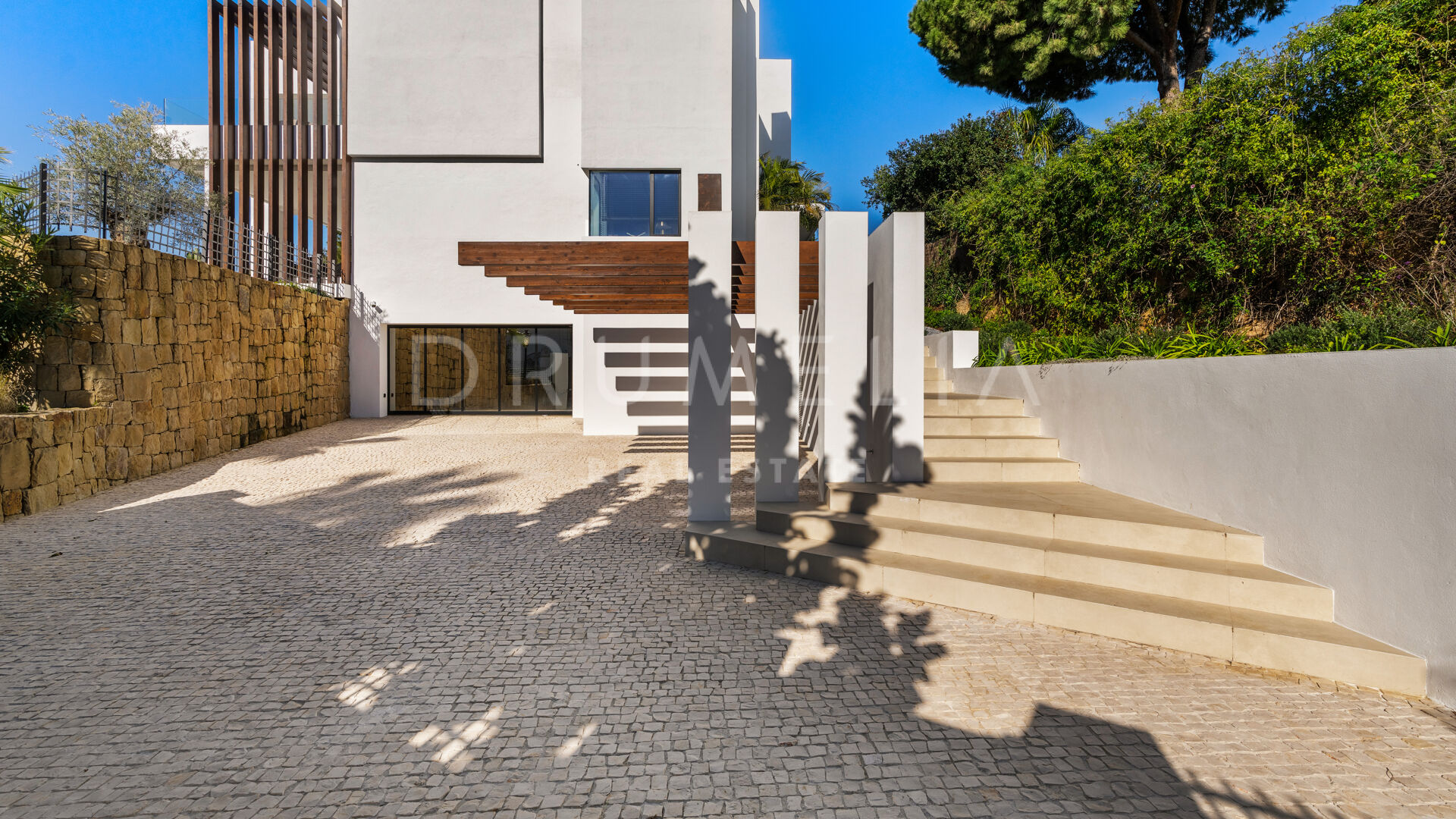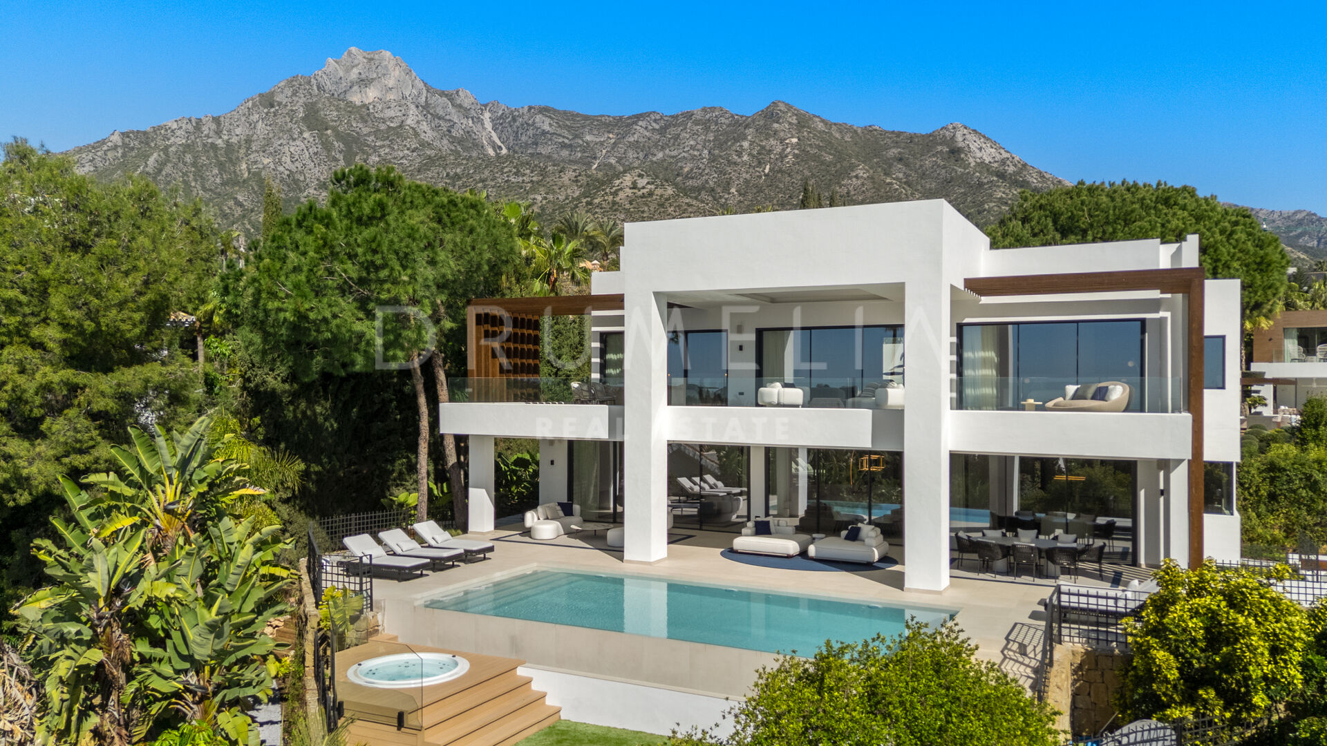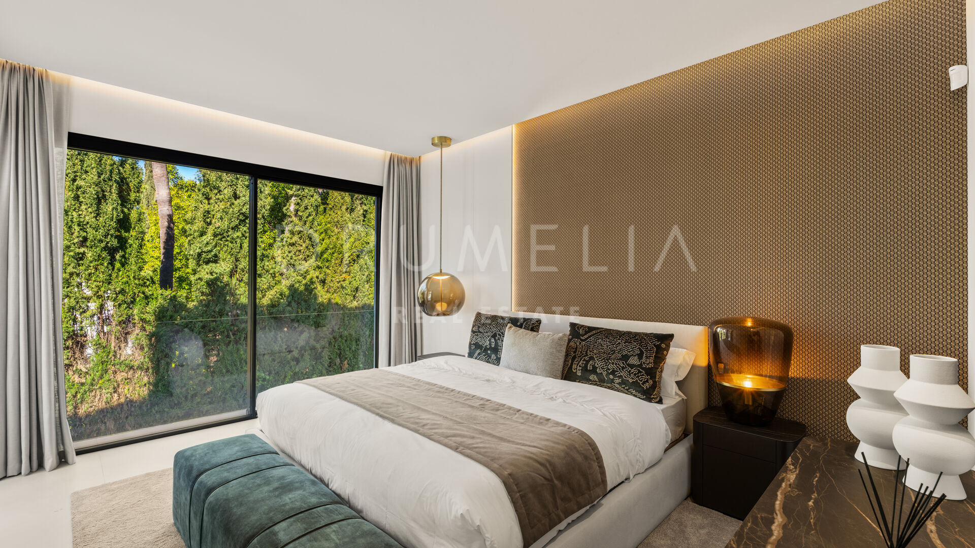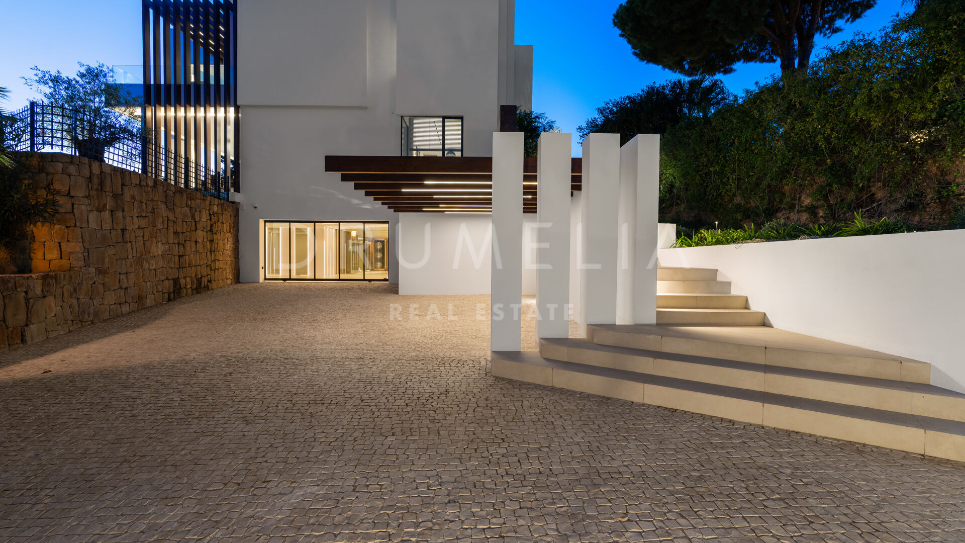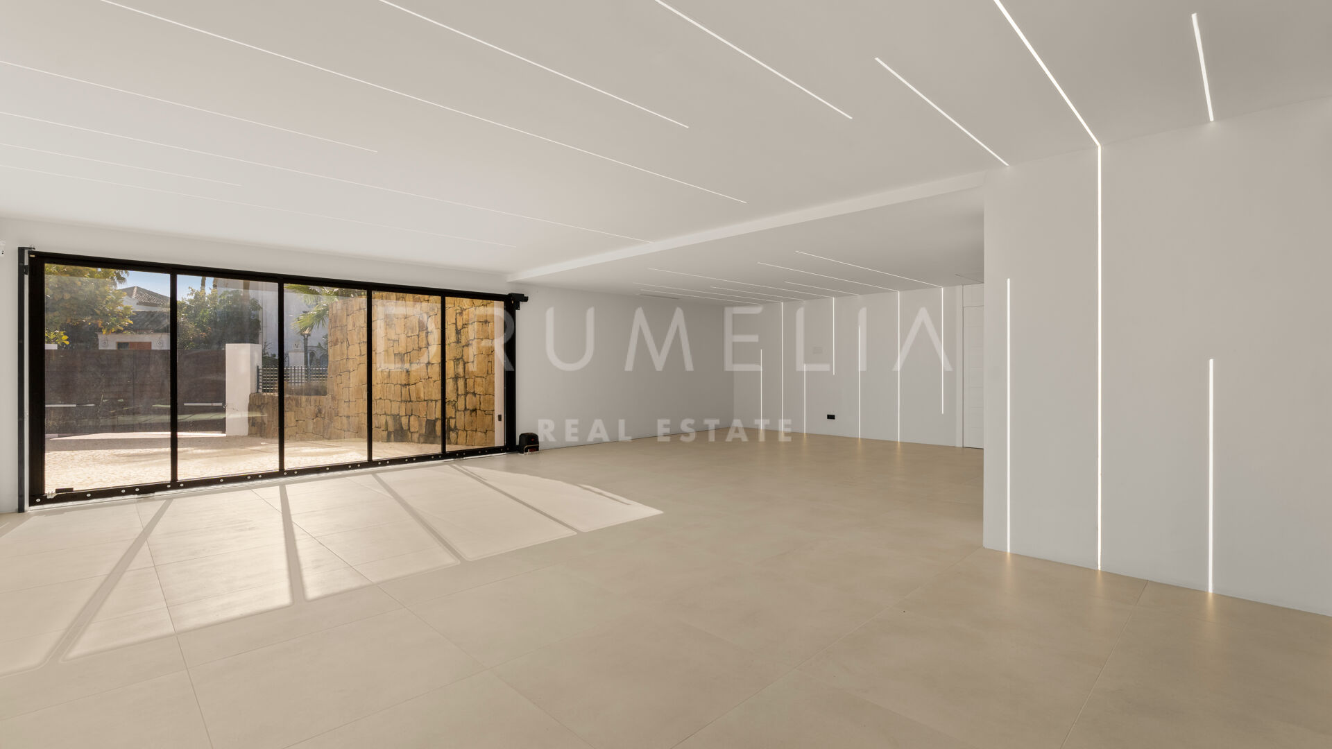 Die 2025 vollständig renovierte Immobilie besticht durch klare Linien, offene Räume und einen harmonischen Übergang zwischen Innen- und Außenbereichen. Der neue Eingang an der Rossini-Straße empfängt Besucher mit üppigen Gärten und einem dekorativen Wasserfall, während der ursprüngliche Zugang an der Sibelius-Straße ideal für Personal oder Gäste bleibt.